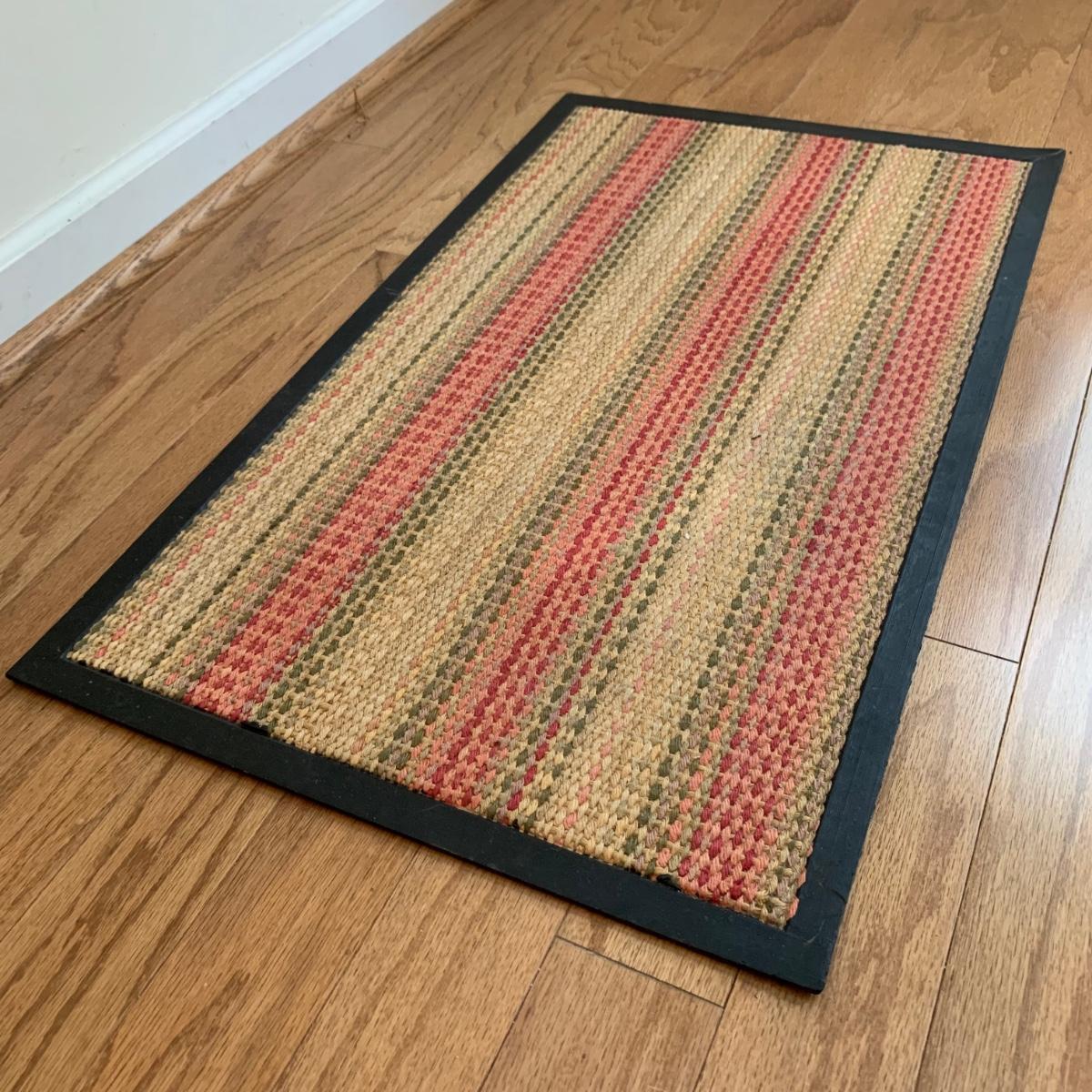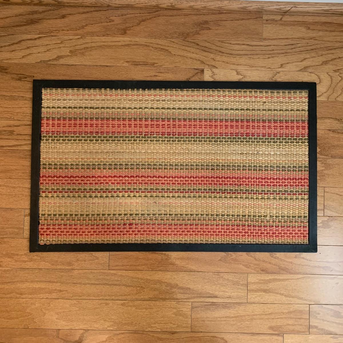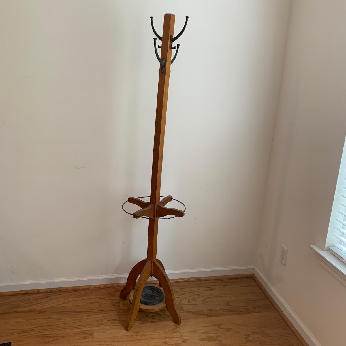 The coat rack is an H. T. Cushman brand wooden rack with metal hooks and metal accents around the umbrella stand. The bottom metal umbrella rest is removable. It is in used, but good and sturdy condition. The coat rack is 68” tall. The rectangular floor mat floor mat has a stiff woven inner part with a black rubber border. It measures 29.25” x 17.5”. Local pickup only.
