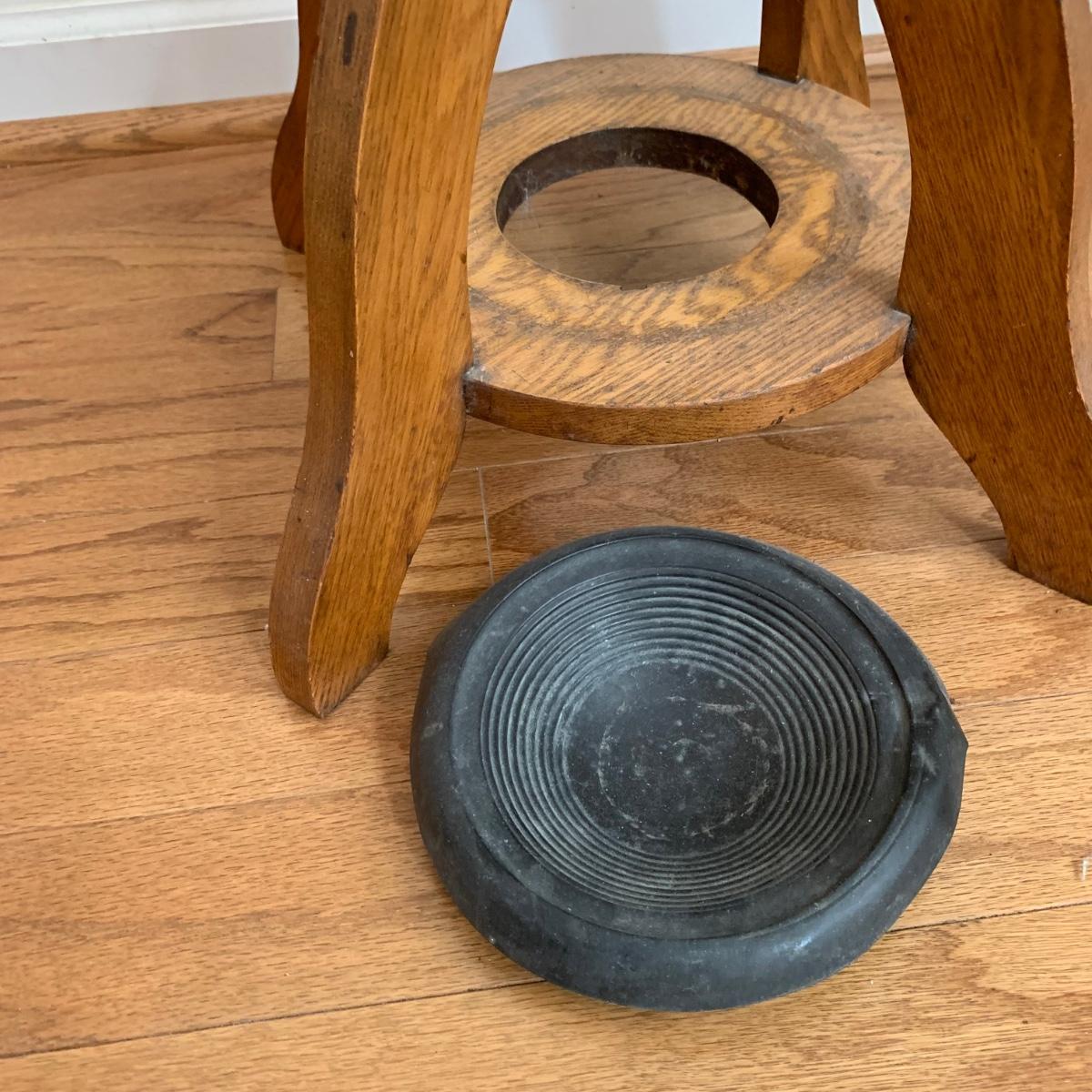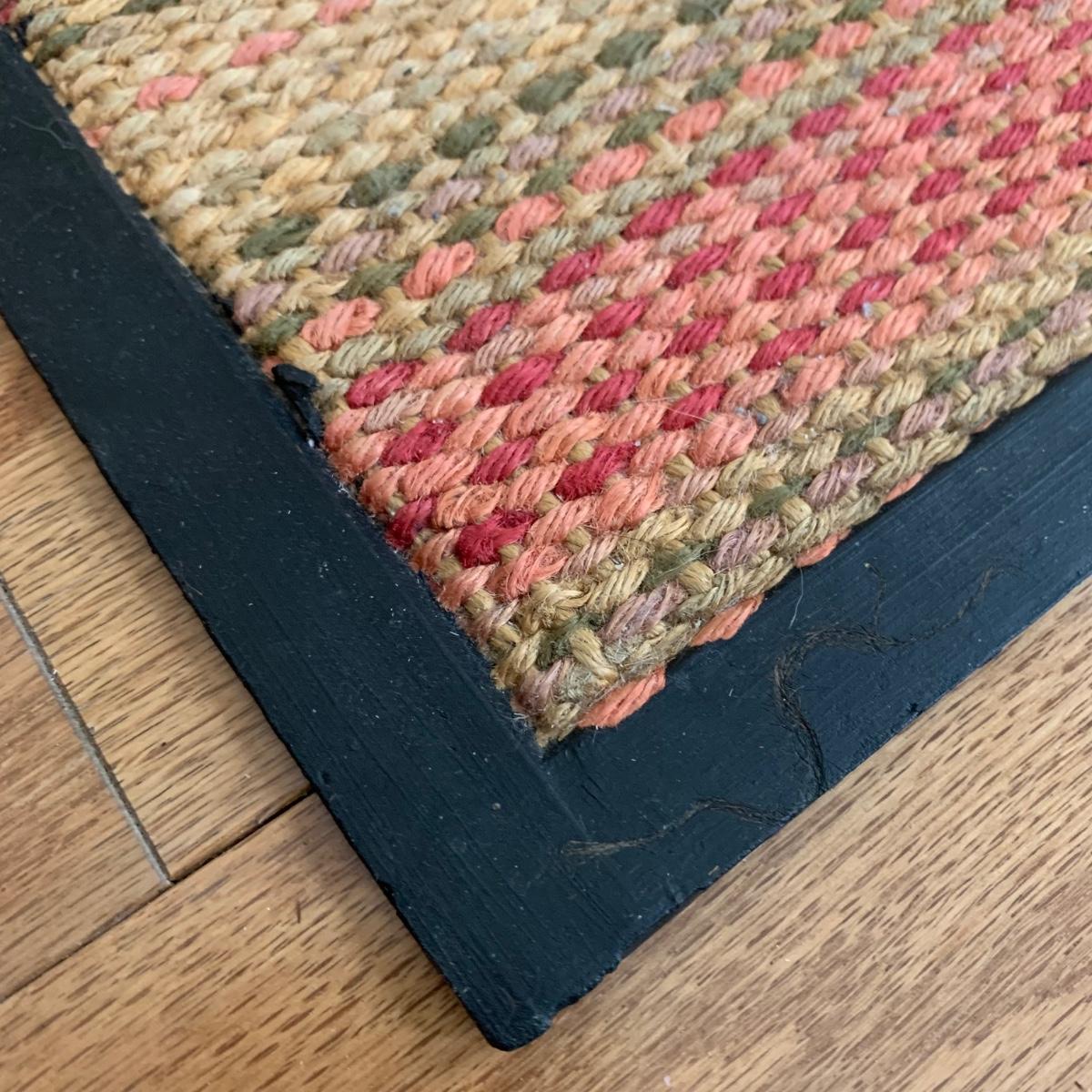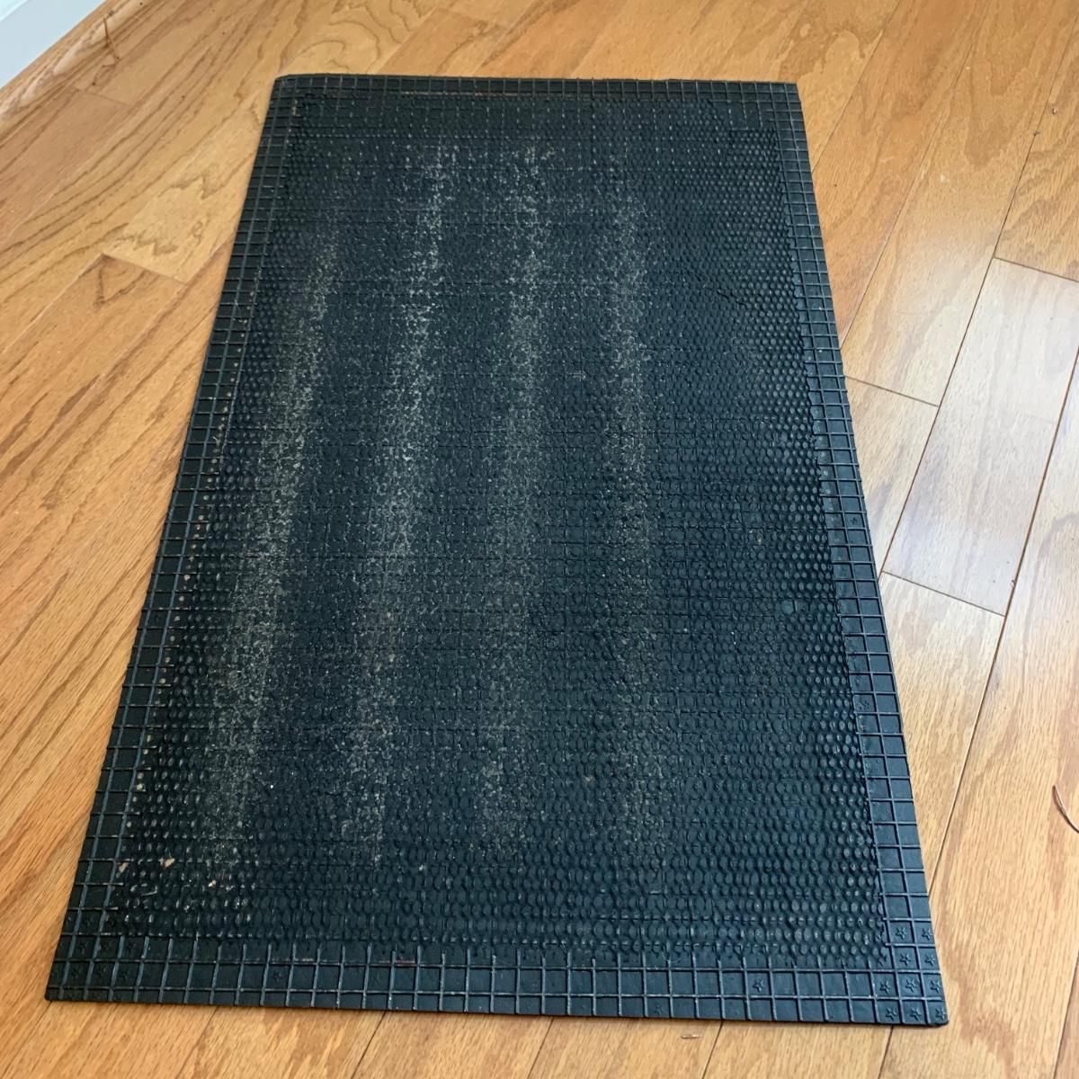 The coat rack is an H. T. Cushman brand wooden rack with metal hooks and metal accents around the umbrella stand. The bottom metal umbrella rest is removable. It is in used, but good and sturdy condition. The coat rack is 68” tall. The rectangular floor mat floor mat has a stiff woven inner part with a black rubber border. It measures 29.25” x 17.5”. Local pickup only.