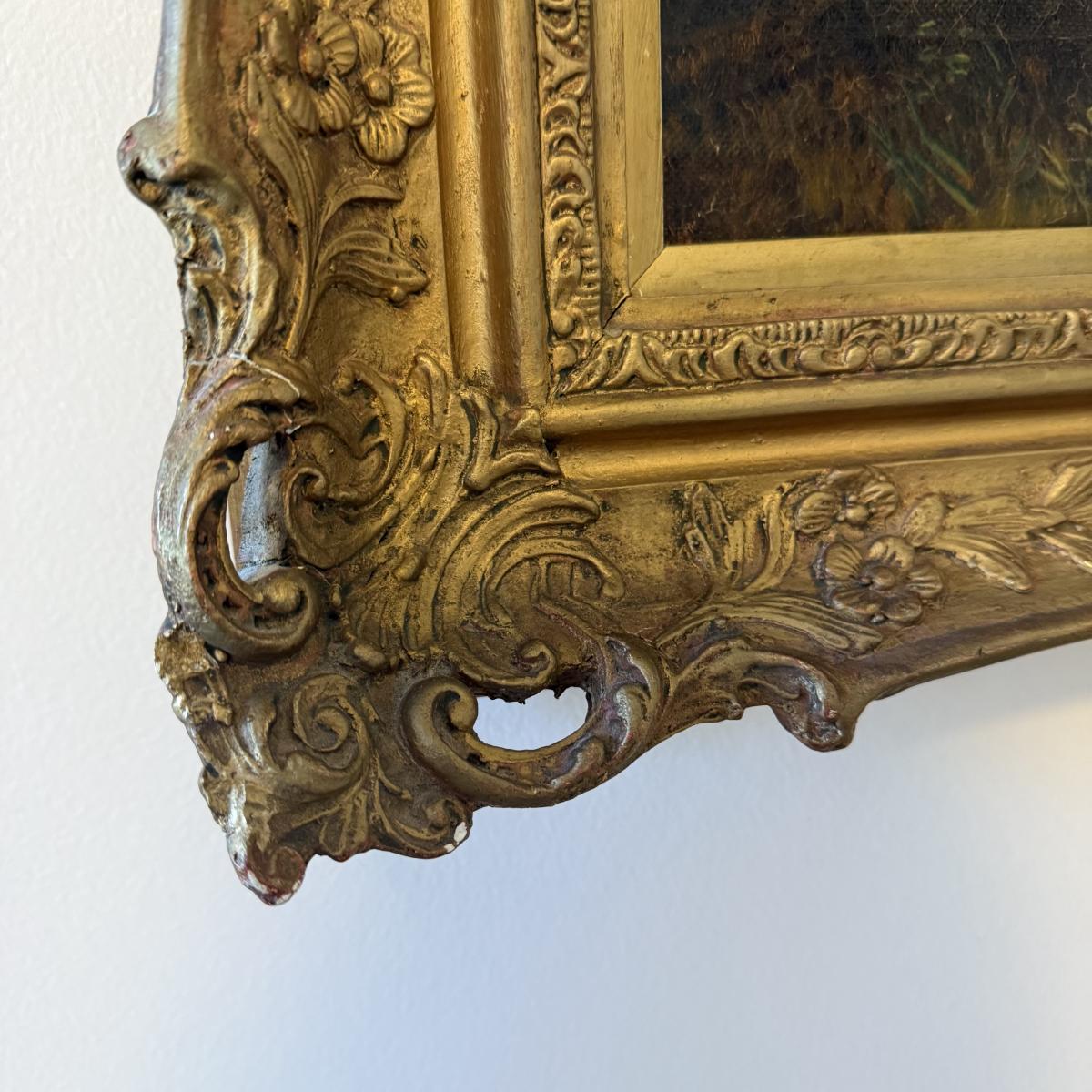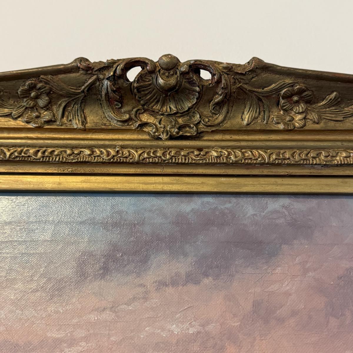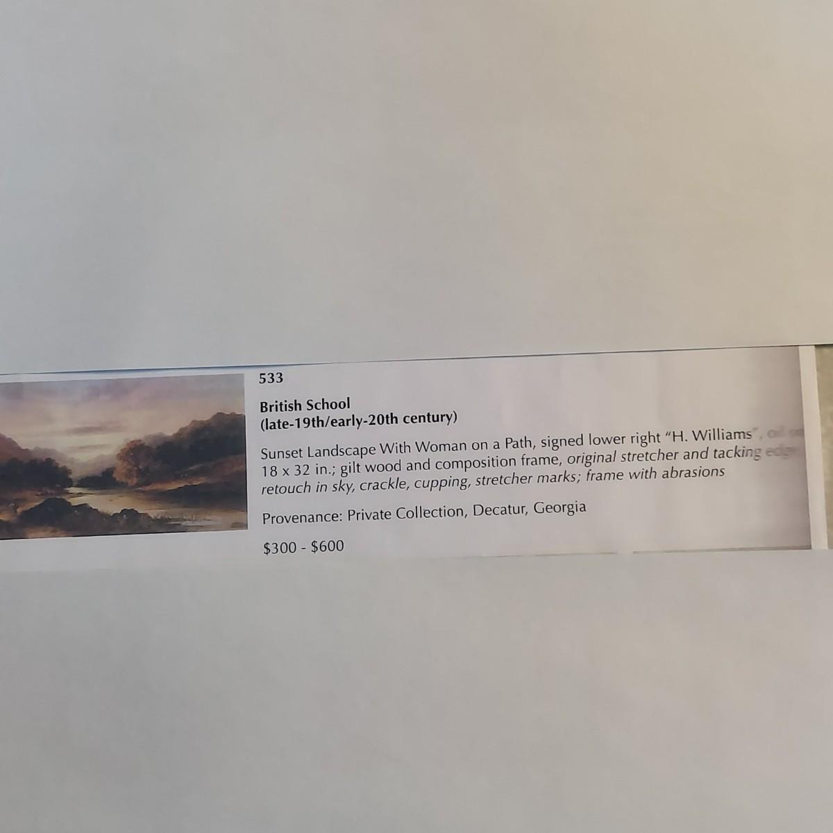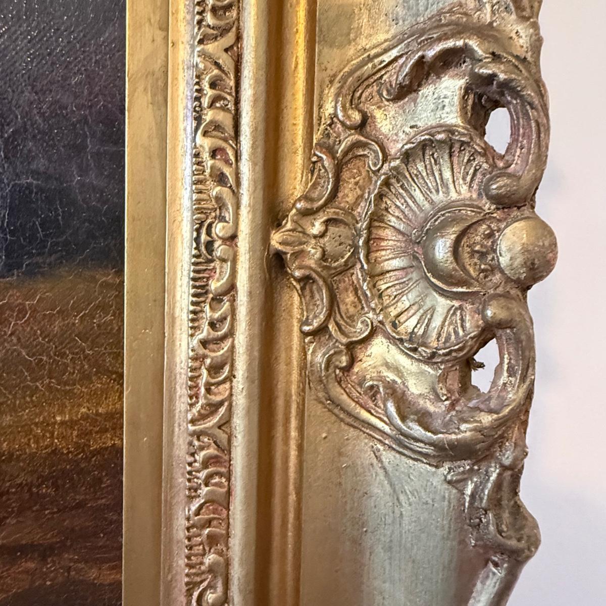 Original British School style oil painting signed H. Williams. Painting is framed without glass in an ornate gilded wooden frame that measures 38.5” x 24.75”H. The decorative corners could be made from a plaster-like material. Frame depth is approximately 3”. There are multiple cracks in the frame. Craquelure is seen in the paint. Please see photos for details.