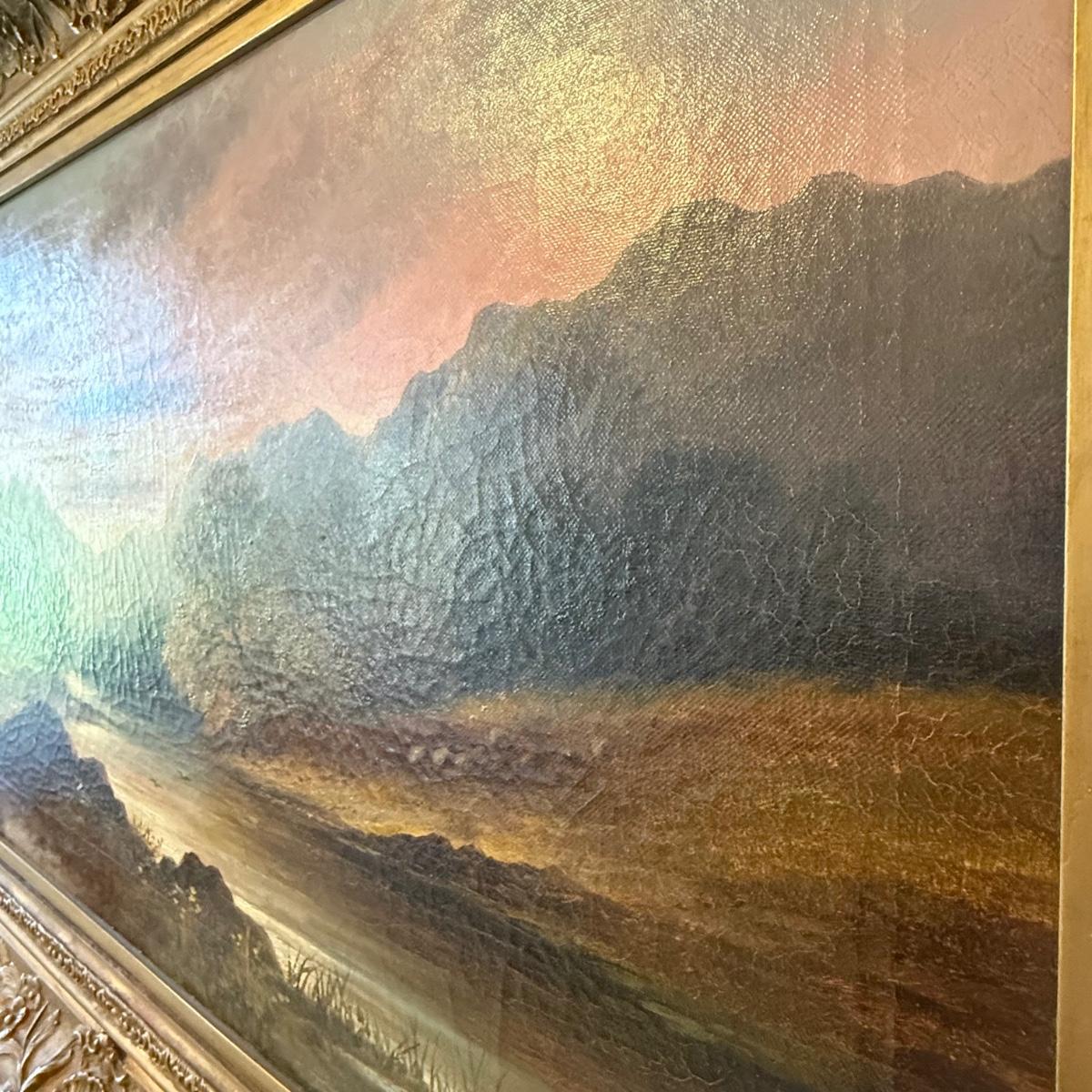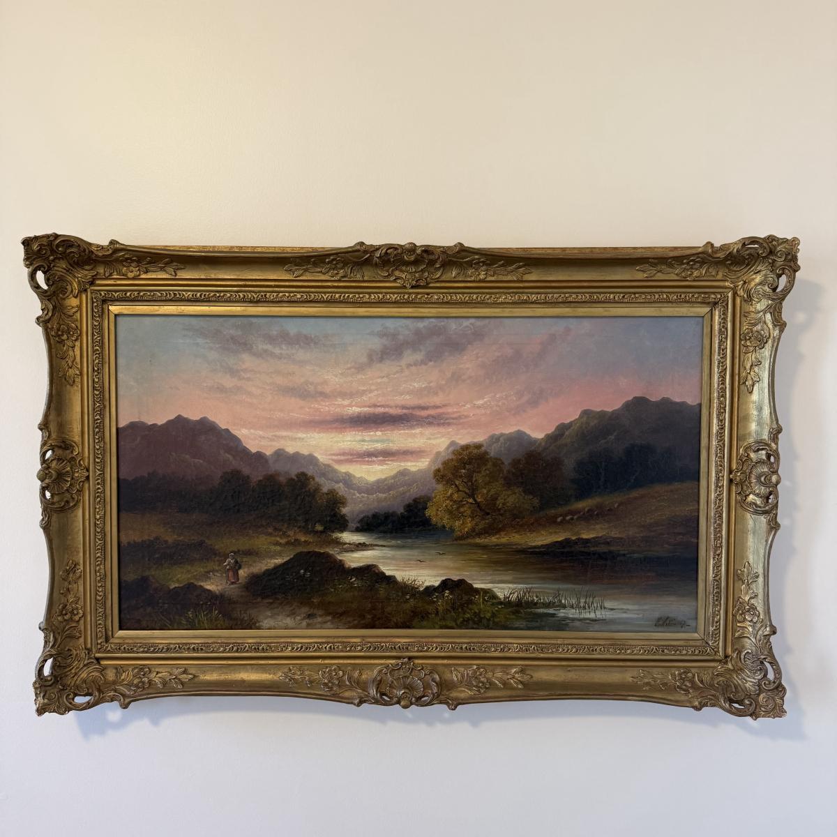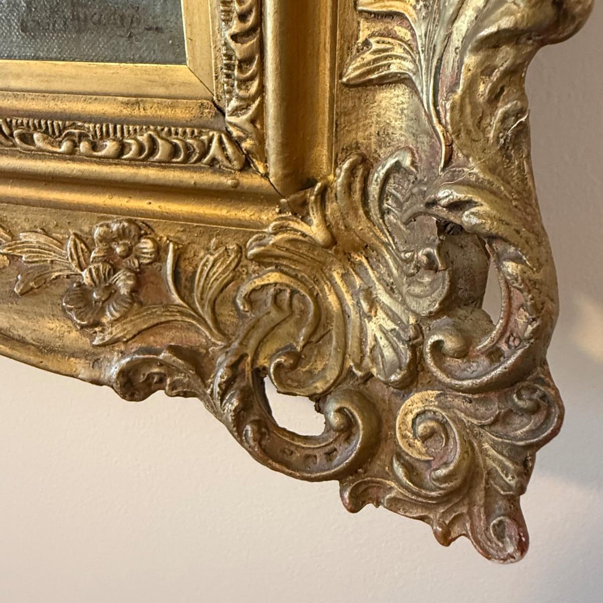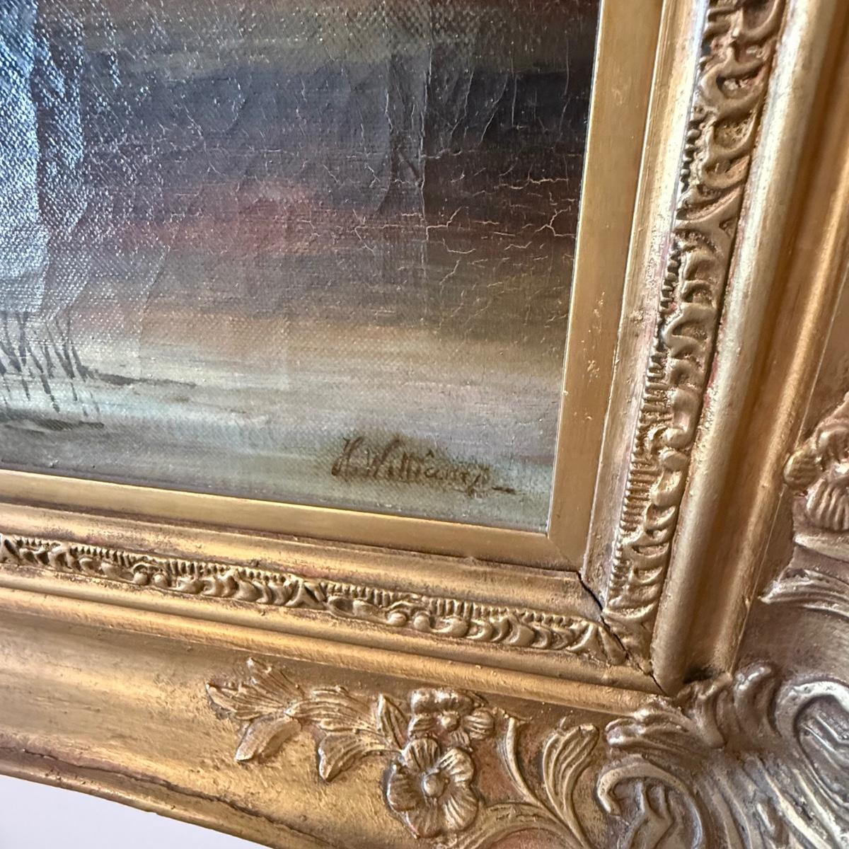 Original British School style oil painting signed H. Williams. Painting is framed without glass in an ornate gilded wooden frame that measures 38.5” x 24.75”H. The decorative corners could be made from a plaster-like material. Frame depth is approximately 3”. There are multiple cracks in the frame. Craquelure is seen in the paint. Please see photos for details.