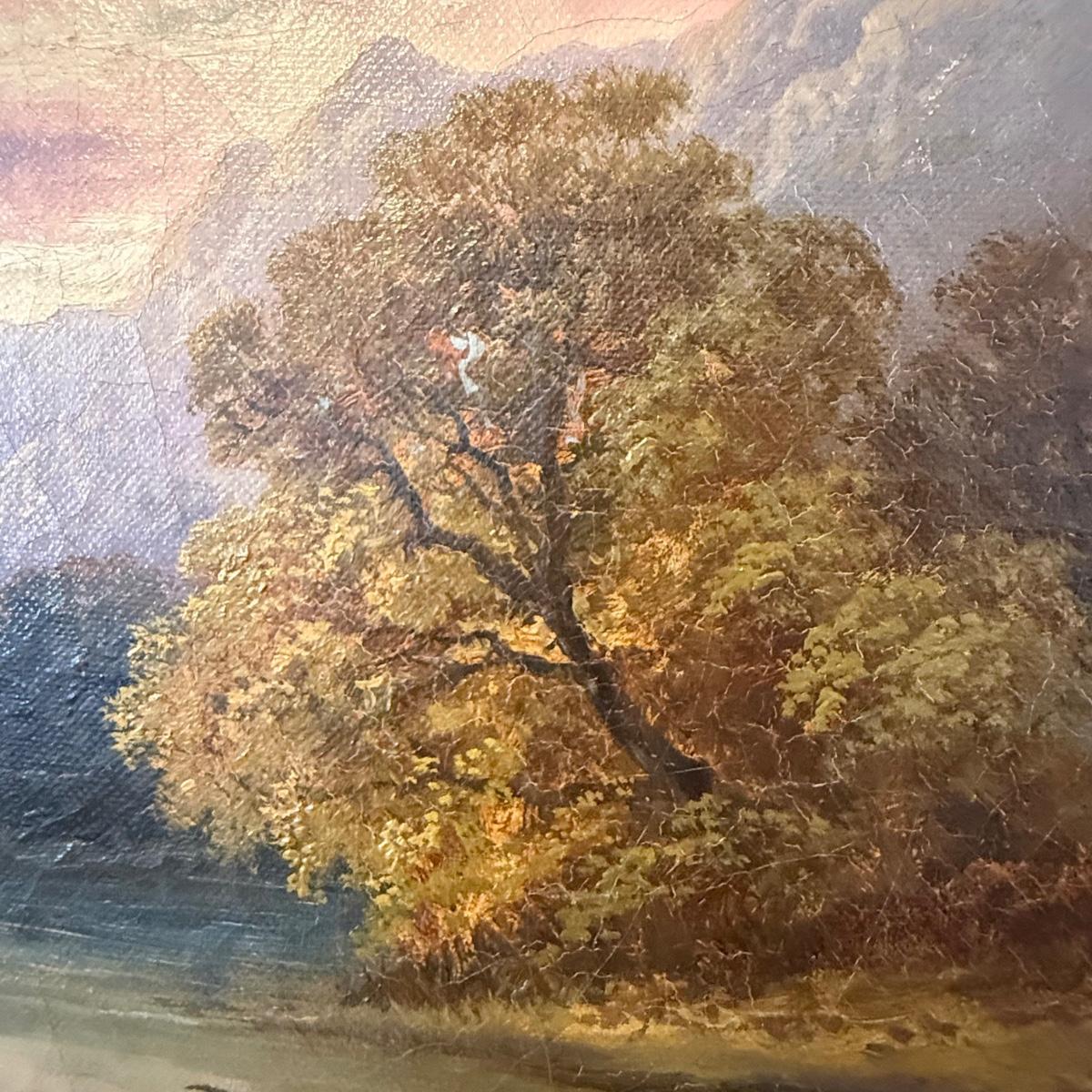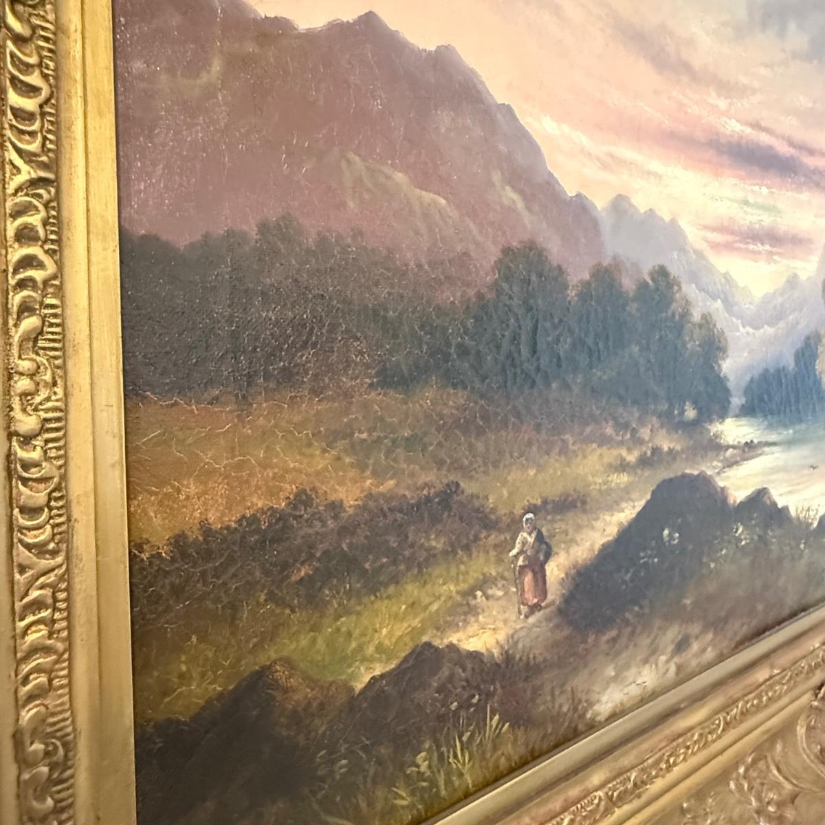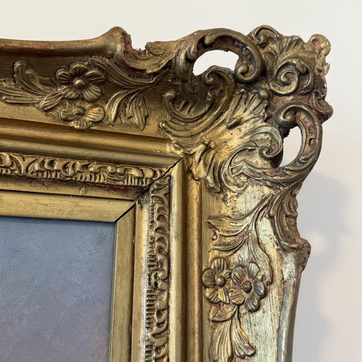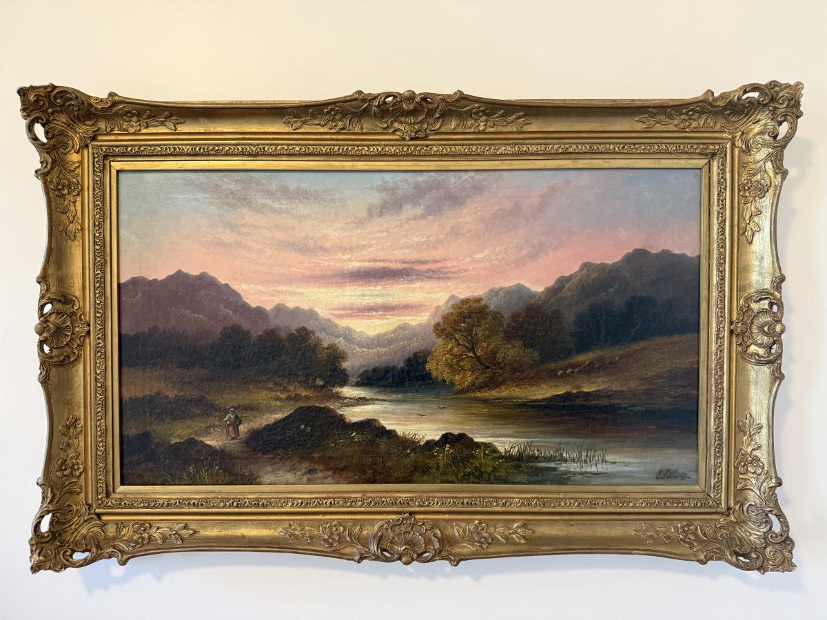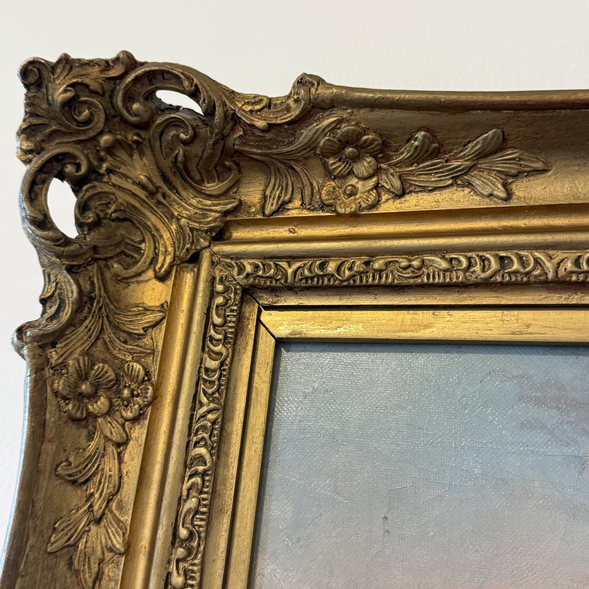 Original British School style oil painting signed H. Williams. Painting is framed without glass in an ornate gilded wooden frame that measures 38.5” x 24.75”H. The decorative corners could be made from a plaster-like material. Frame depth is approximately 3”. There are multiple cracks in the frame. Craquelure is seen in the paint. Please see photos for details.