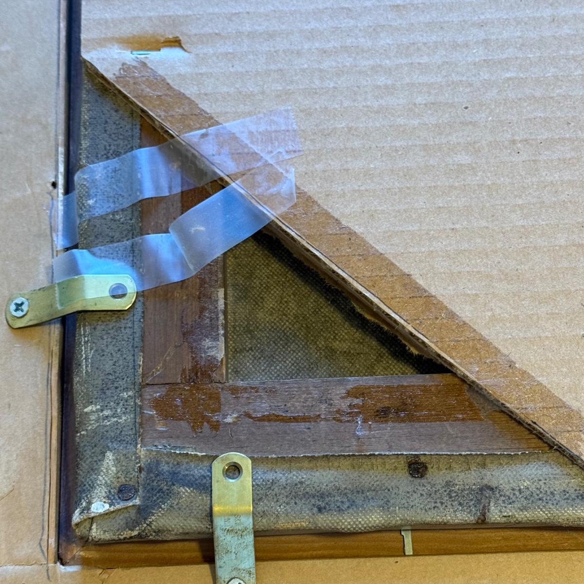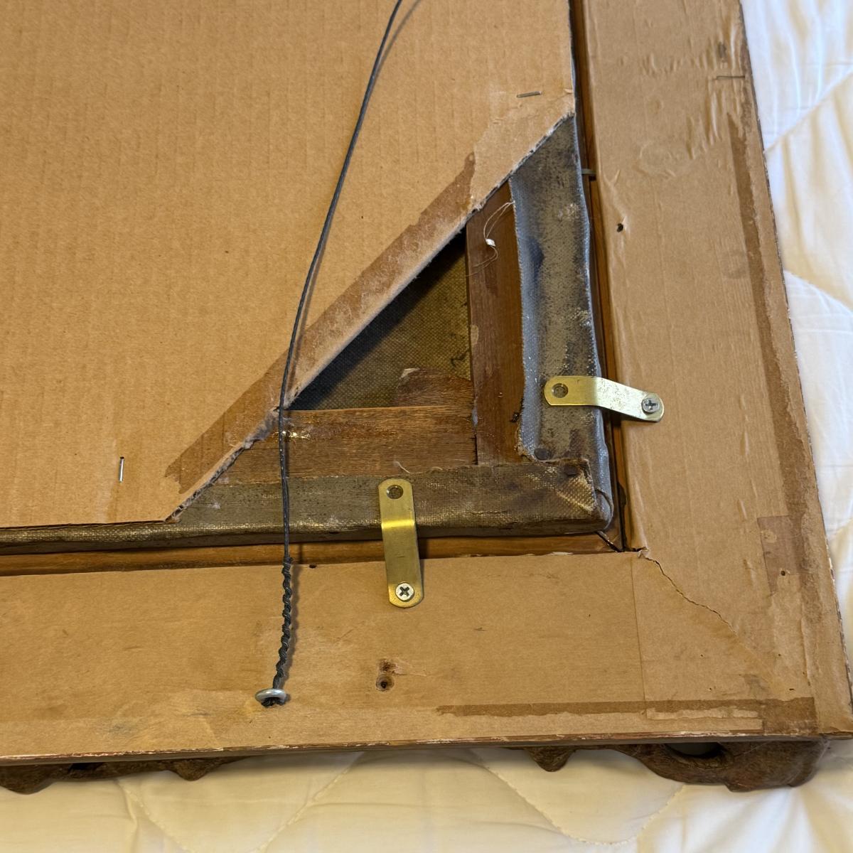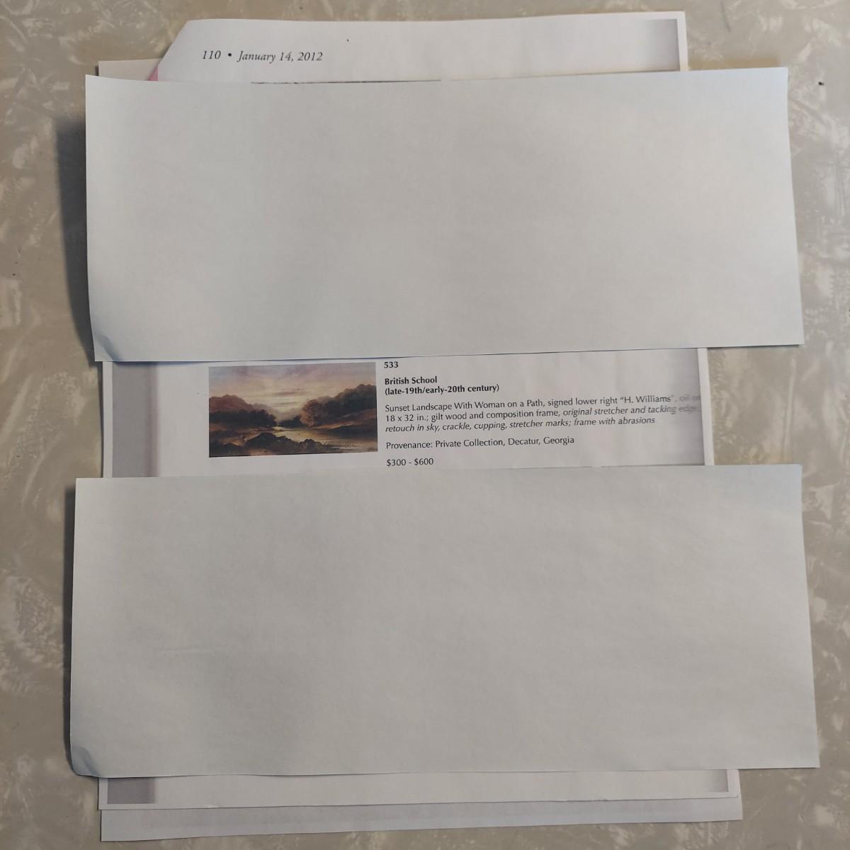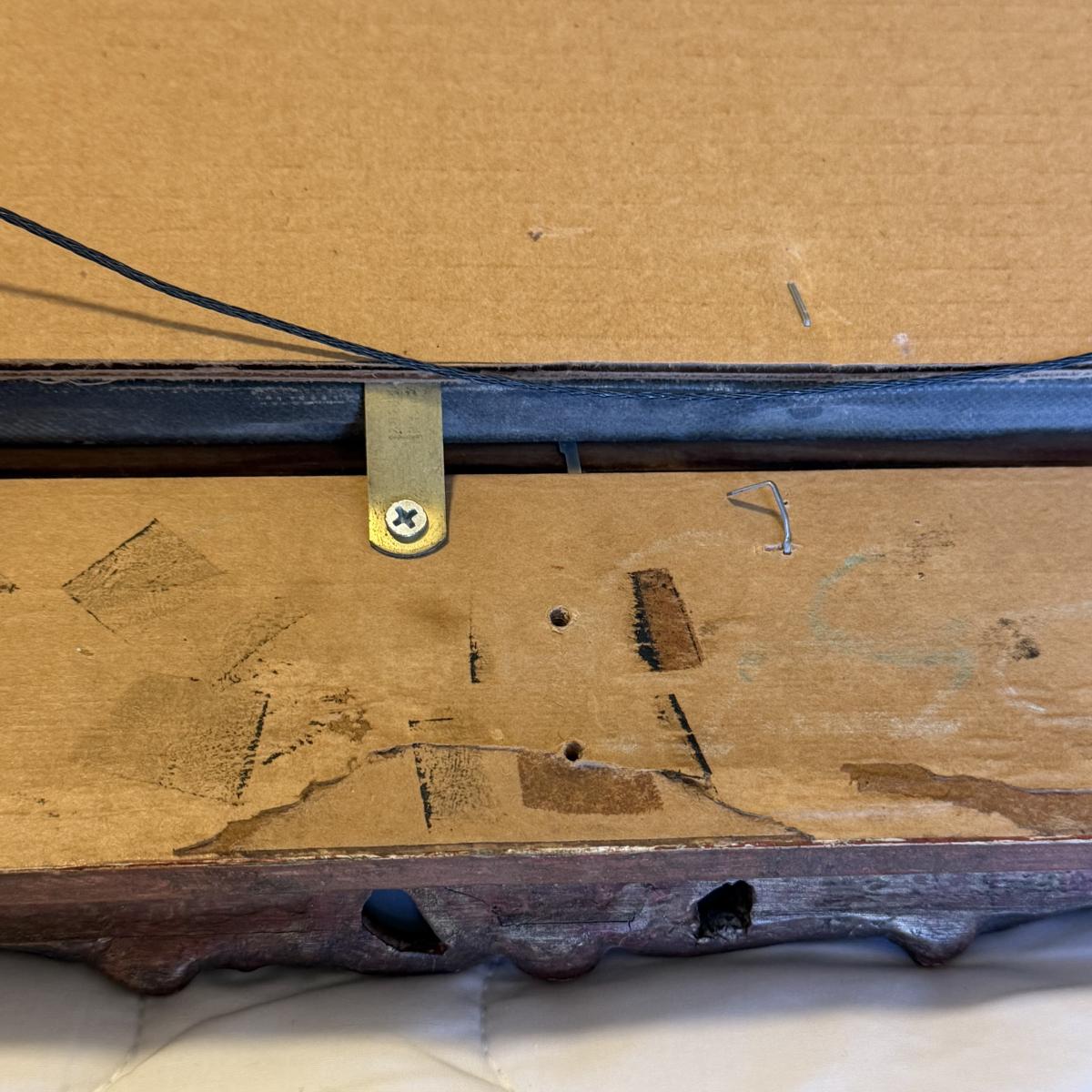 Original British School style oil painting signed H. Williams. Painting is framed without glass in an ornate gilded wooden frame that measures 38.5” x 24.75”H. The decorative corners could be made from a plaster-like material. Frame depth is approximately 3”. There are multiple cracks in the frame. Craquelure is seen in the paint. Please see photos for details.