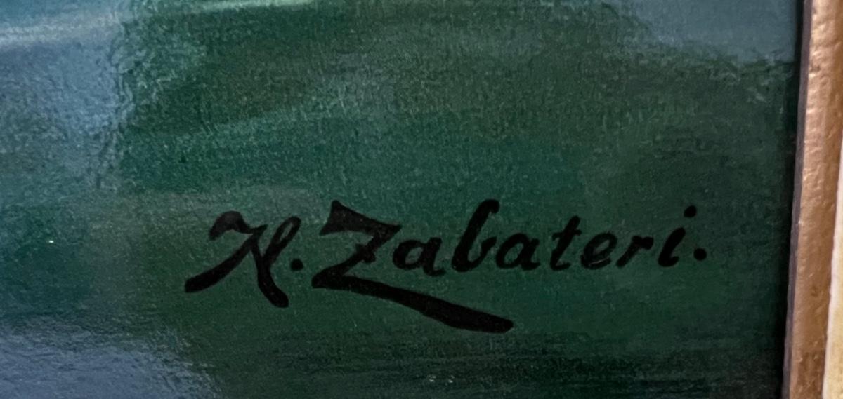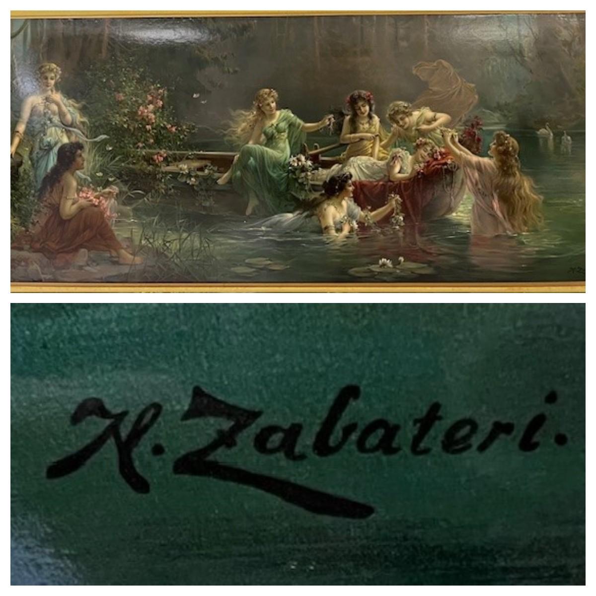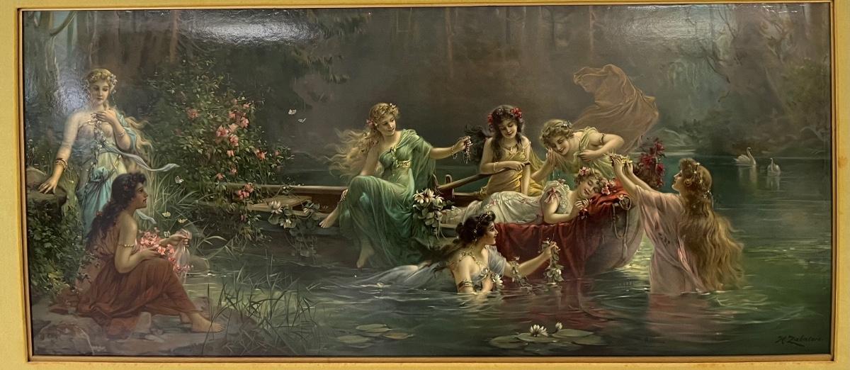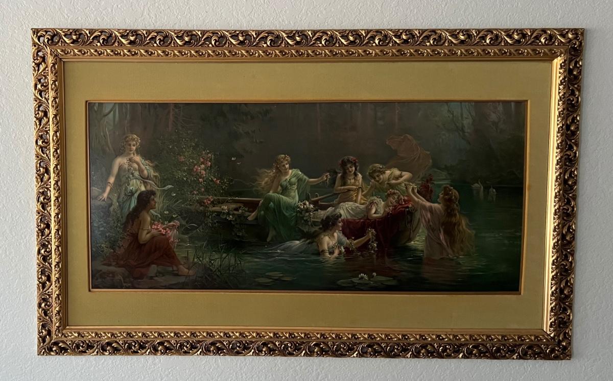 "The Bathing Pool." Large chromolithograph in an ornate, carved, gilded frame. Signed by artist. Measurement: 56"W x 34"H. [EC]