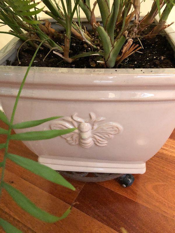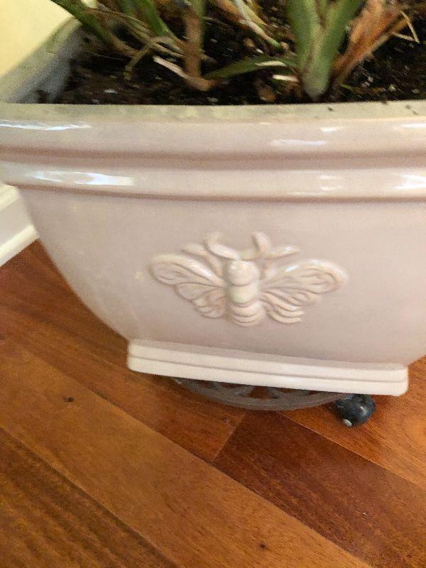 Bee Planter with Plant on Rolling Stand. Please refer to photos for size and condition. Have fun and happy bidding.