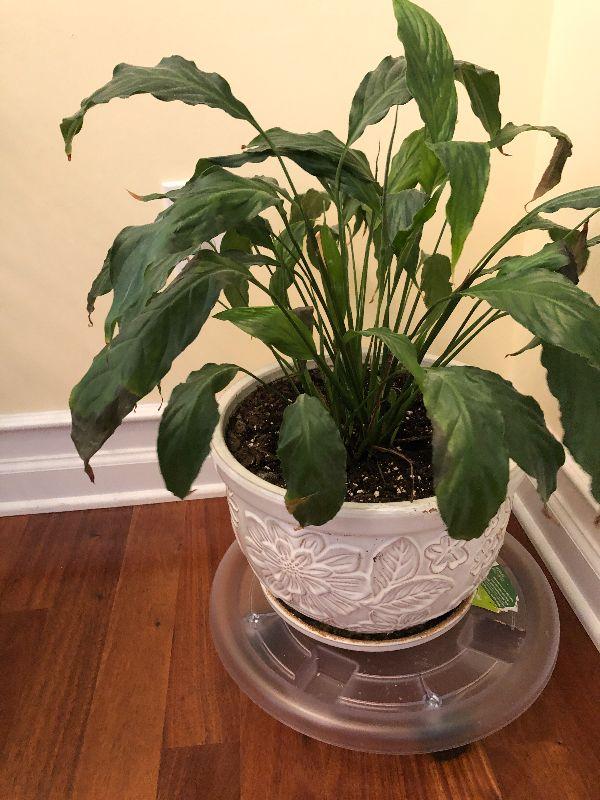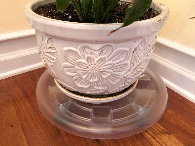 Planter with Plant on Rolling Stand. Please refer to photos for size and condition. Have fun and happy bidding.