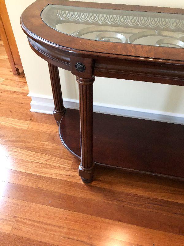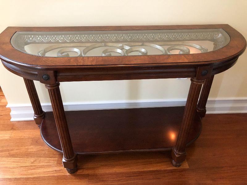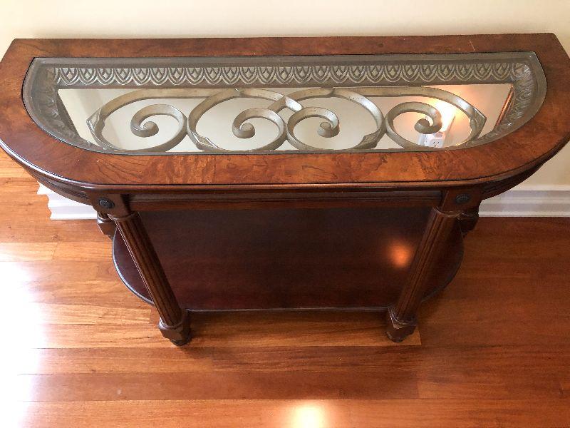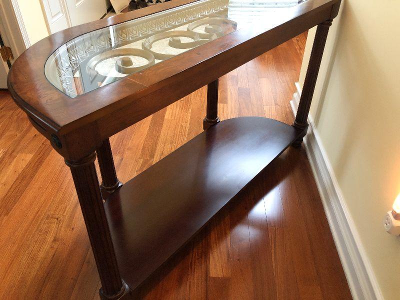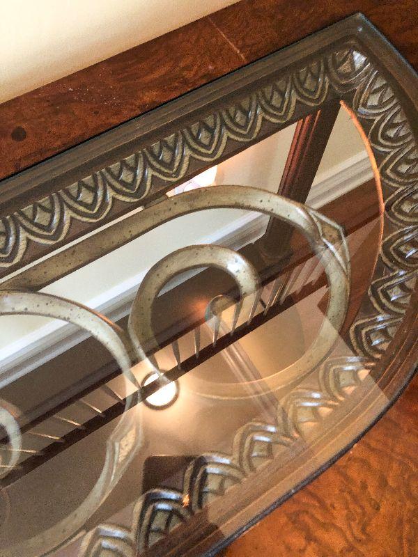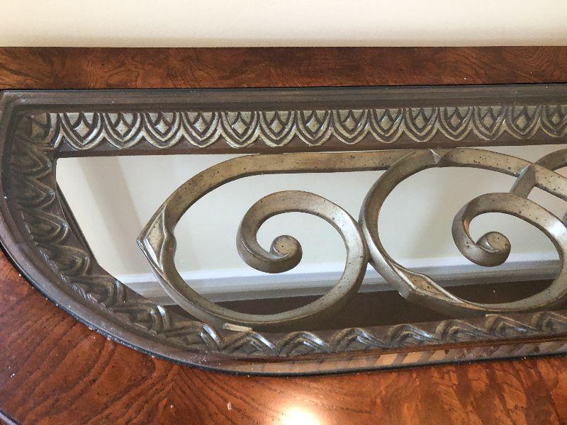 Wood and wood carved relief under glass table. Please refer to photos for size and condition. Have fun and happy bidding.