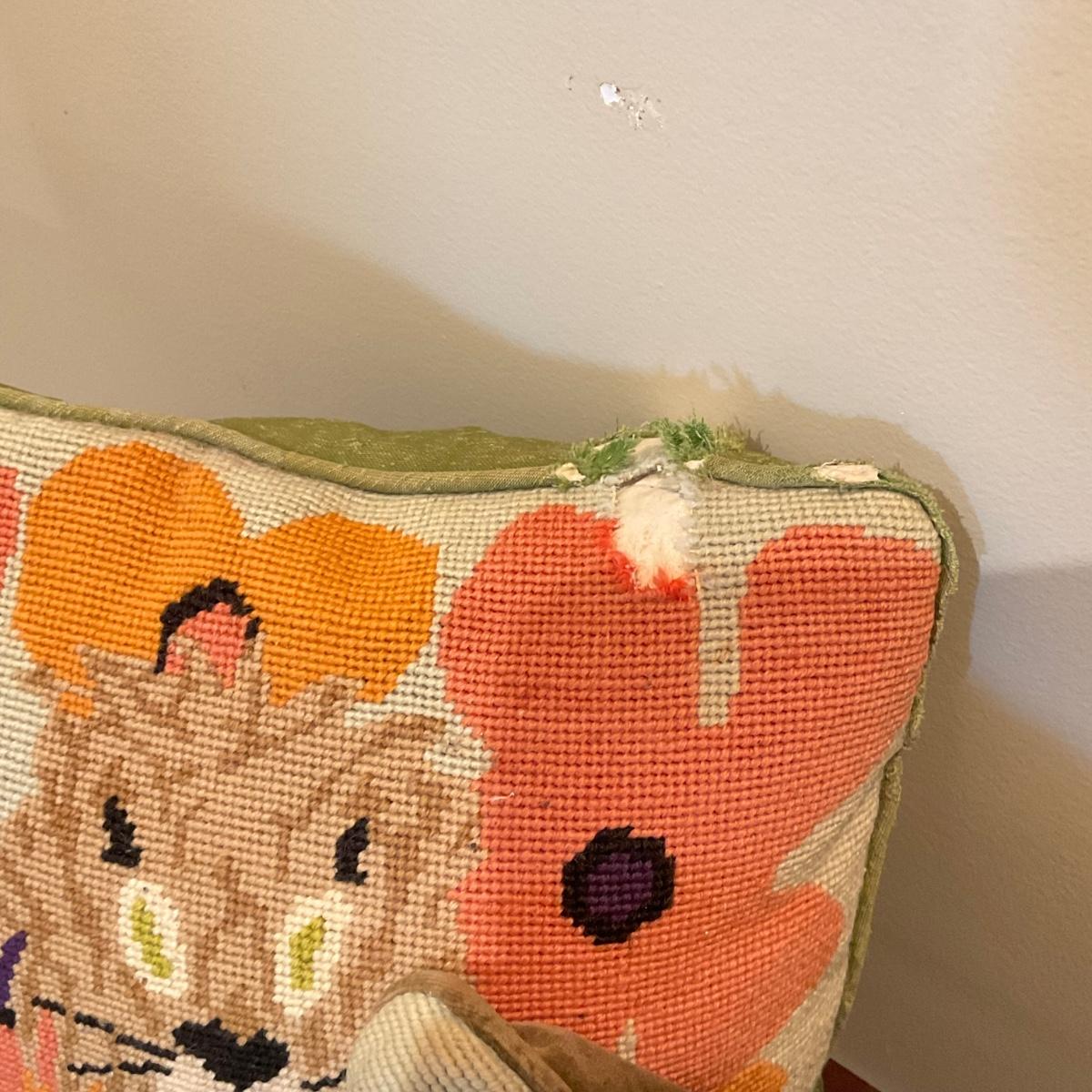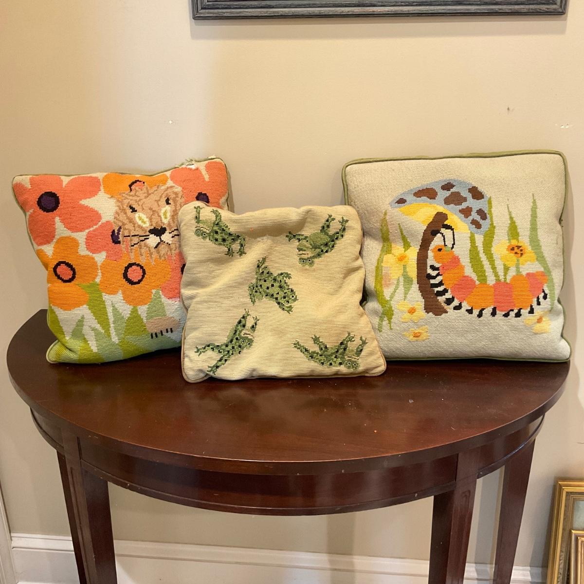 This lots includes three pillows. One depicting a Lion, caterpillar, and frogs. The lion pillow has some minor damage please refer to the photos