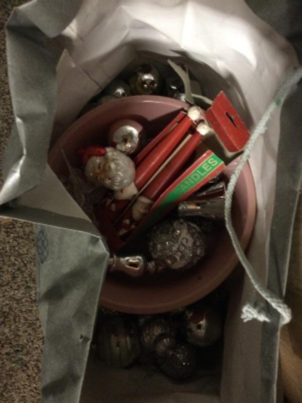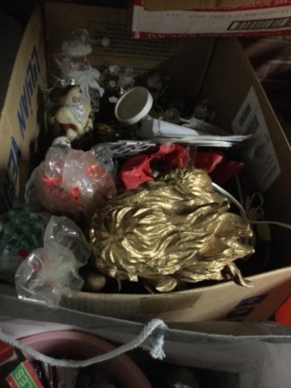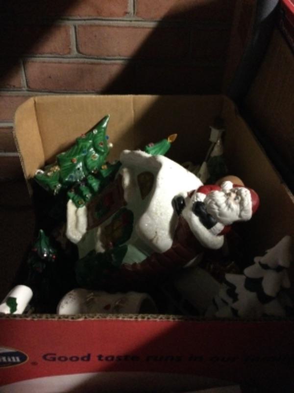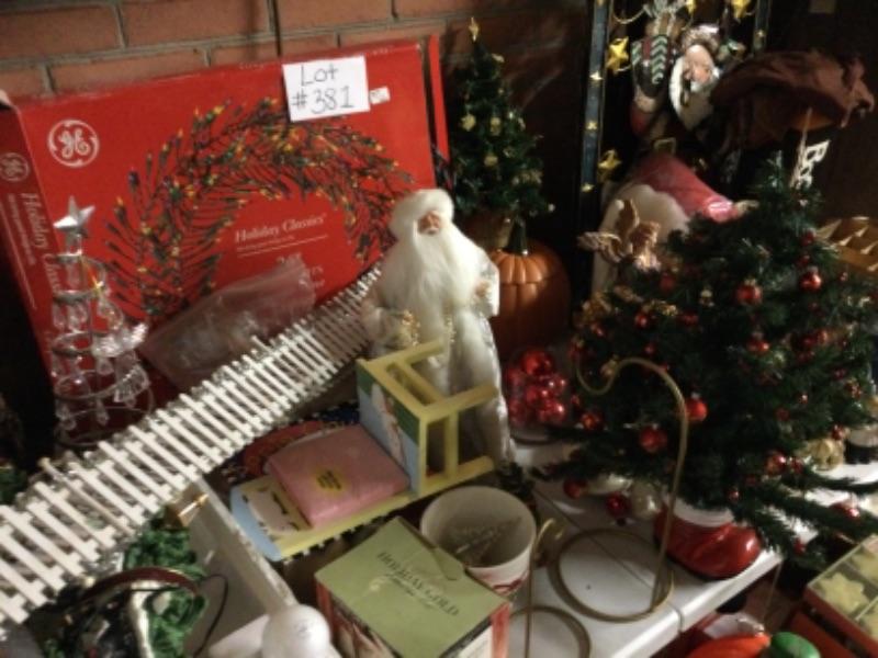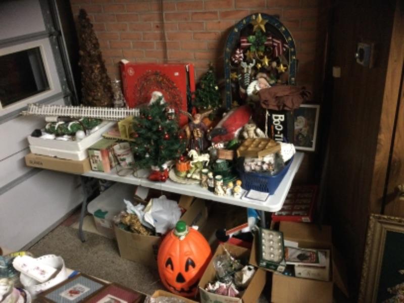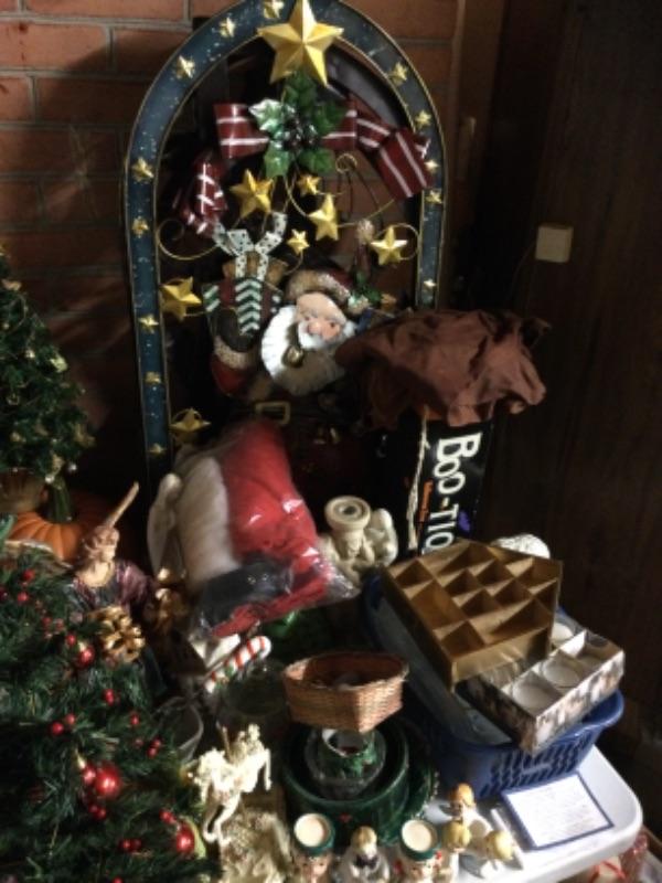 Large lot of holiday decorative items. Christmas ornaments some hand made, some store bought, decorated miniature trees, Dept.56 figurines, pine cone tree, snowman decor, angel decor, Santa decor, Halloween decor, Easter decor and more