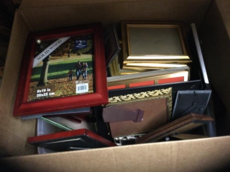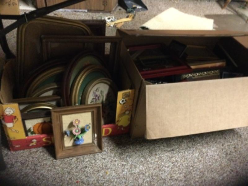 Box of assorted needlepoint framed art. Box of assorted picture frames