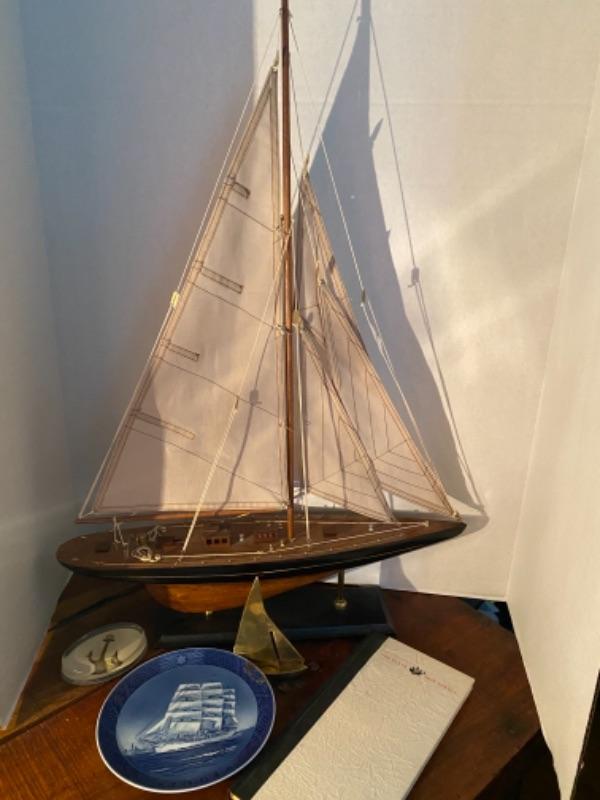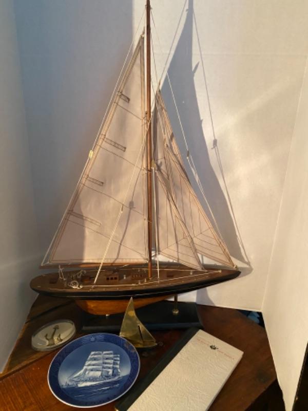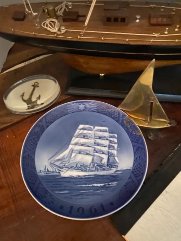 Boat Model , brass boat , royal Copenhagen plate (repair) , anchor paperweight