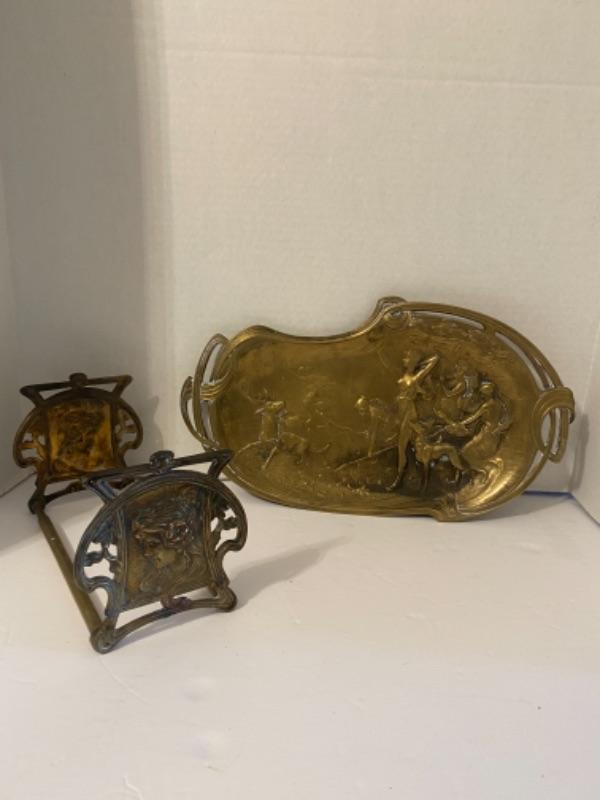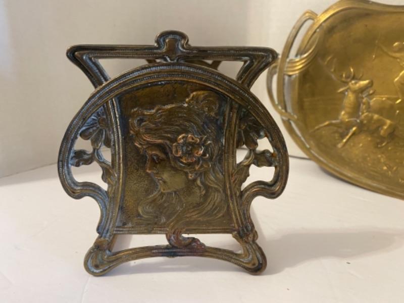 H - 649: Two Piece Brass Art Nouveau Dish and Book Holder