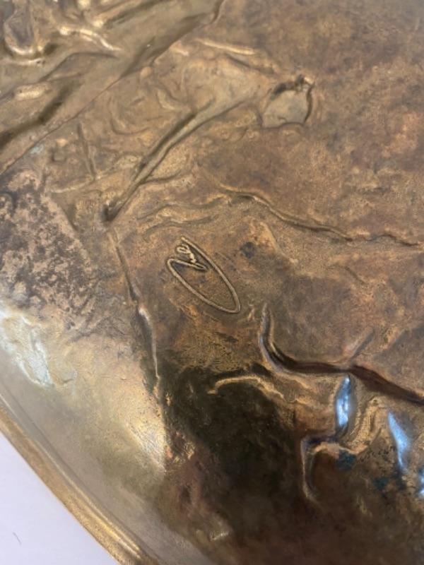 Beautiful Brass Art Nouveau Hunting Scene Tray measures 16” l x 9.25” wide signature is on back of tray with