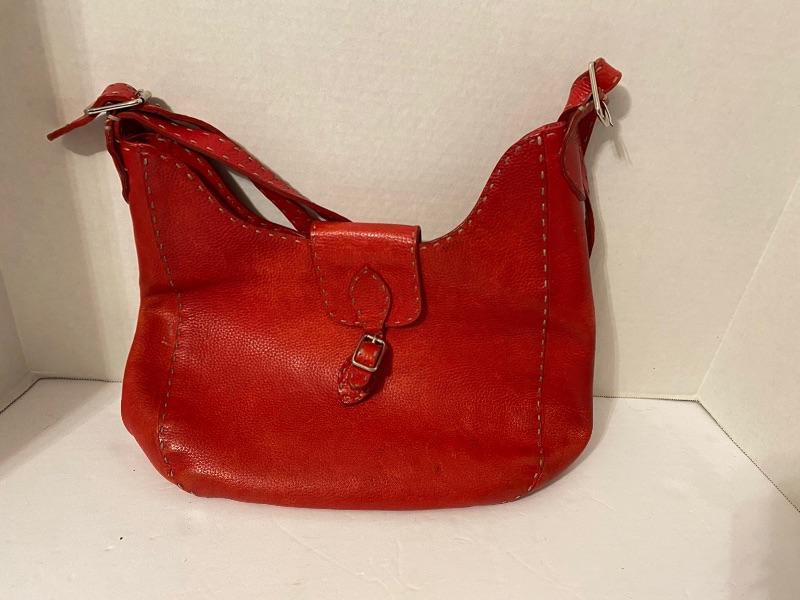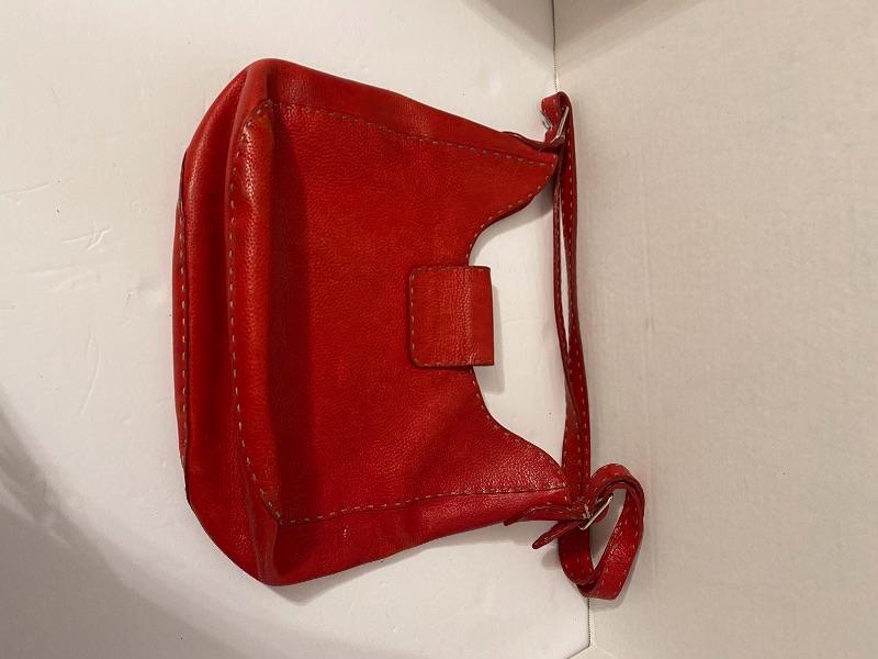 Fendi Red Handbag. Approx. 13” W, with adjustable strap to 29” long. The handbag has some ware inside and outside.