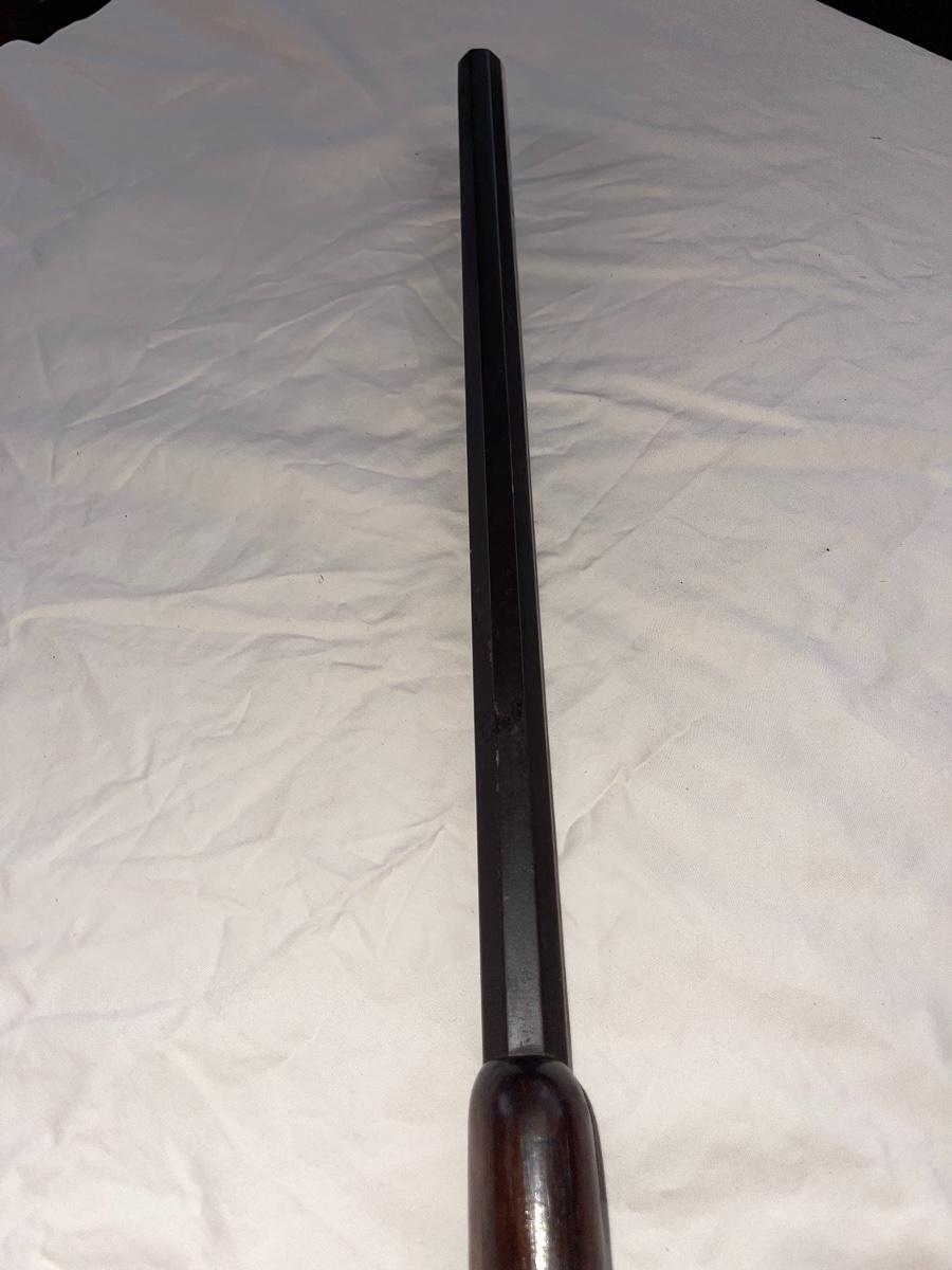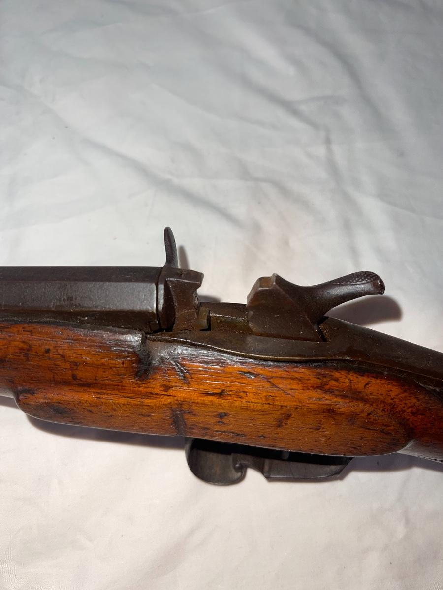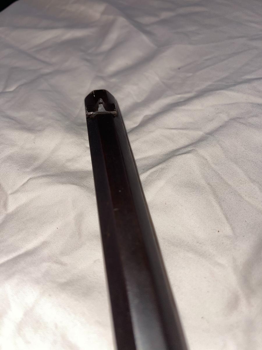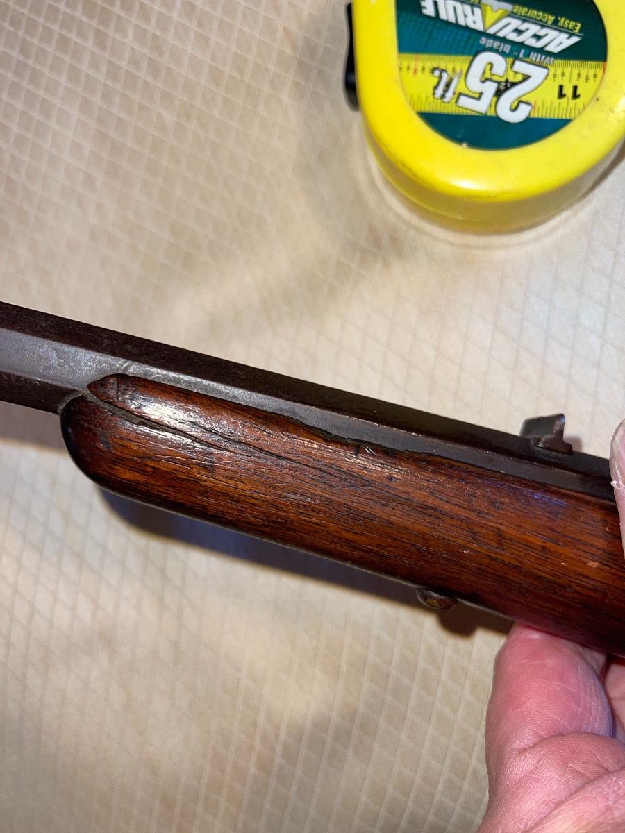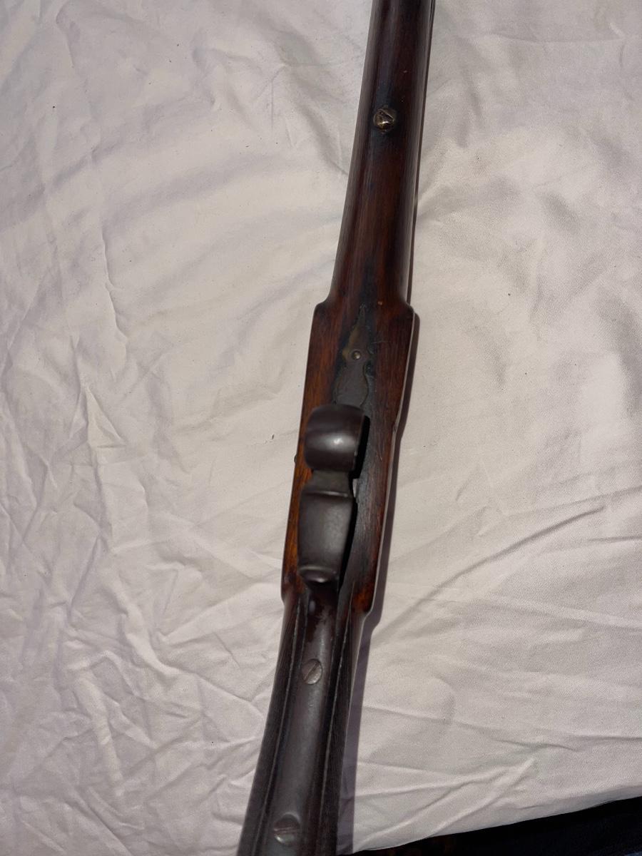 Stock Configuration & Condition: The stock(s) is varnished wood. there are some handling and use marks and some cracking on one side where the meets upper stock below the rear sight (see pic), but considering the age, it is in remarkably good condition. The wood is slightly shallow of the metal at places and shows some wear.