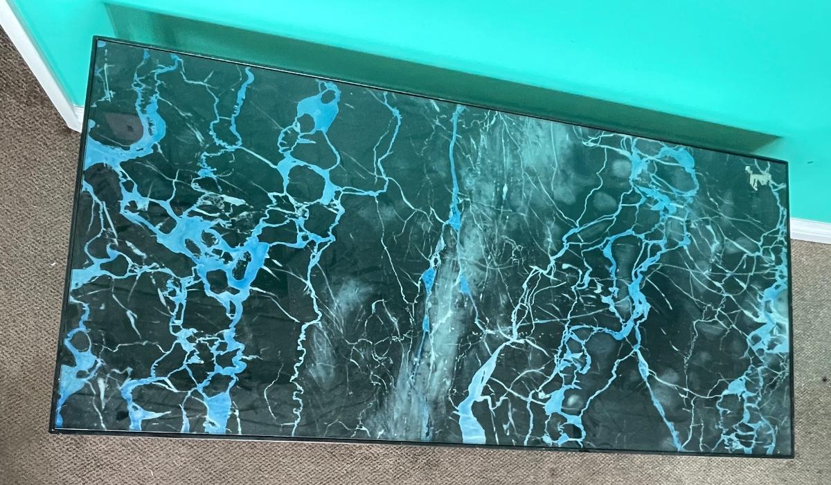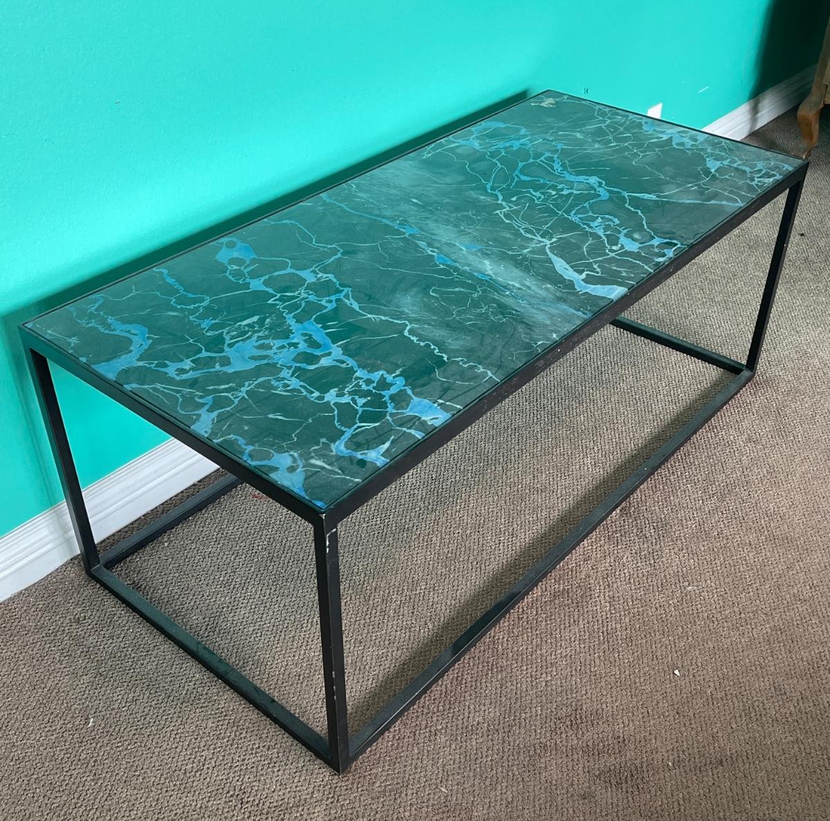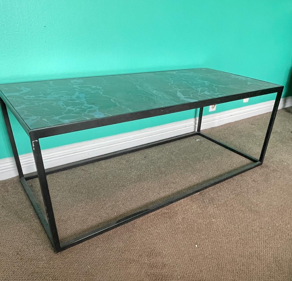 Welded metal frame with marble-like top. Measures approx. 18" H x 48" W x 22" D, good condition.