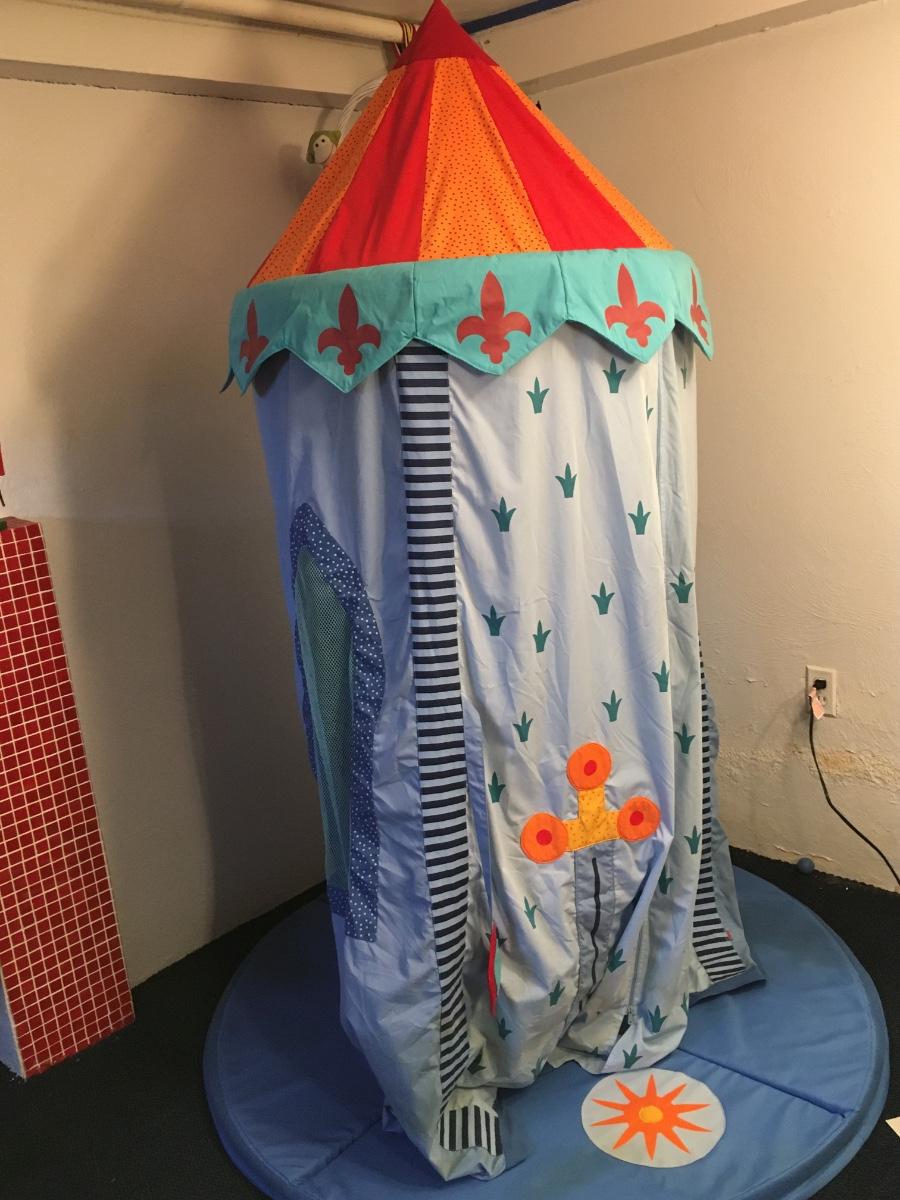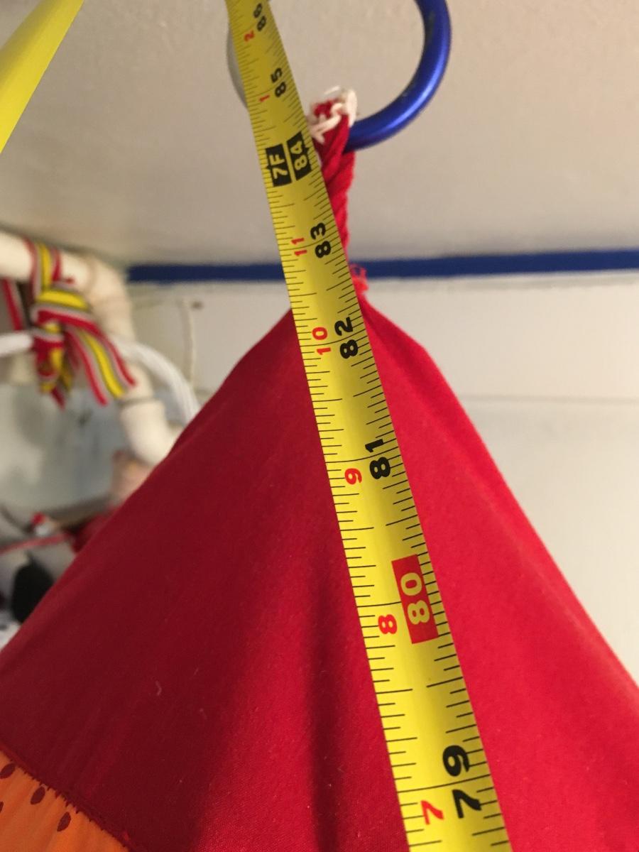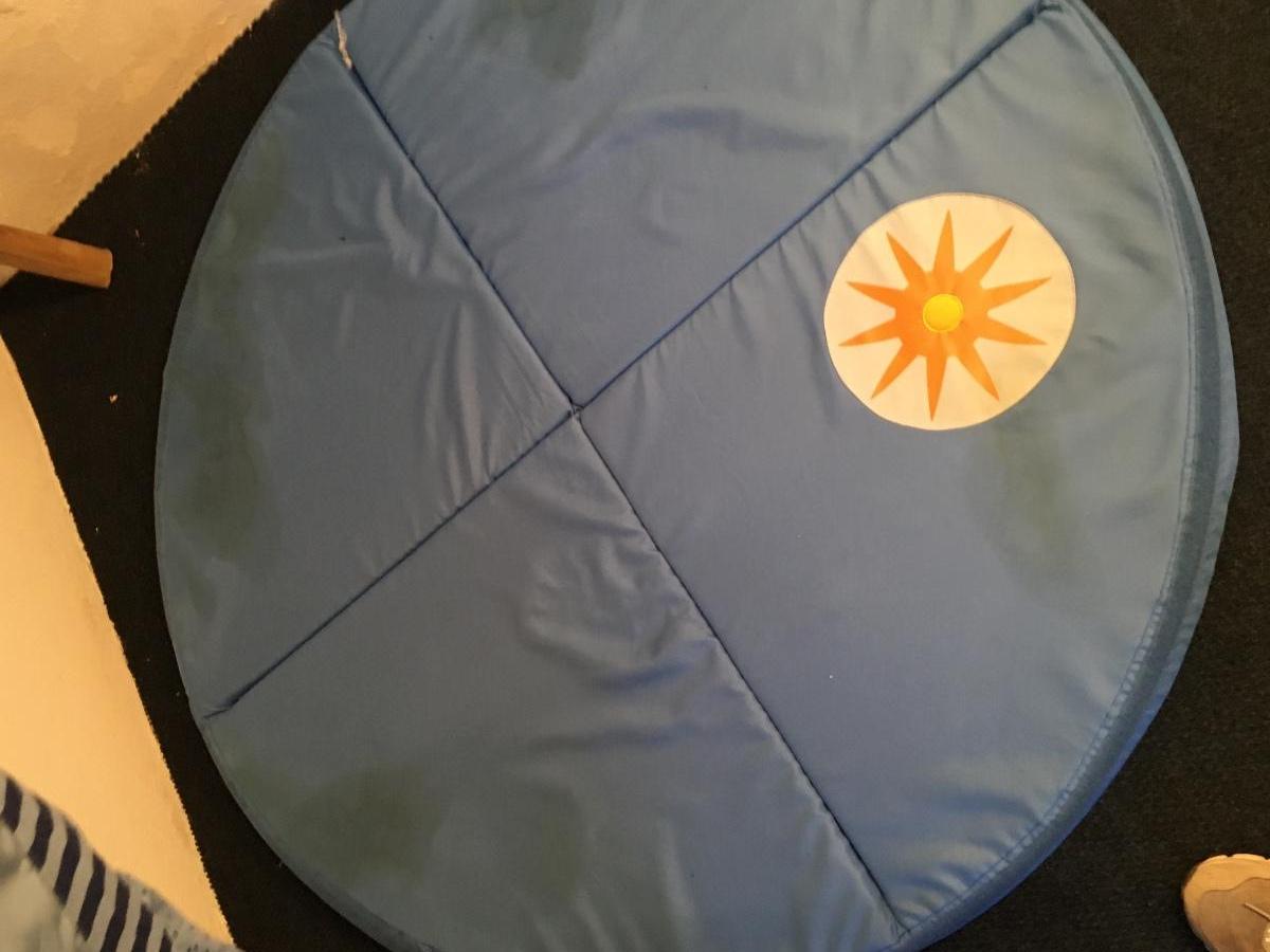 Hangs from hook in ceiling, zippers closed and has foam circle mat to sit on. Easy set up and fun for your little ones!