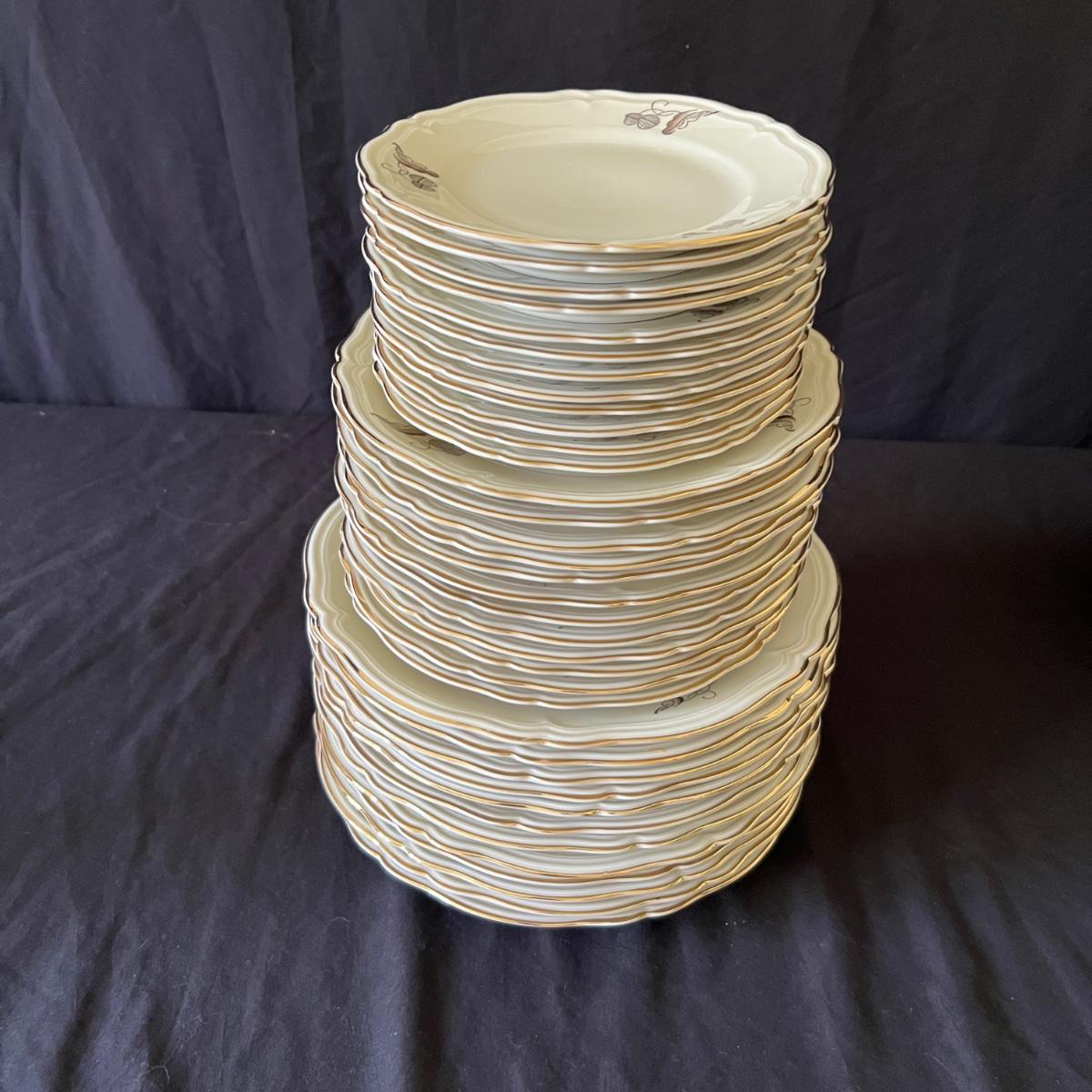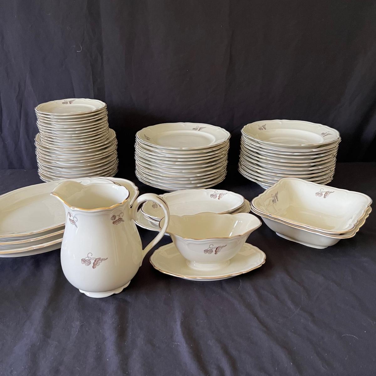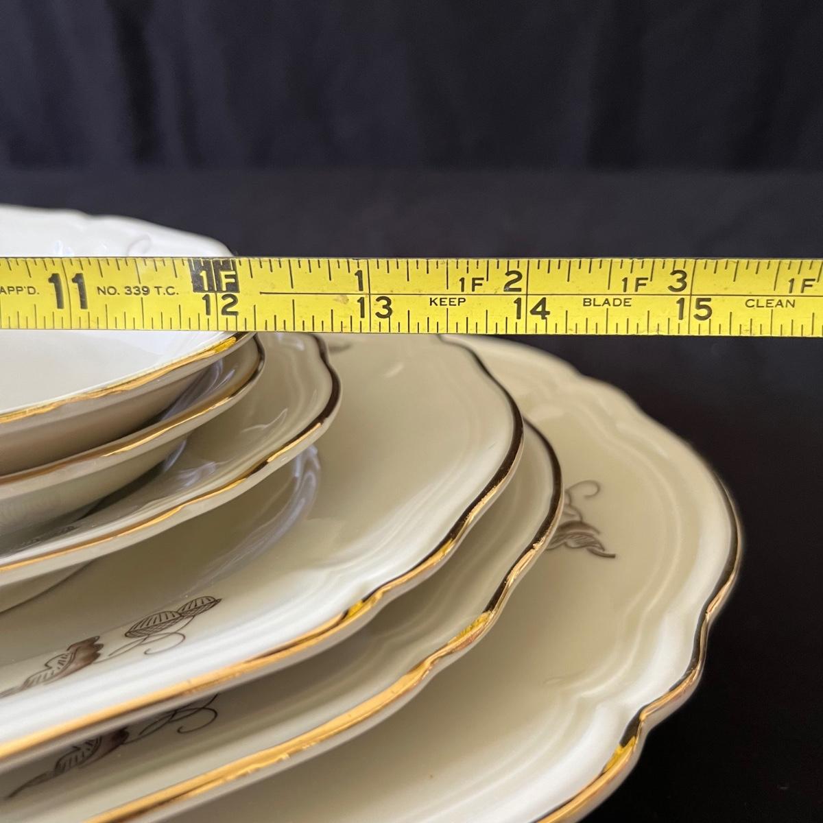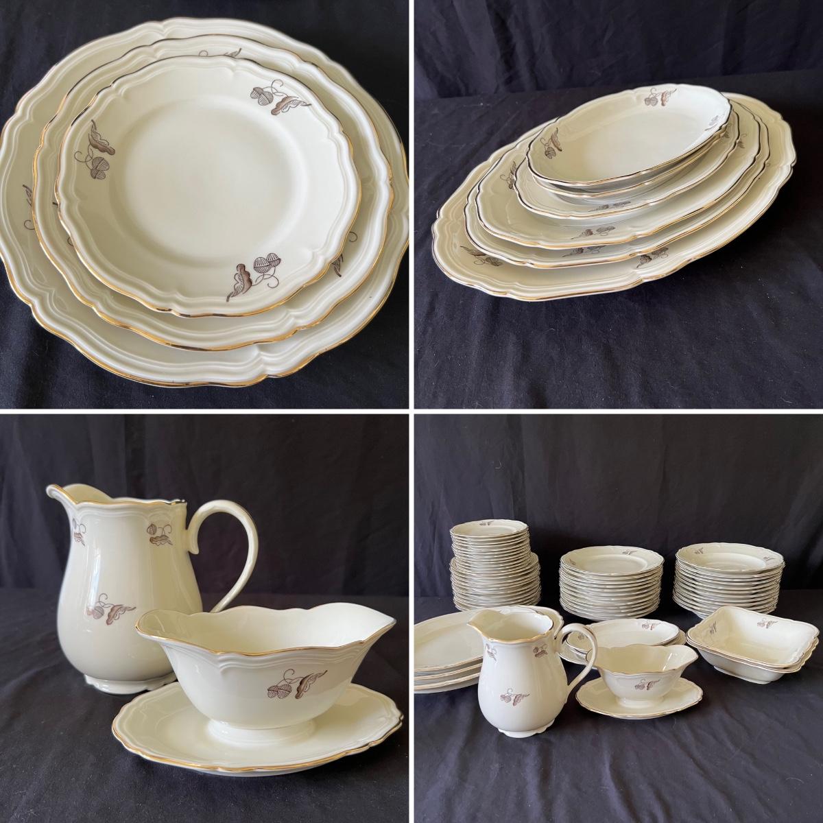 This 12 person Hackefors China set is in very good condition and its thick gilded rim glitters against the cream backdrop. Includes 12 each of 3 sizes of plates plus soup bowls as well as 2 square serving dishes, pitcher, gravy boat and 6 oval platters in varying sizes (2 the same size of the smallest platters). See photos for measurements.