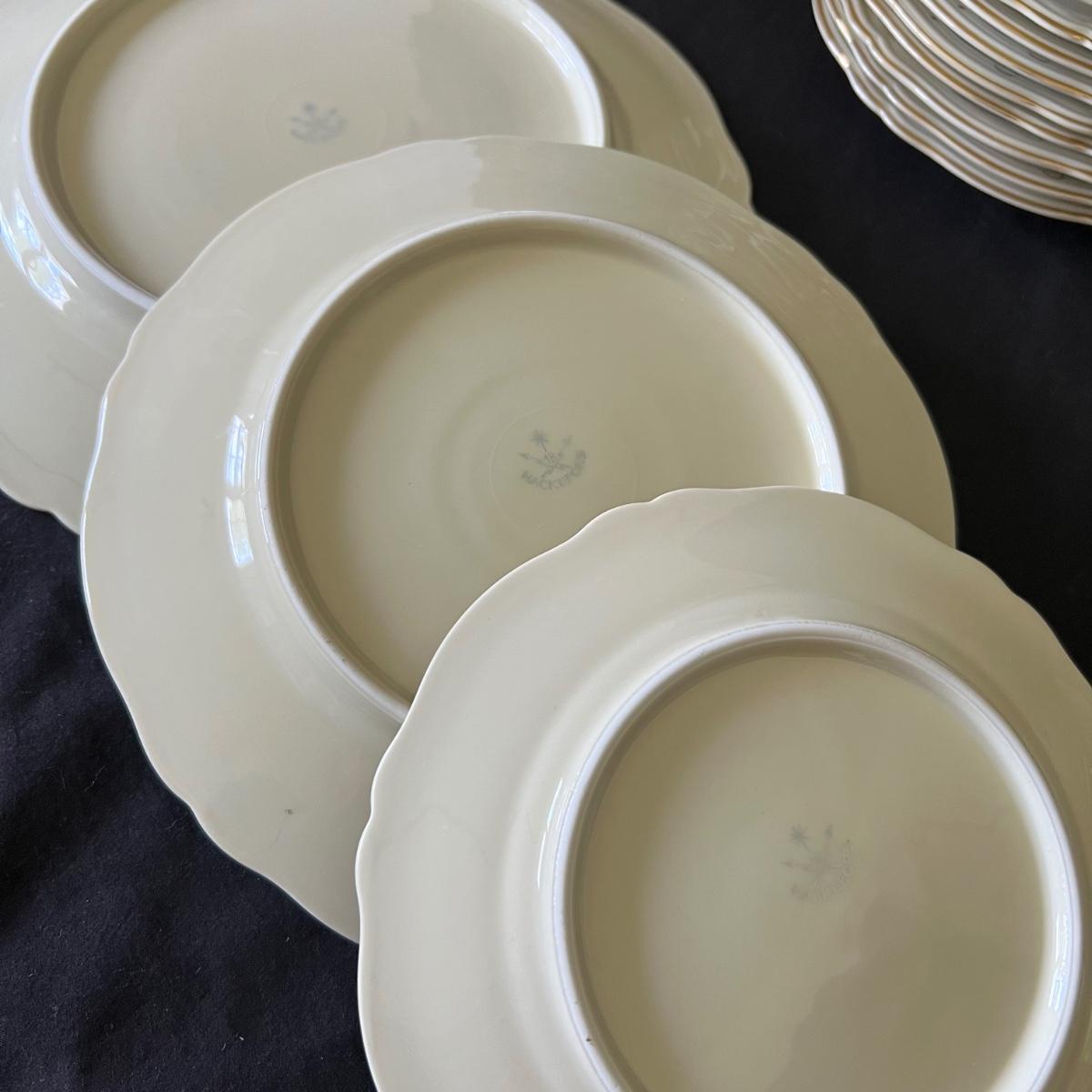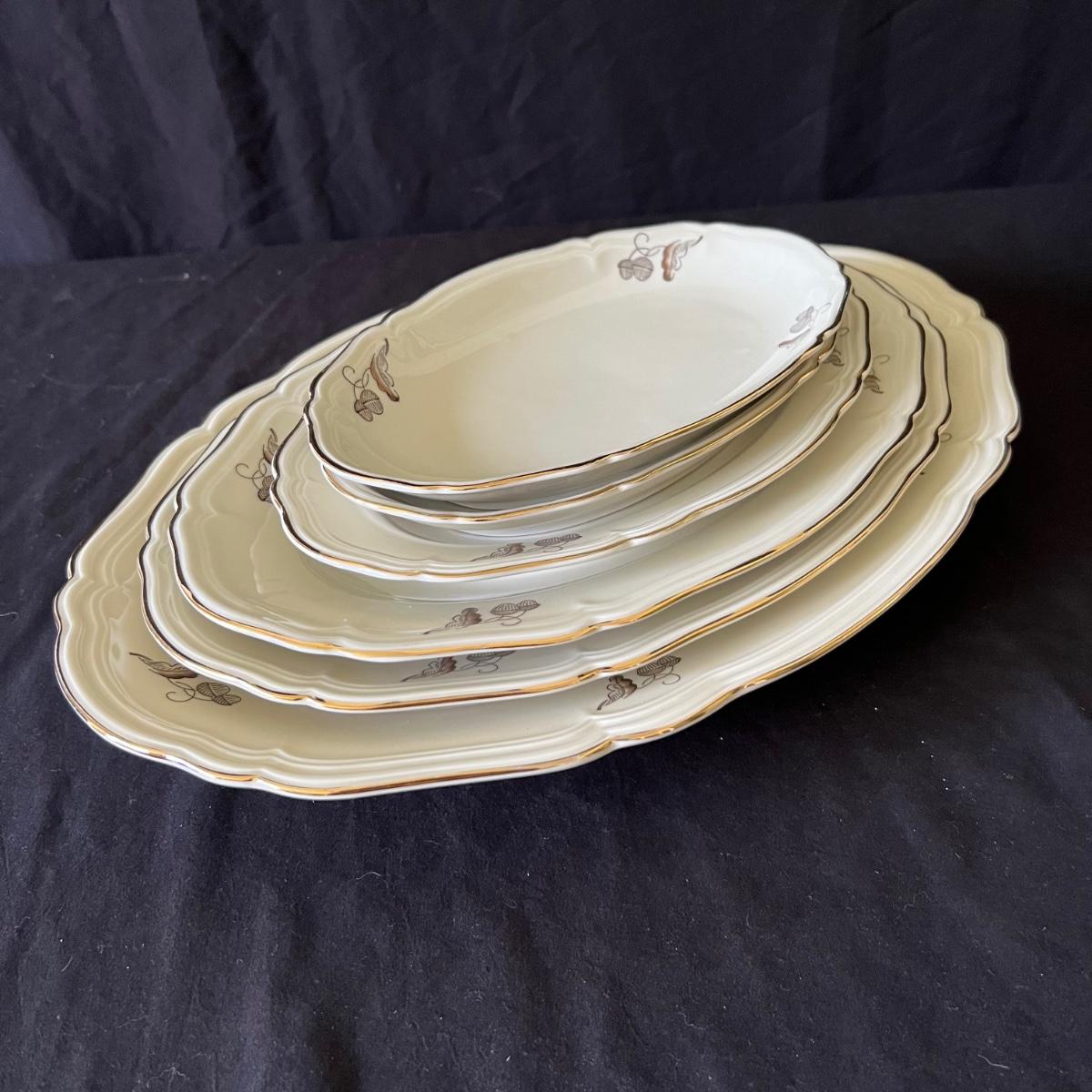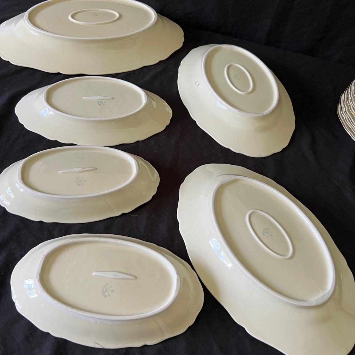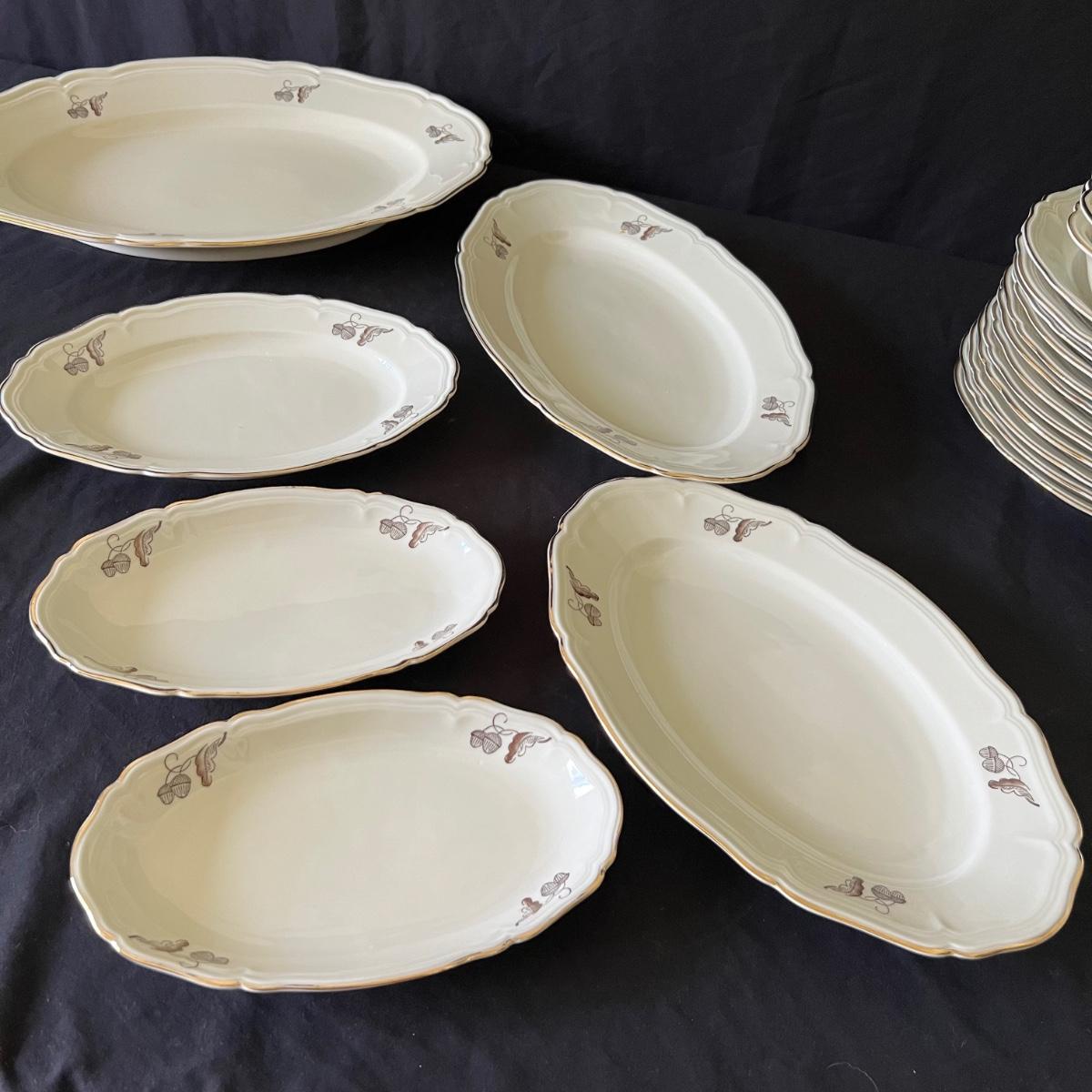 This 12 person Hackefors China set is in very good condition and its thick gilded rim glitters against the cream backdrop. Includes 12 each of 3 sizes of plates plus soup bowls as well as 2 square serving dishes, pitcher, gravy boat and 6 oval platters in varying sizes (2 the same size of the smallest platters). See photos for measurements.