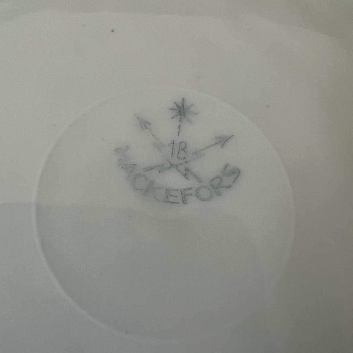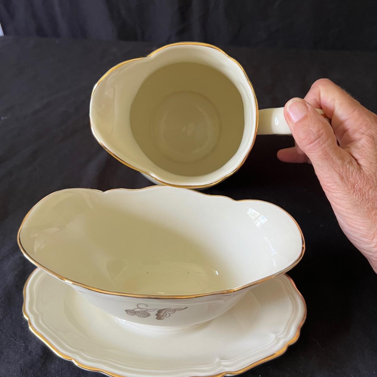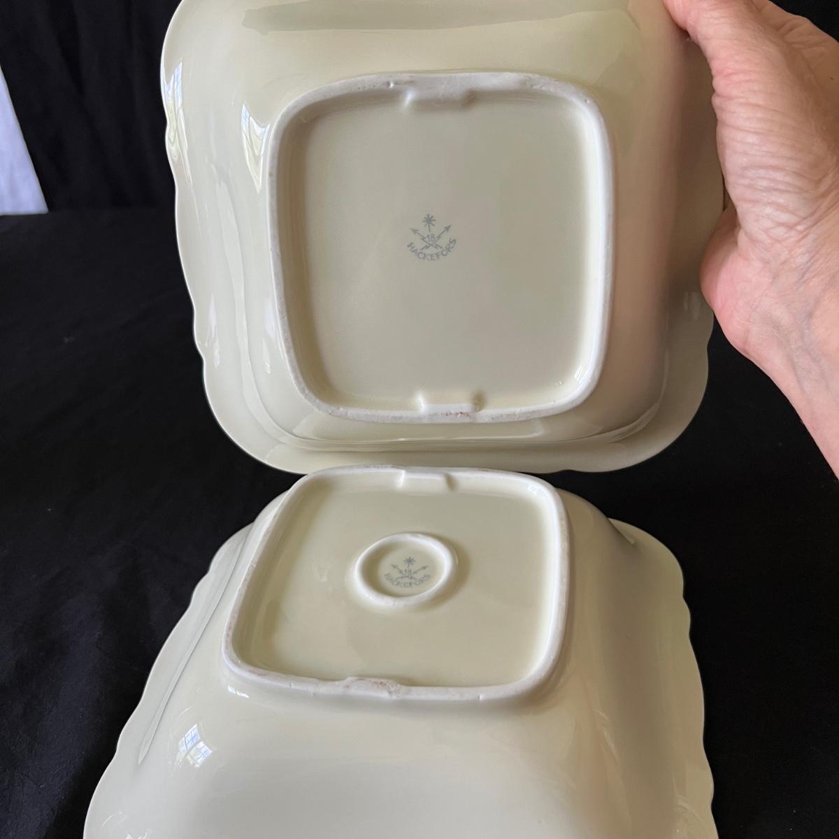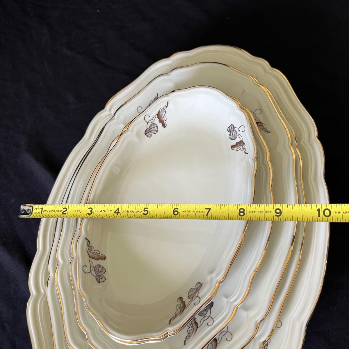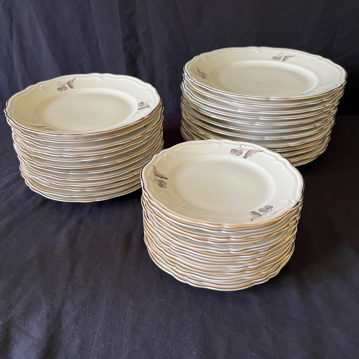 This 12 person Hackefors China set is in very good condition and its thick gilded rim glitters against the cream backdrop. Includes 12 each of 3 sizes of plates plus soup bowls as well as 2 square serving dishes, pitcher, gravy boat and 6 oval platters in varying sizes (2 the same size of the smallest platters). See photos for measurements.