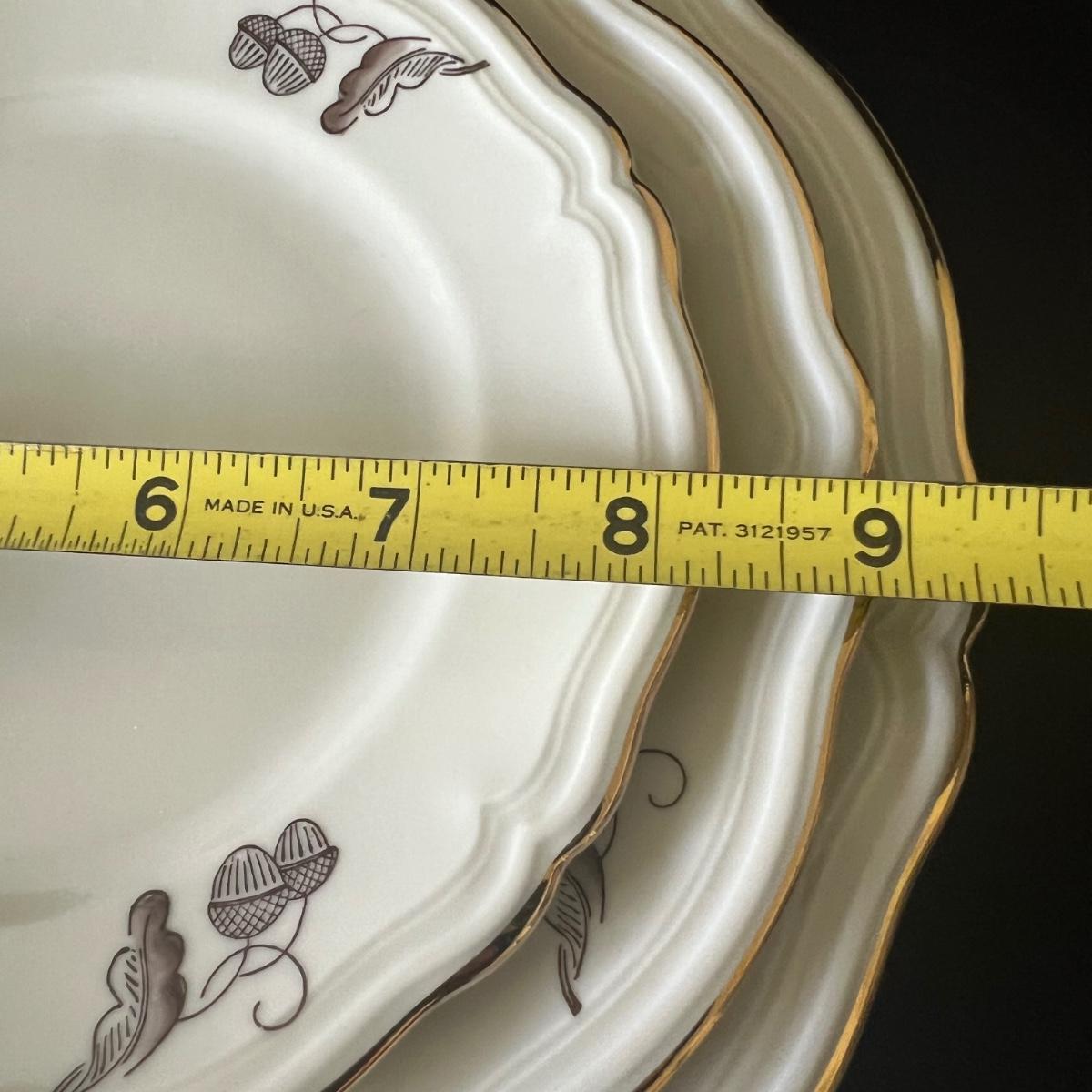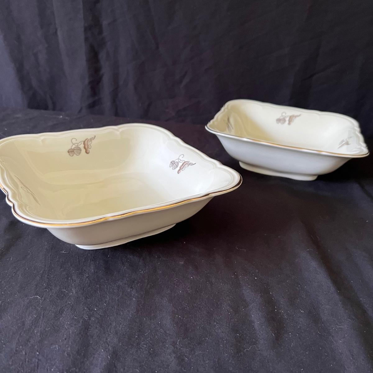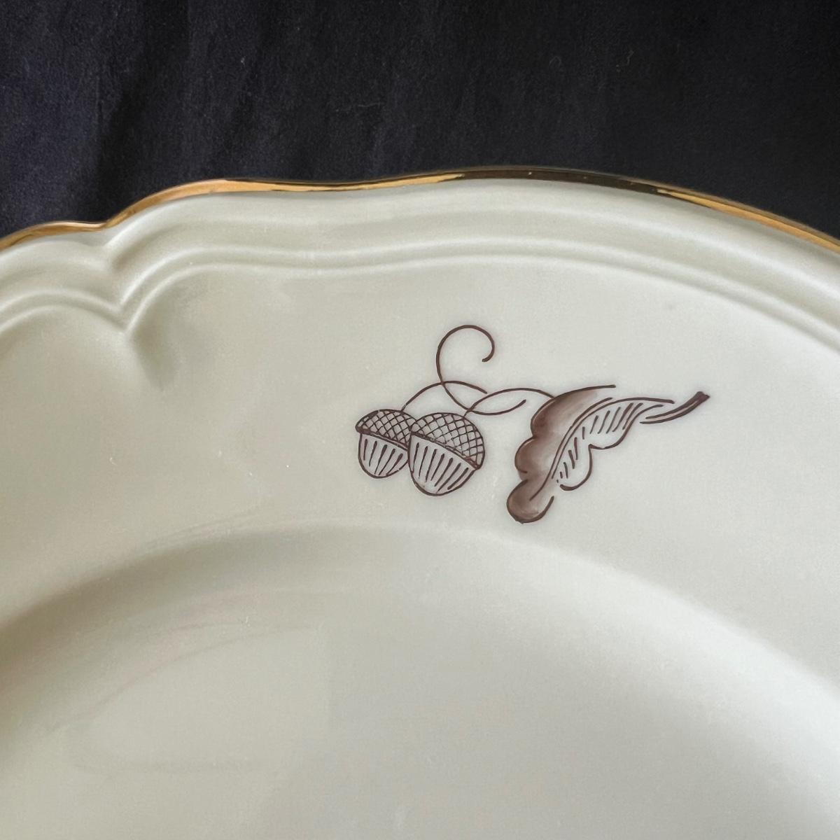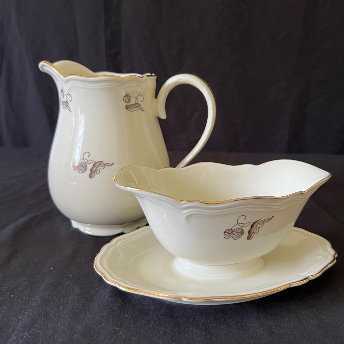 This 12 person Hackefors China set is in very good condition and its thick gilded rim glitters against the cream backdrop. Includes 12 each of 3 sizes of plates plus soup bowls as well as 2 square serving dishes, pitcher, gravy boat and 6 oval platters in varying sizes (2 the same size of the smallest platters). See photos for measurements.