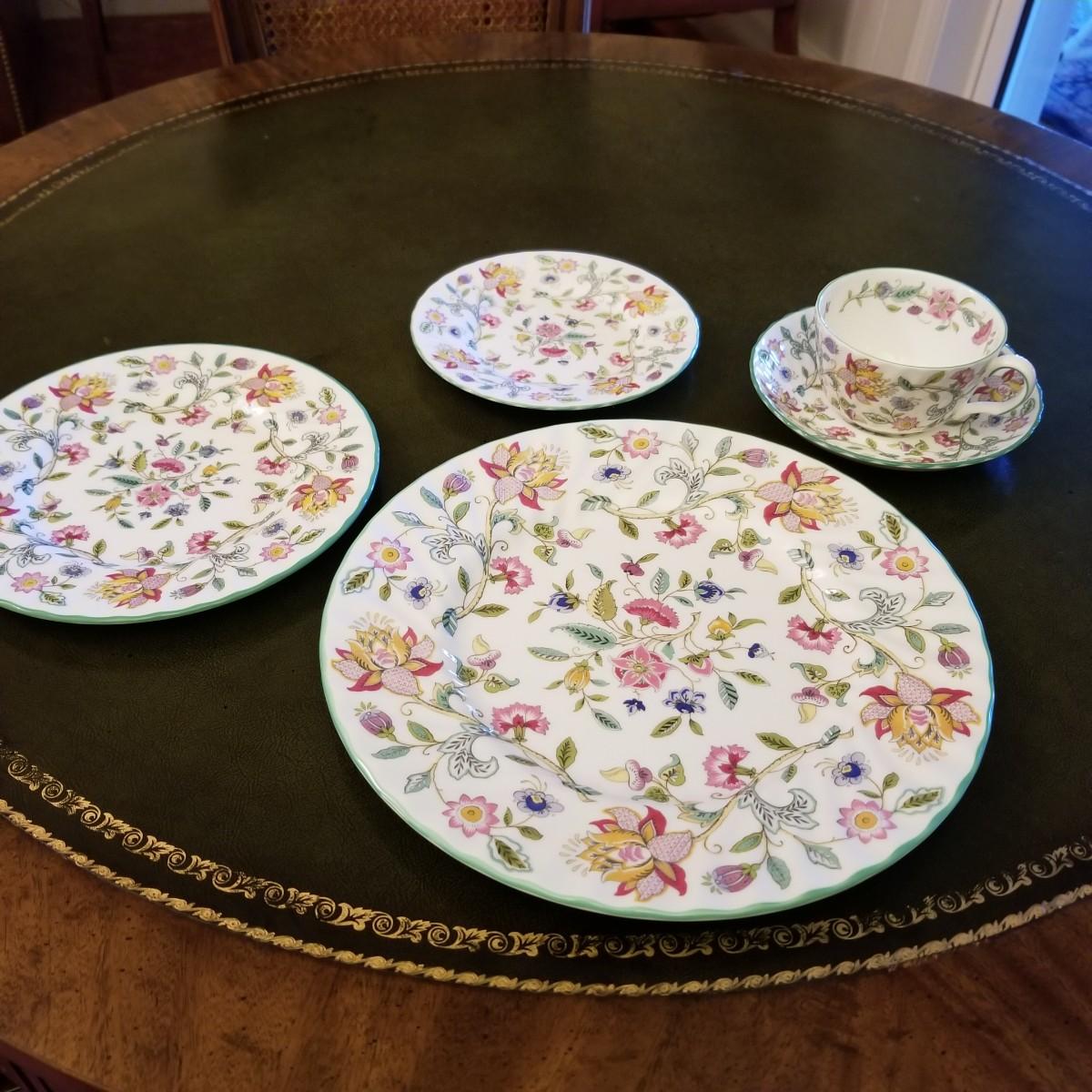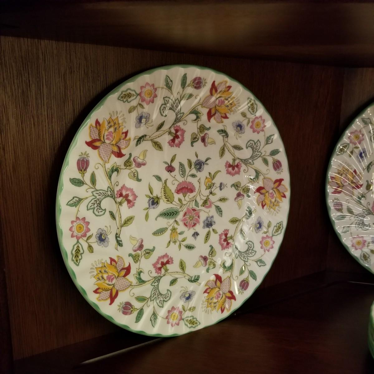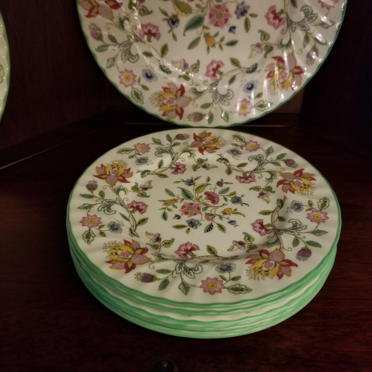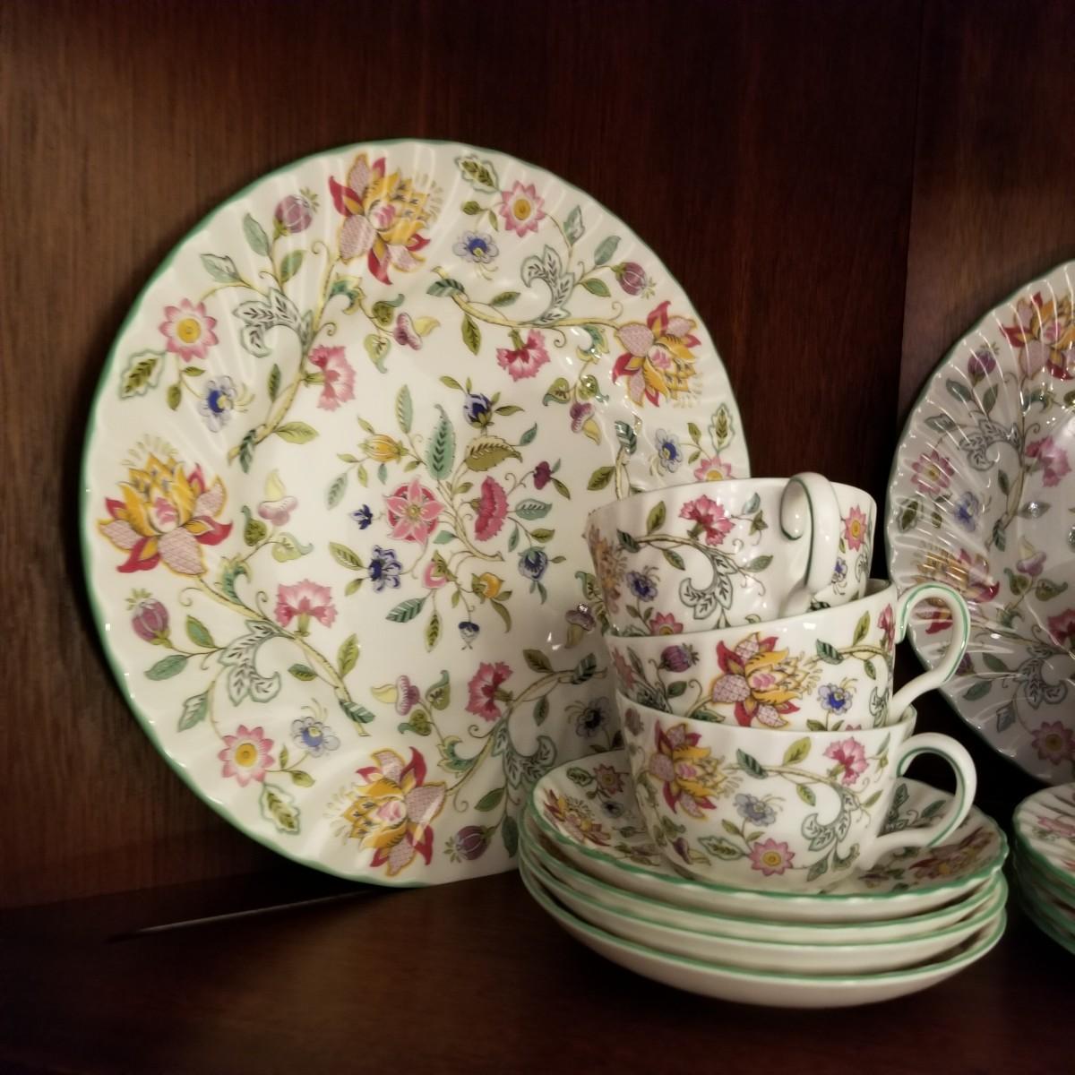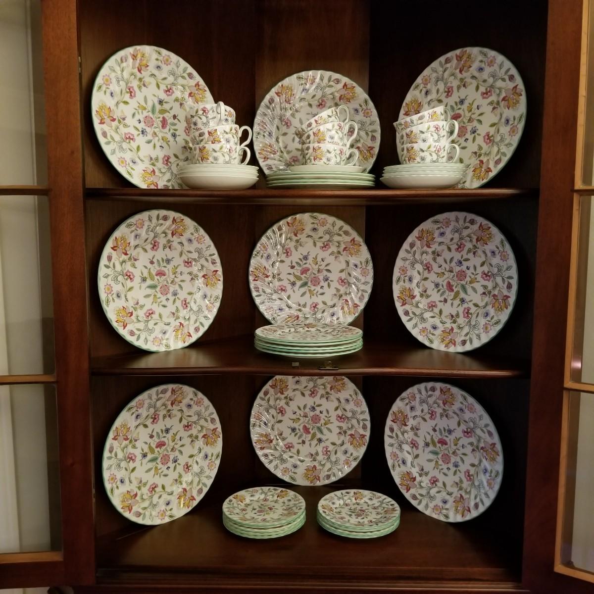 Lovely flower pattern china set. Minton by Haddon Hall has green rimmed swirled edges. Forty-four pieces total, they are as follows: dinner plates 9, salad plates 8, dessert plates 9, cups 9, saucers 9. All pieces in excellent condition. Items shown in hutch for clarity, hutch not included. Hutch listed as separate lot. See photos for details. Shipping available. Please call UPS for quote prior to bidding (828)252-6930