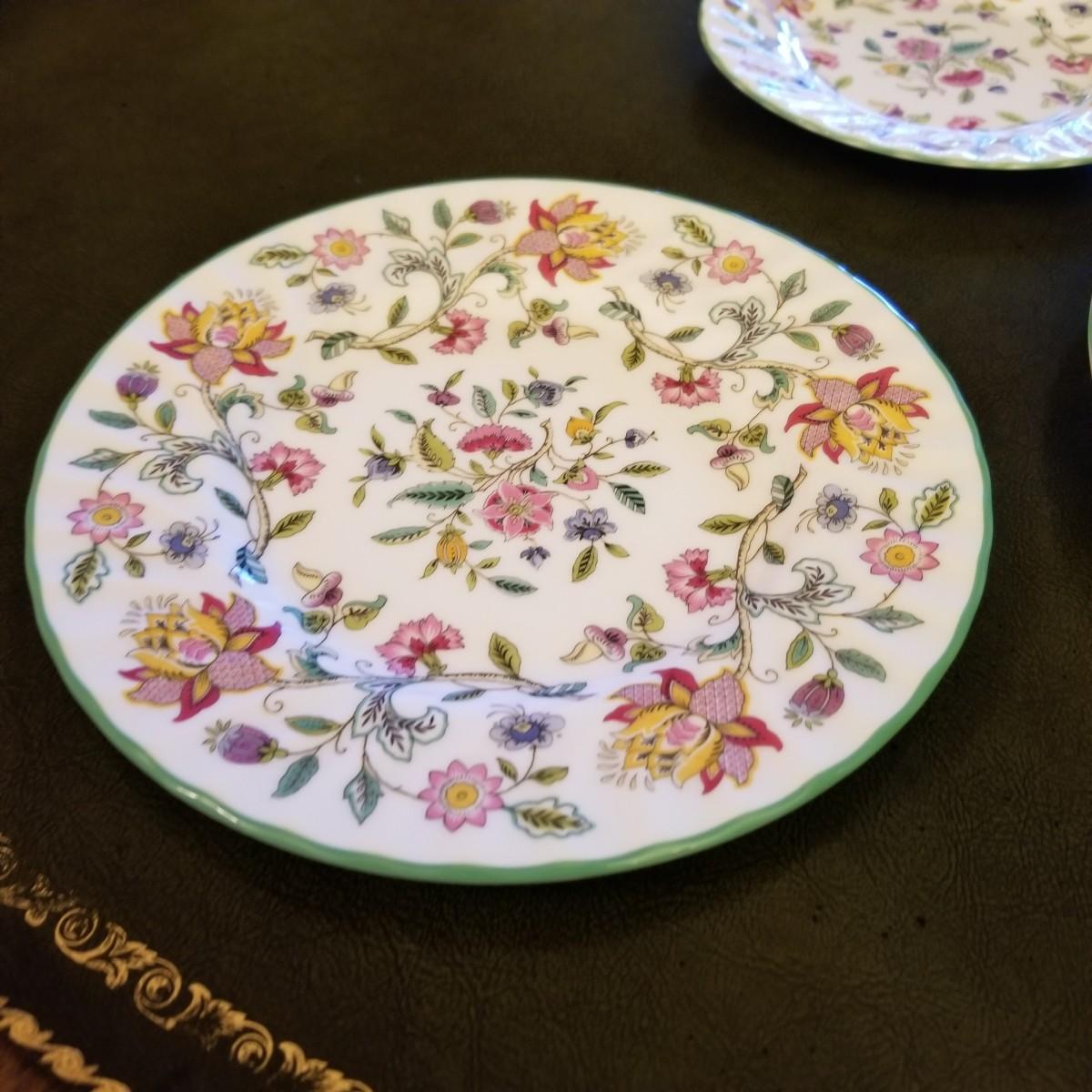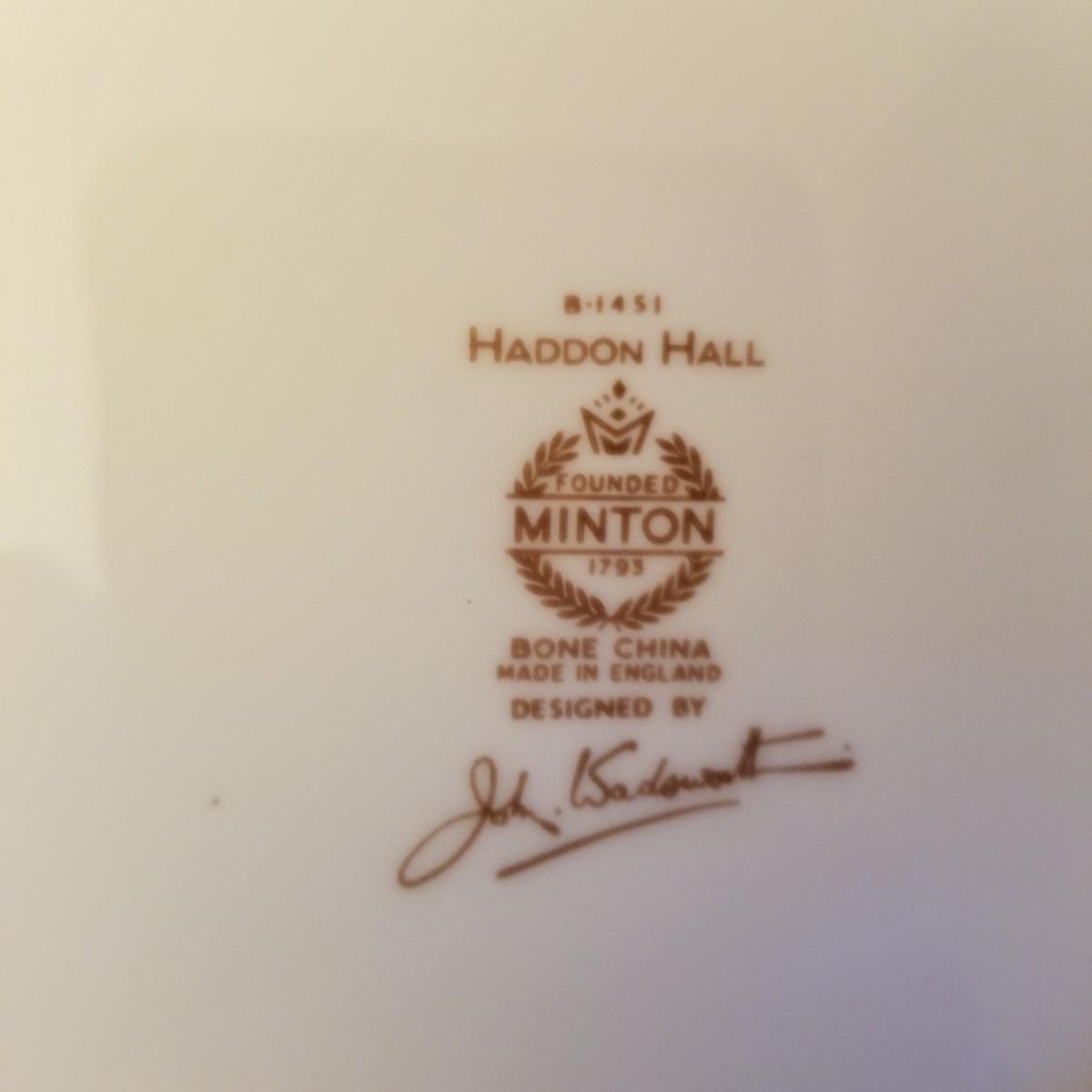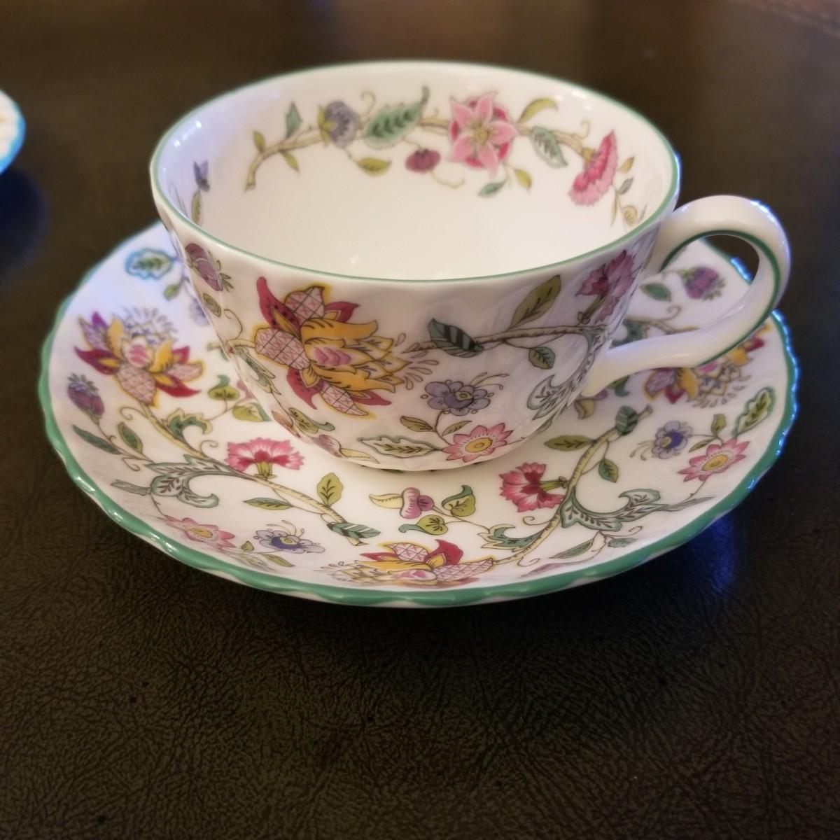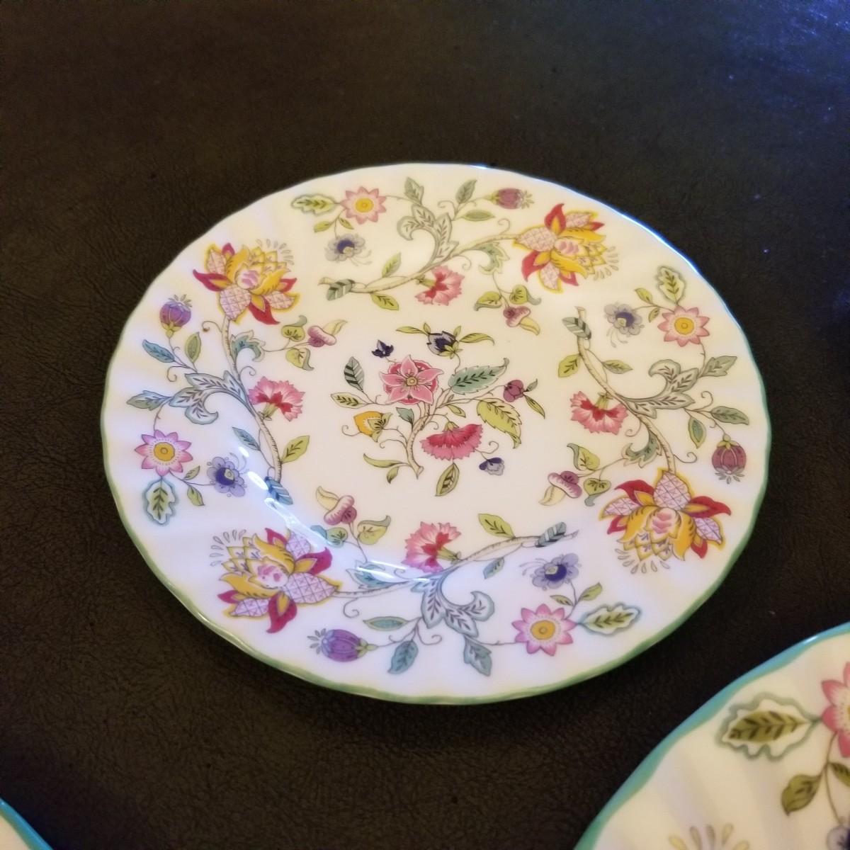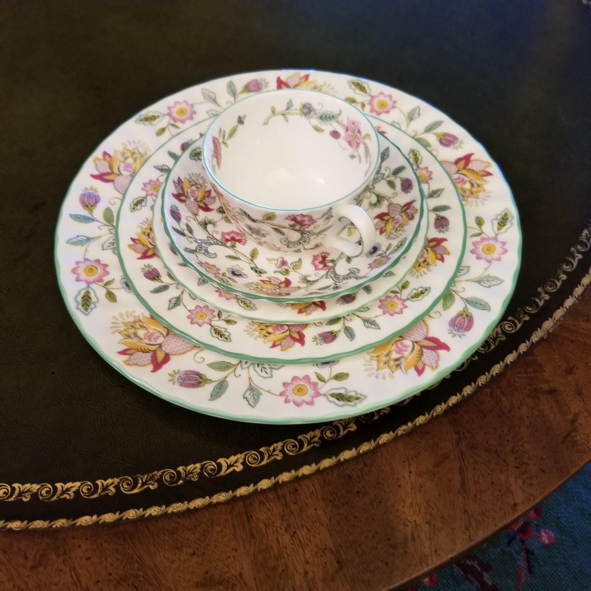 Lovely flower pattern china set. Minton by Haddon Hall has green rimmed swirled edges. Forty-four pieces total, they are as follows: dinner plates 9, salad plates 8, dessert plates 9, cups 9, saucers 9. All pieces in excellent condition. Items shown in hutch for clarity, hutch not included. Hutch listed as separate lot. See photos for details. Shipping available. Please call UPS for quote prior to bidding (828)252-6930
