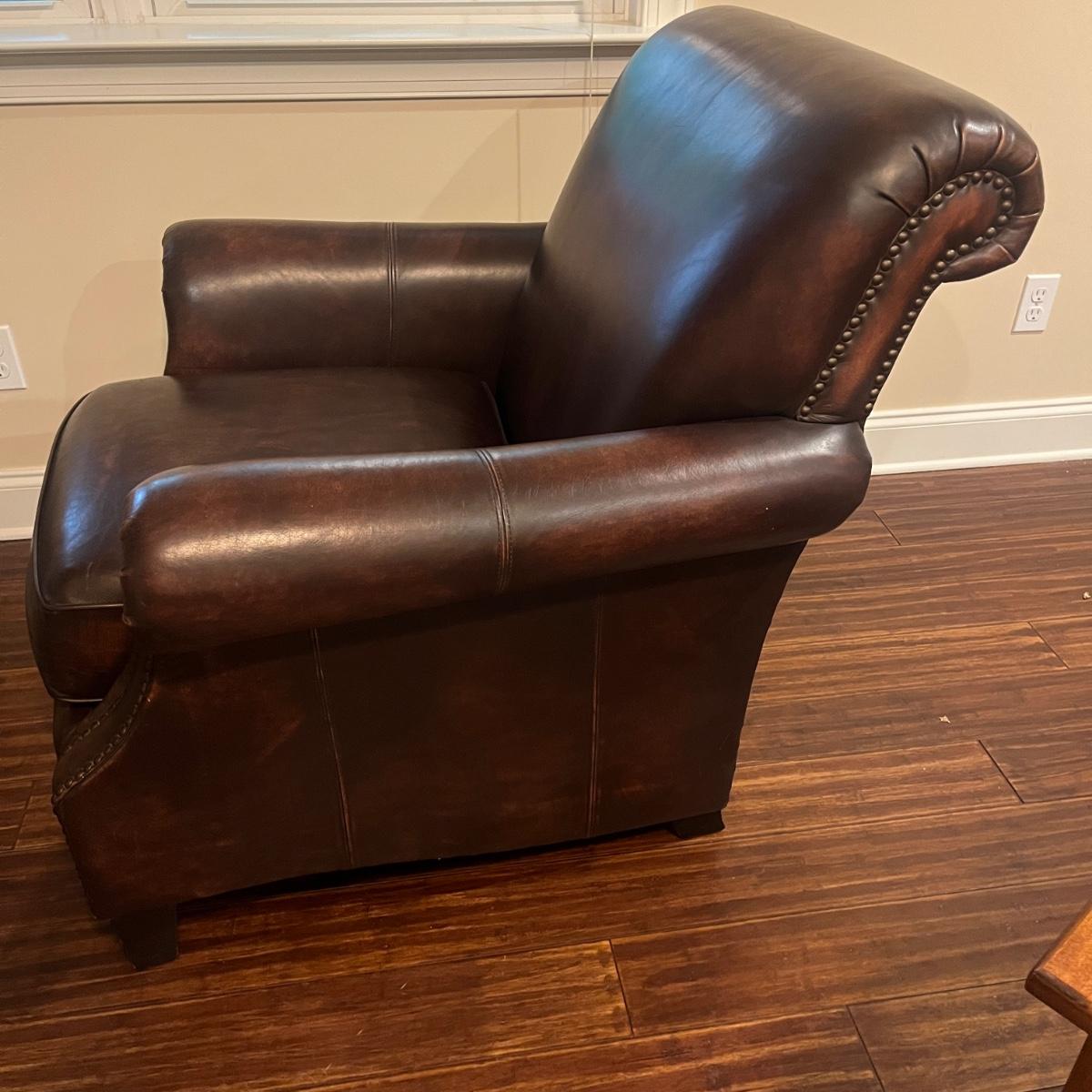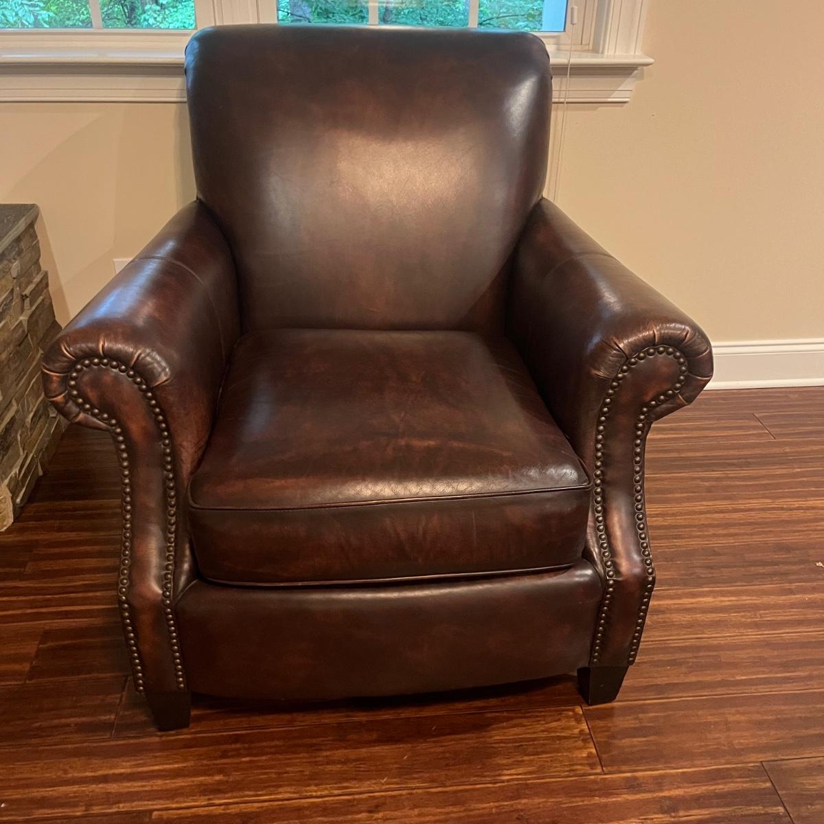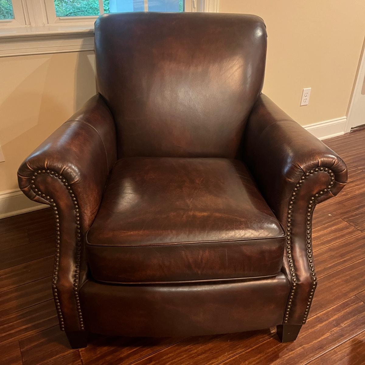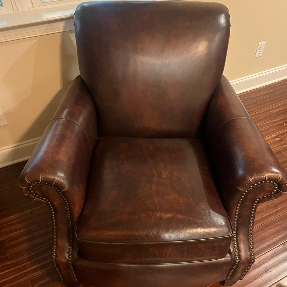 This plush Havertys leather chair has nail head accents and measures 37” x 37” x 36”H with a 20” seat height.