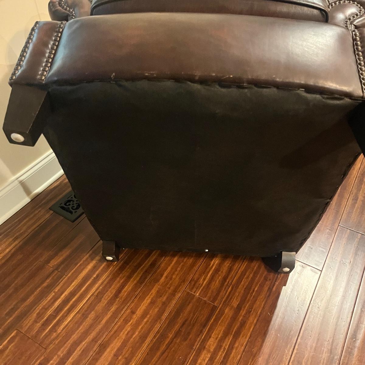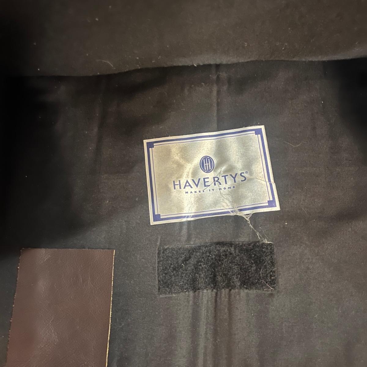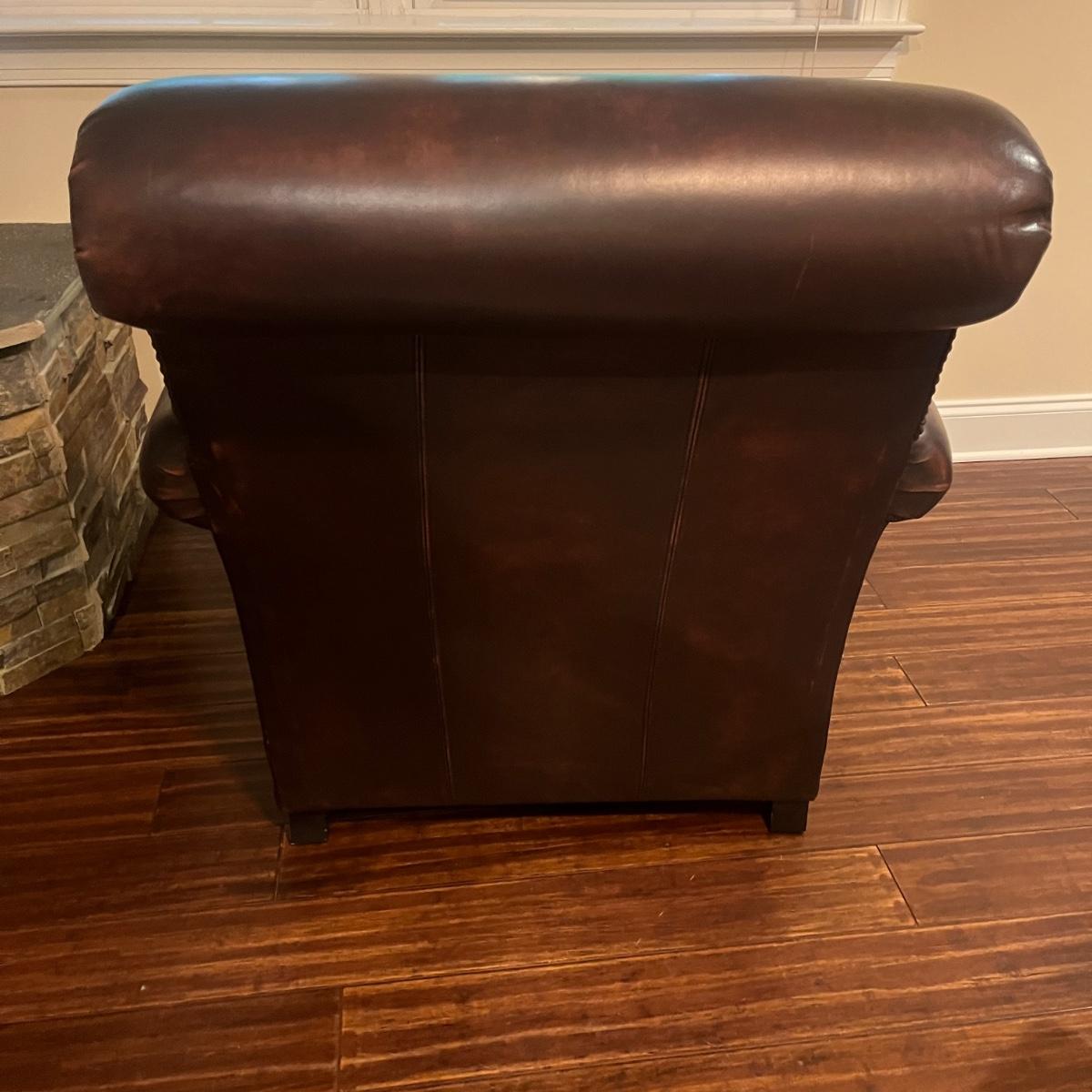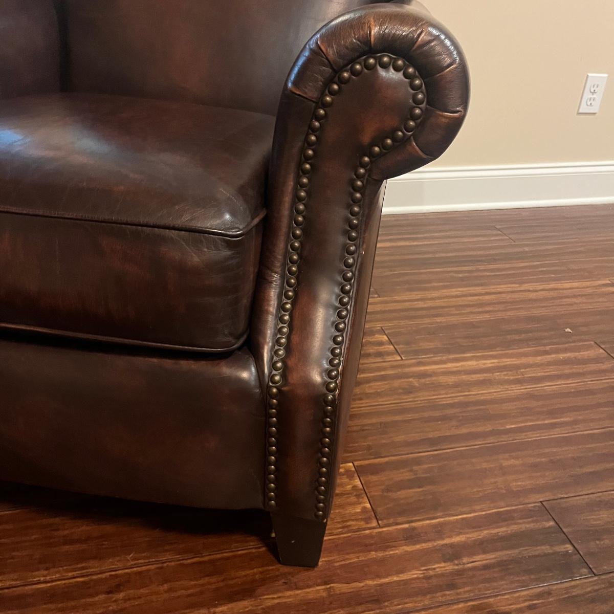 This plush Havertys leather chair has nail head accents and measures 37” x 37” x 36”H with a 20” seat height.
