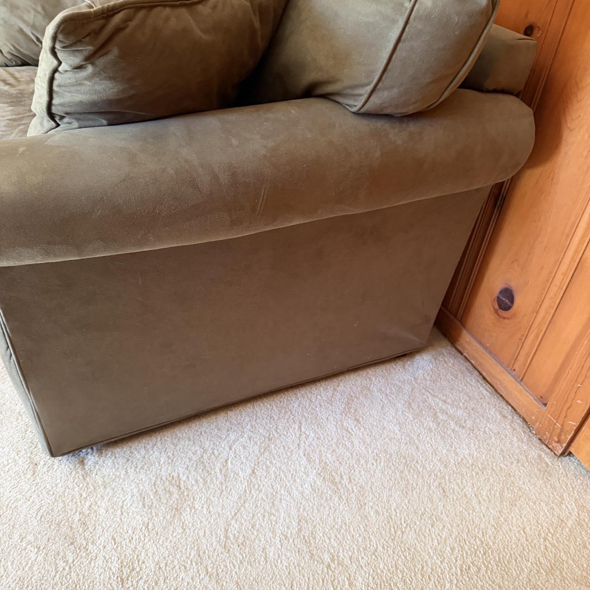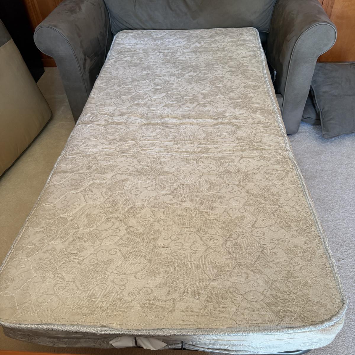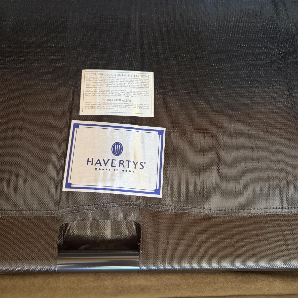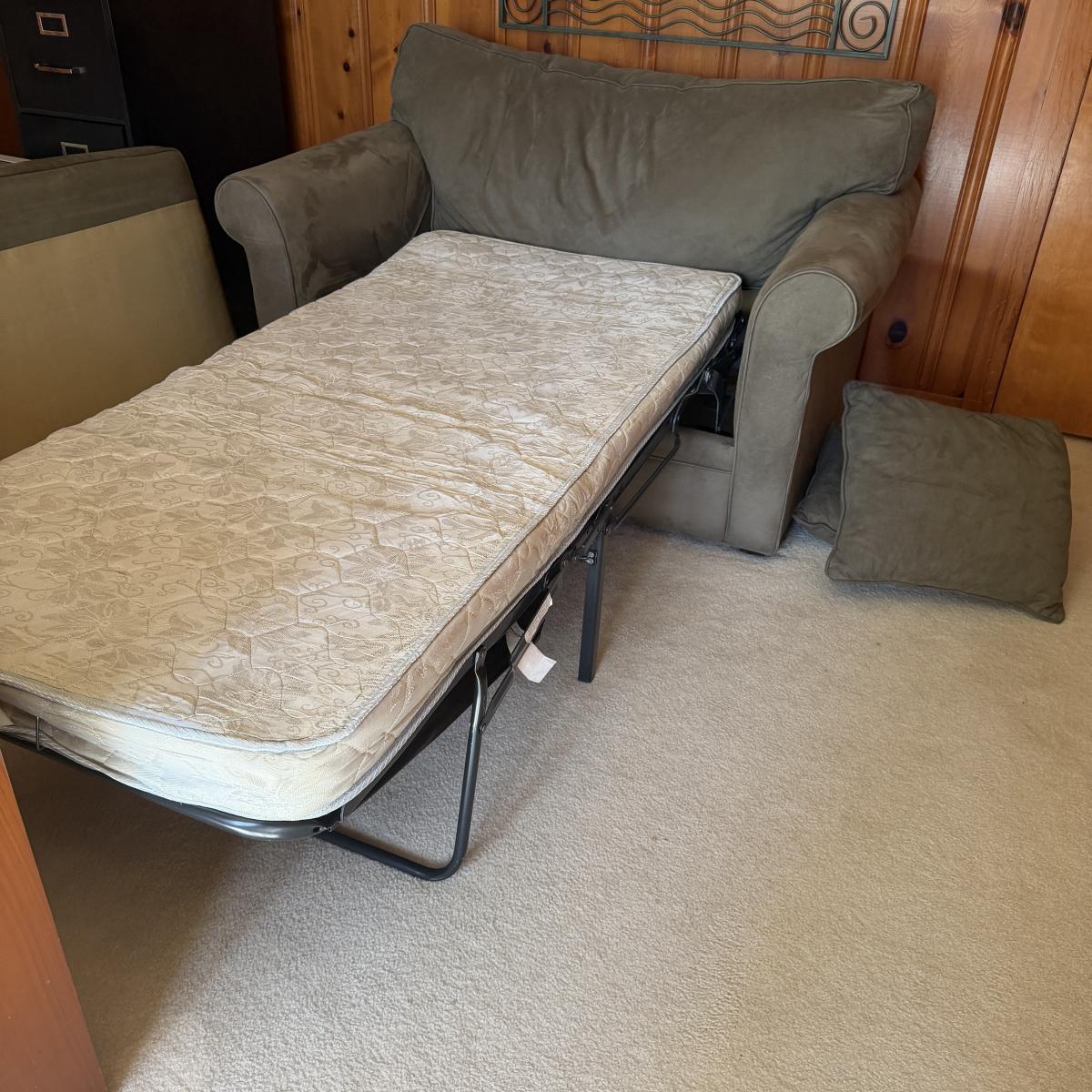 This Havertys love seat sleeper measures 56” x 38” x 37”H with a 18” seat height. Mattress measures 71” x 33” x 4”H. Cushion has spots, see pictures.