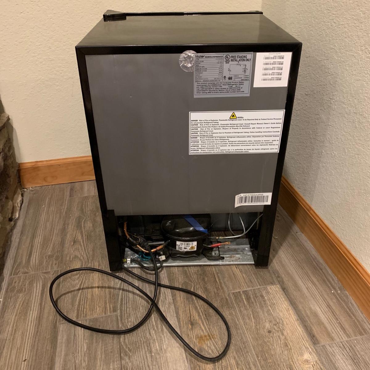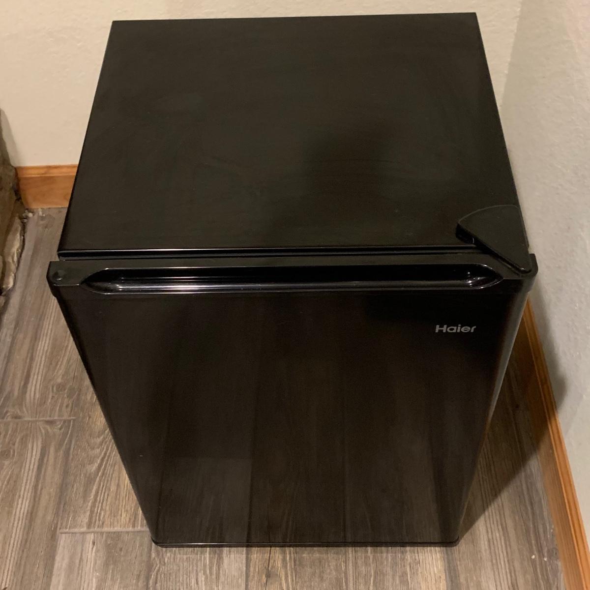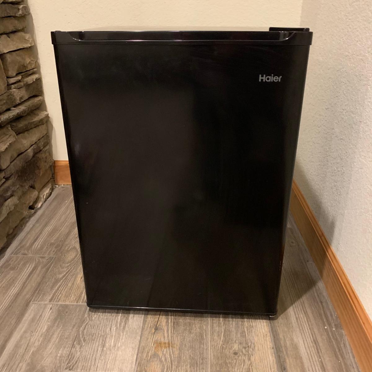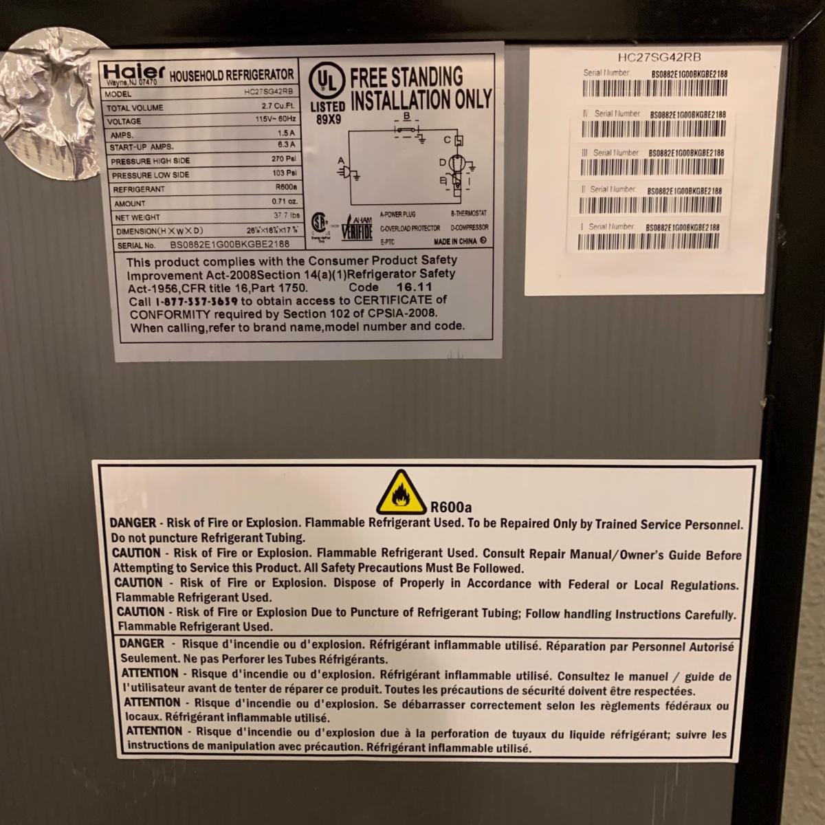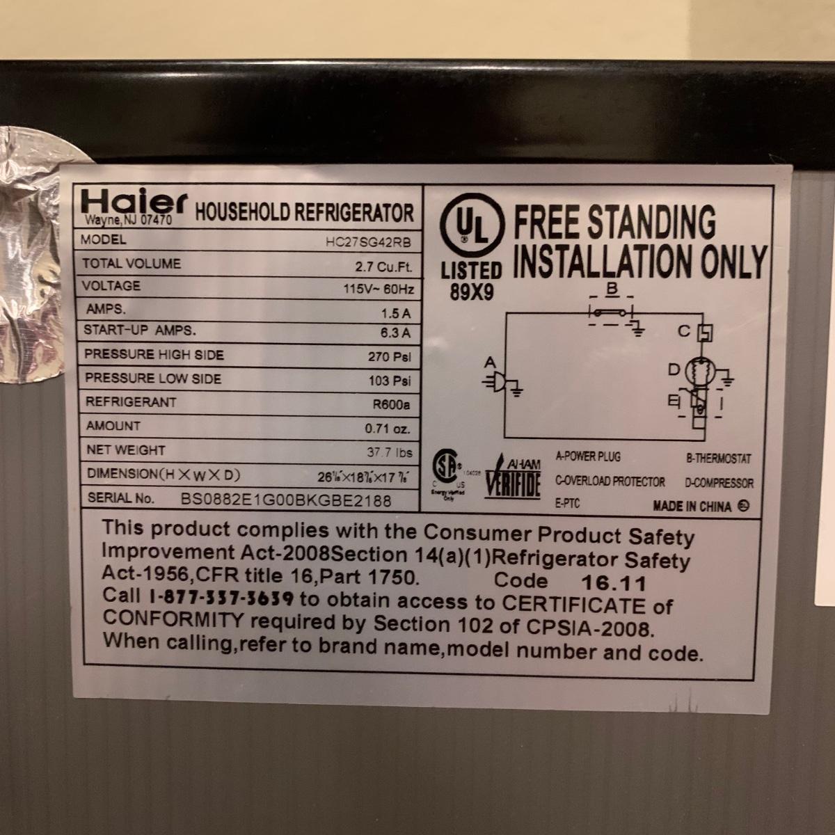 Haier 2.7 Cu. Ft. Household Refrigerator, Model HC27SG42RB. Measures 18.75” x 17.75” x 25.75”. Refrigerator functioned when tested and seems to be in good condition. Please note that this is a mini fridge, not a full sized fridge.