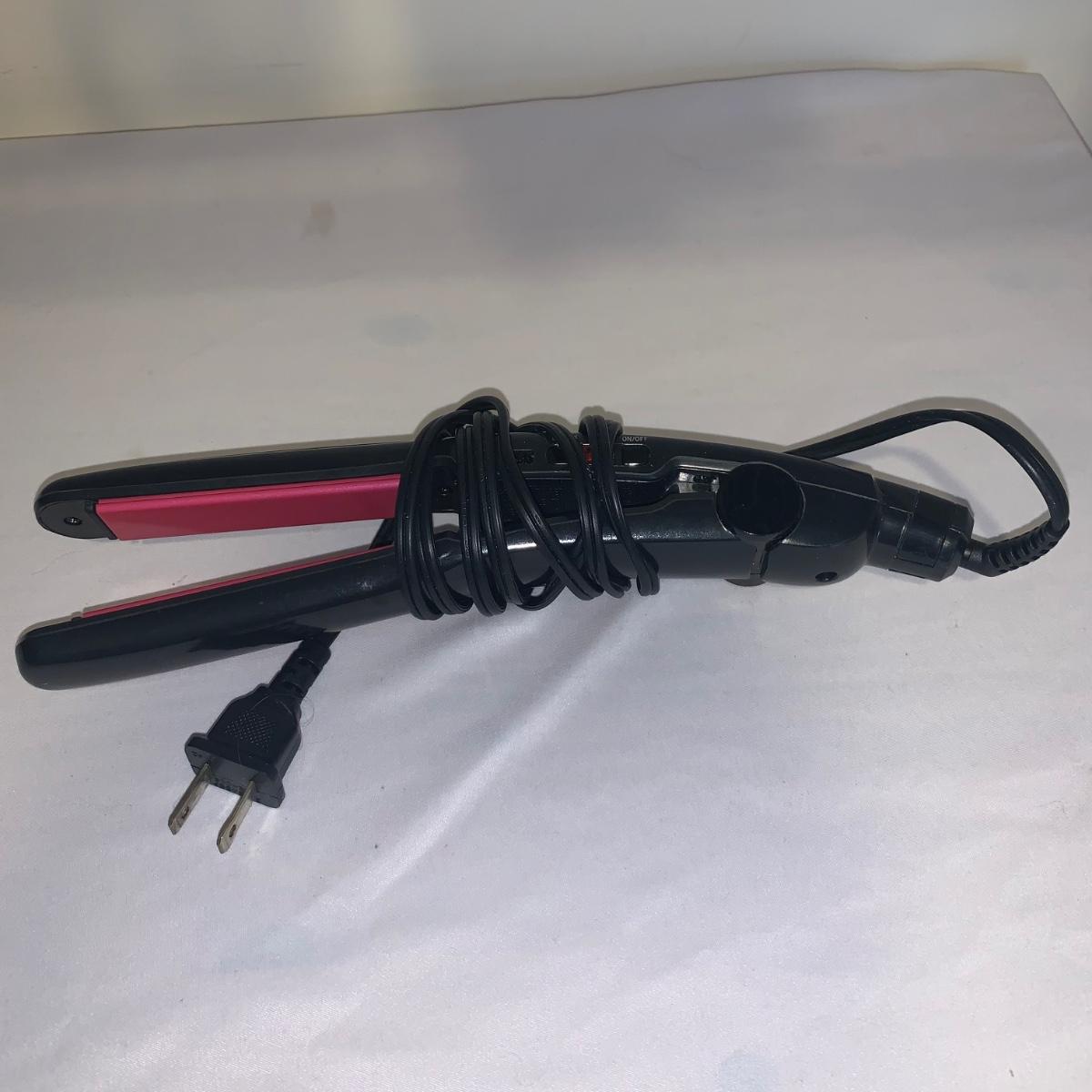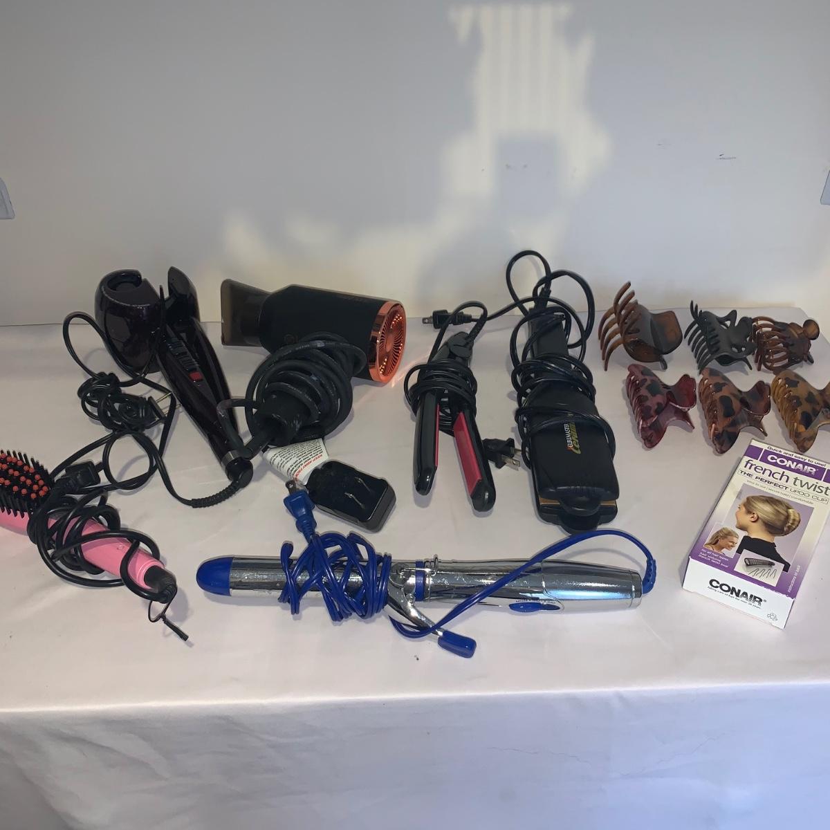 This lot includes 6 hair tools and 7 hair clips. Included in the hair tools is a Conair straightener, a Shrate blow dryer, an Infiniti Pro Conair Curler, a hot brush, a Revlon curling wand, and a Ceramics Curlmaster. Tools have been tested and can confirm that they all turn on. The Shrate blow dryer has what seems to be paint stains on it. Shipping available.