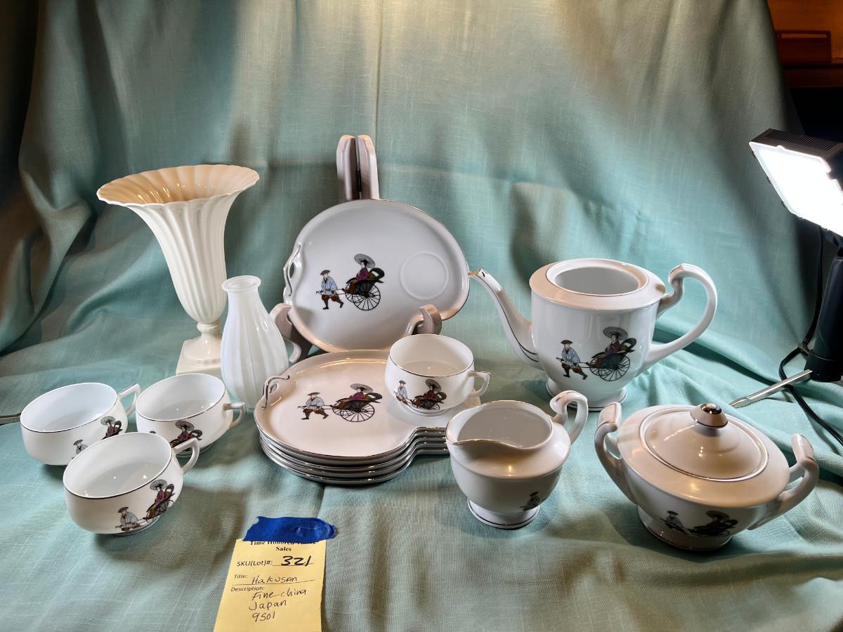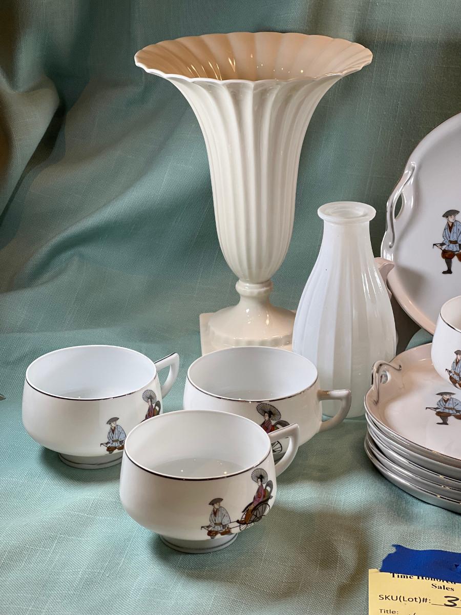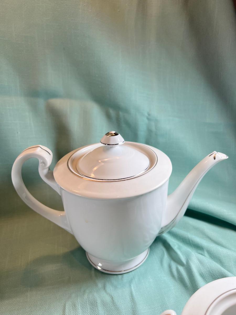 Fine bone china fluted vase, small white glass bud vase. Set of 6 shaped plates with raised cup area, Tea pot and sugar bowl, only 1 lid, creamer, and pitcher.. White with Silver accent.