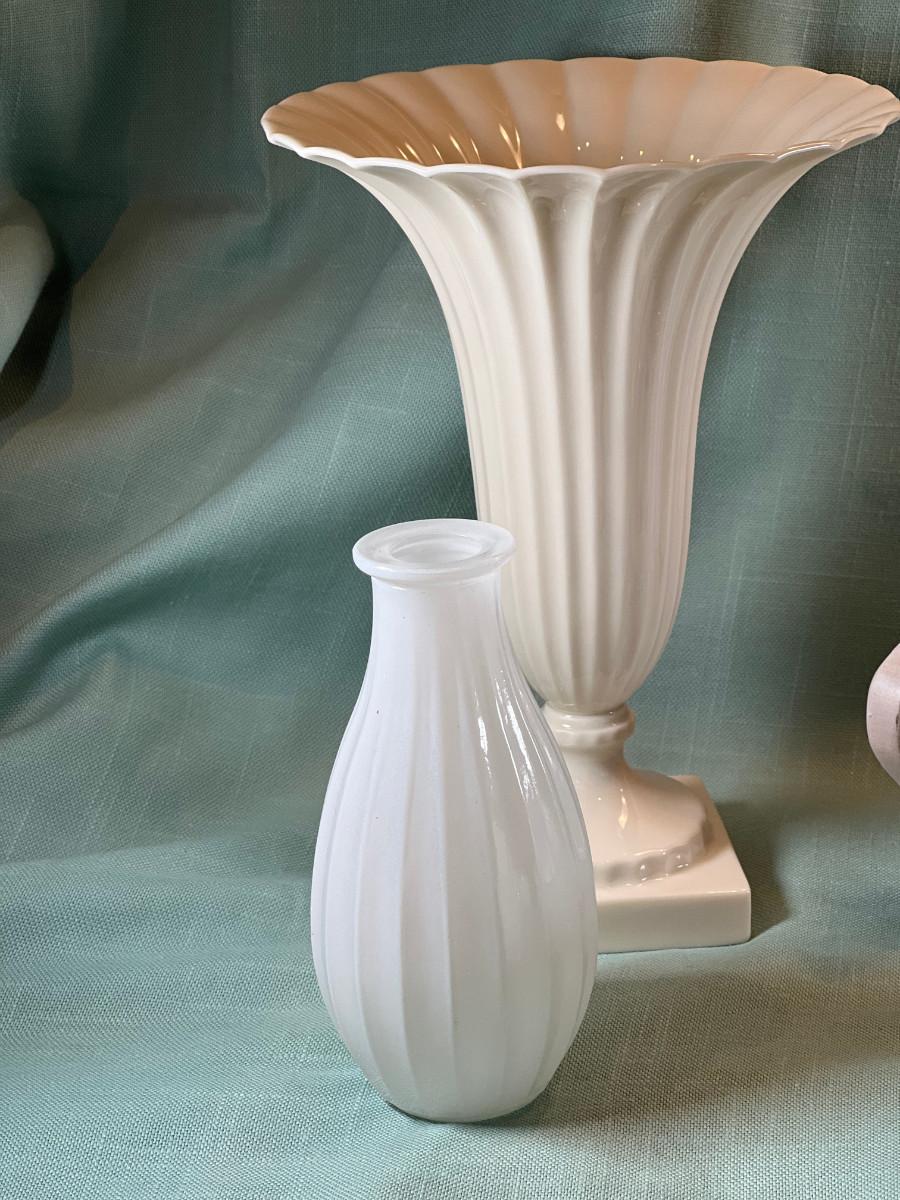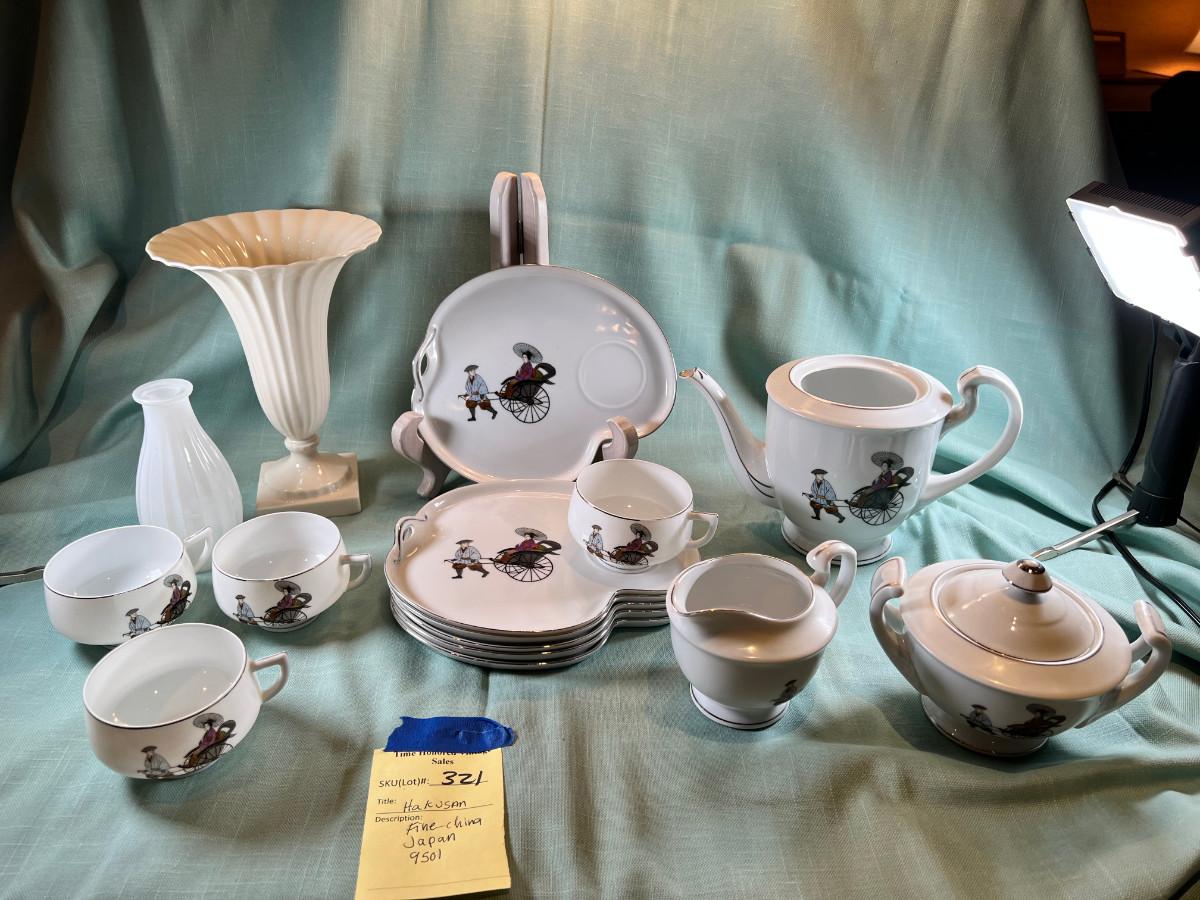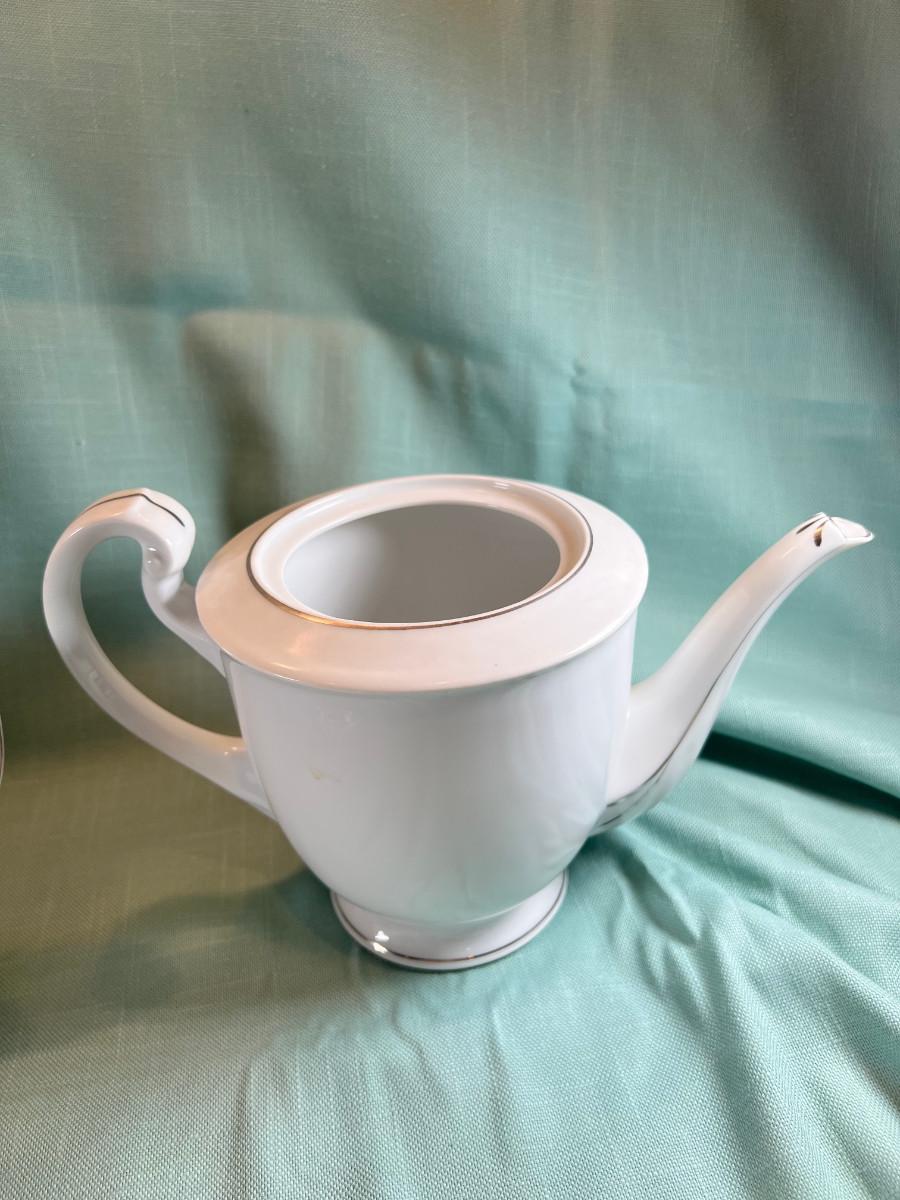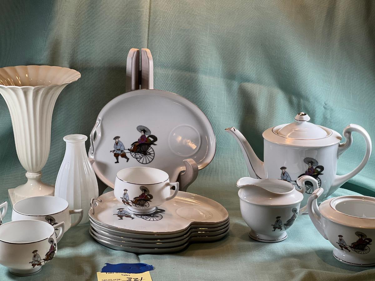 Fine bone china fluted vase, small white glass bud vase. Set of 6 shaped plates with raised cup area, Tea pot and sugar bowl, only 1 lid, creamer, and pitcher.. White with Silver accent.