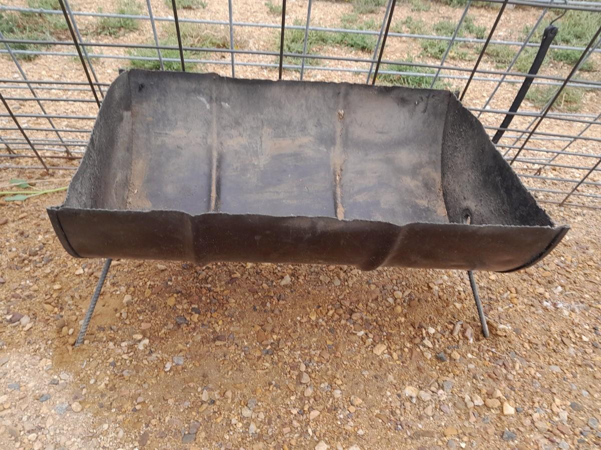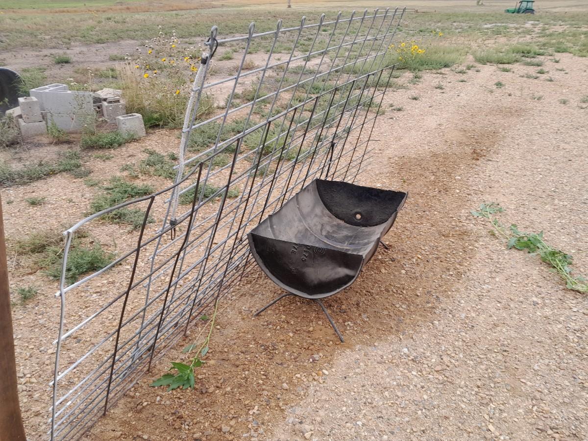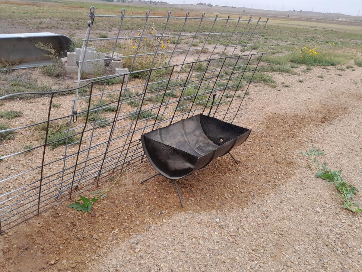 HALF BARREL FEED BUNK AND TWO PARTIAL HOG PANEL FENCING PIECES