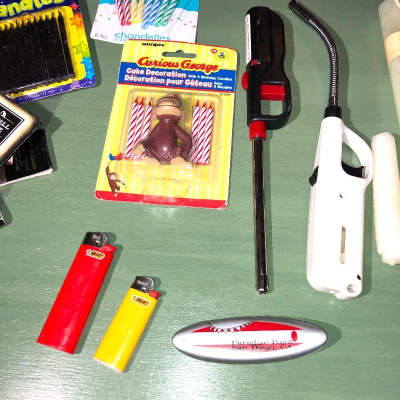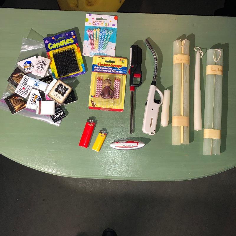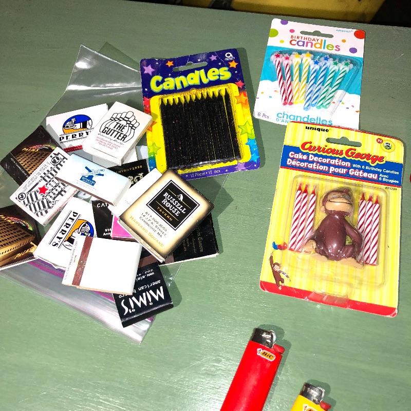 Drawer includes 5 Butane lighters, beautiful candles and various match books