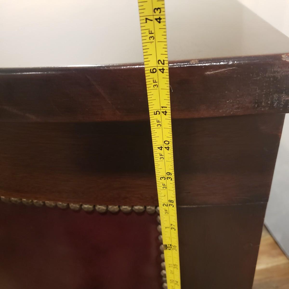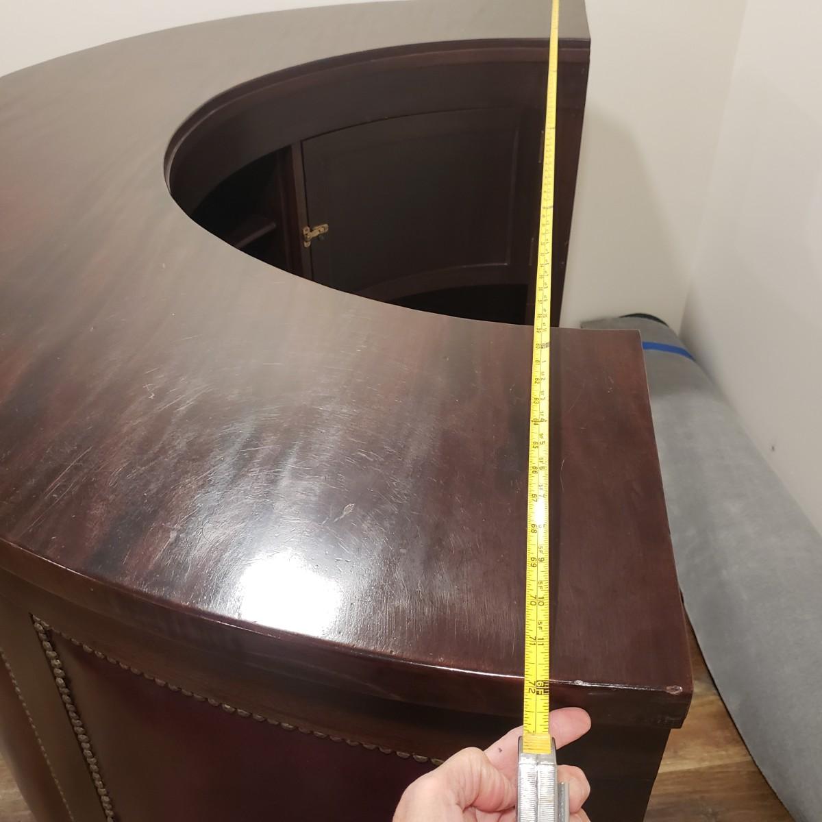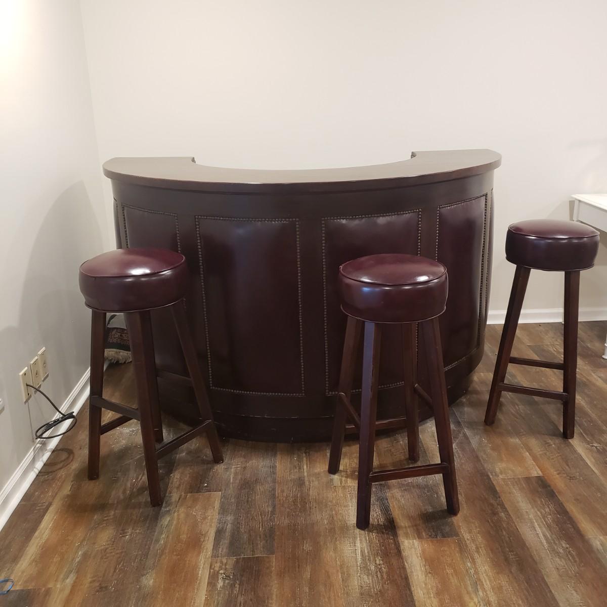 This is a free standing bar with three stools. The stools measure 14" x 33"H. They match the bar with a deep burgundy leather like upholstery and dark wood stain. One stool leg is loose, see pictures. The bar panels are covered with a leather like material in a similar color as the stools. The bar measures 72" x 42" H. There are some scuffs on the bottom rim of the bar, see pictures.