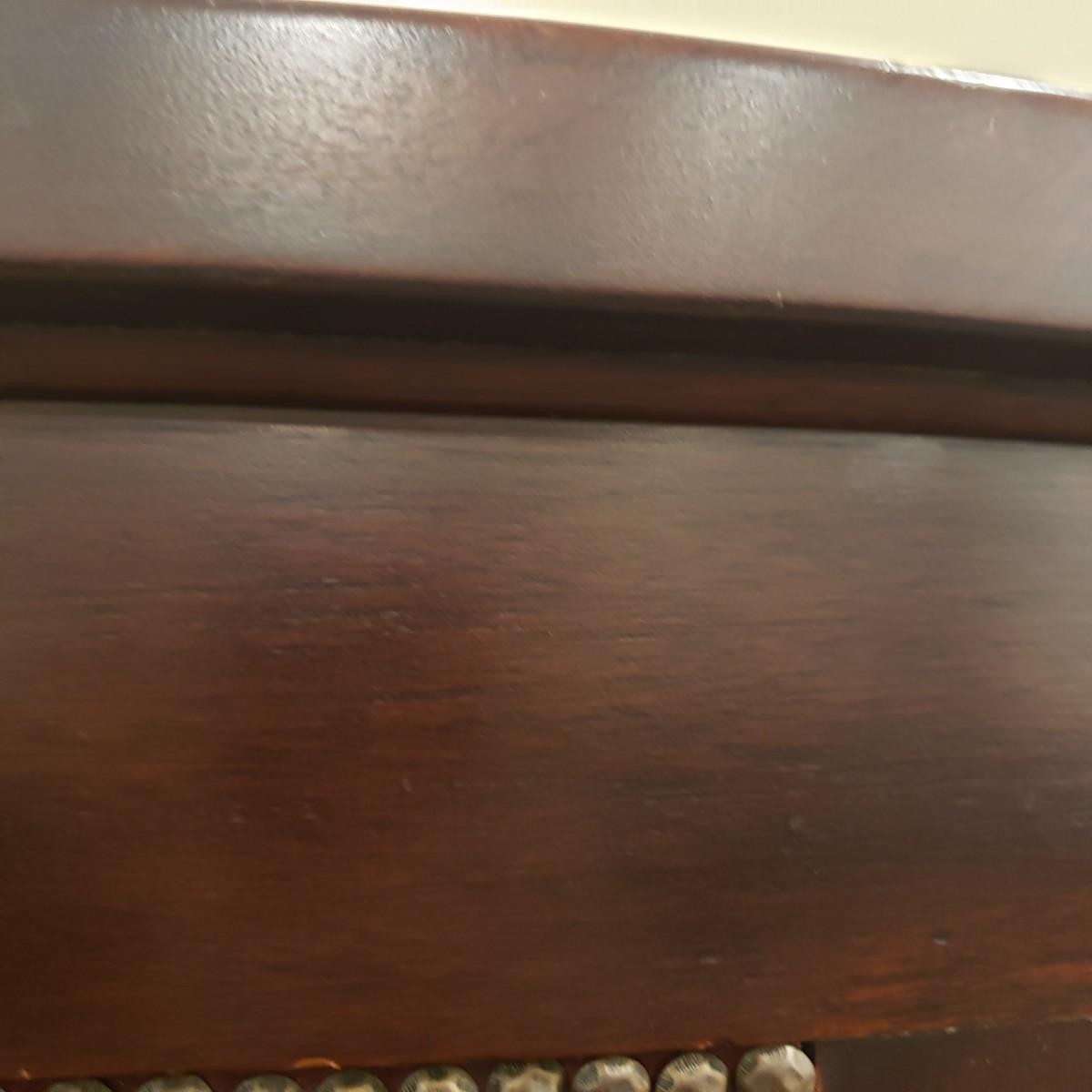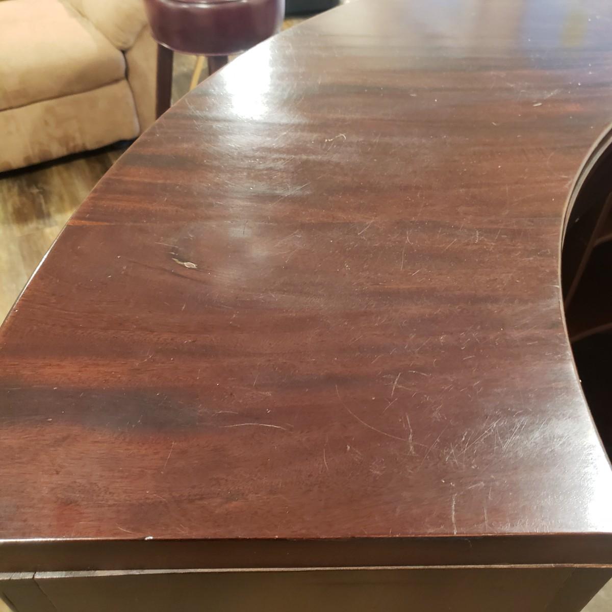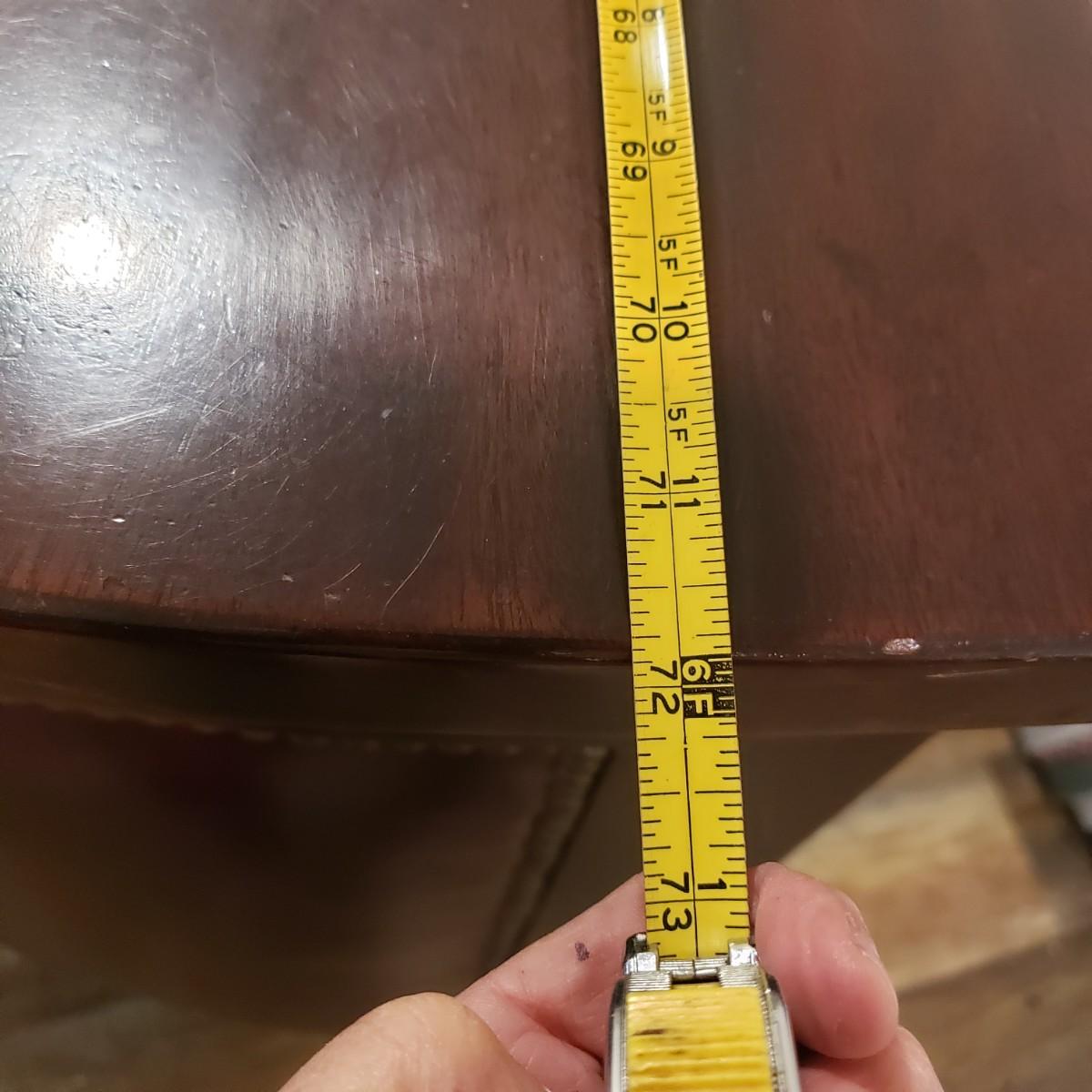 This is a free standing bar with three stools. The stools measure 14" x 33"H. They match the bar with a deep burgundy leather like upholstery and dark wood stain. One stool leg is loose, see pictures. The bar panels are covered with a leather like material in a similar color as the stools. The bar measures 72" x 42" H. There are some scuffs on the bottom rim of the bar, see pictures.