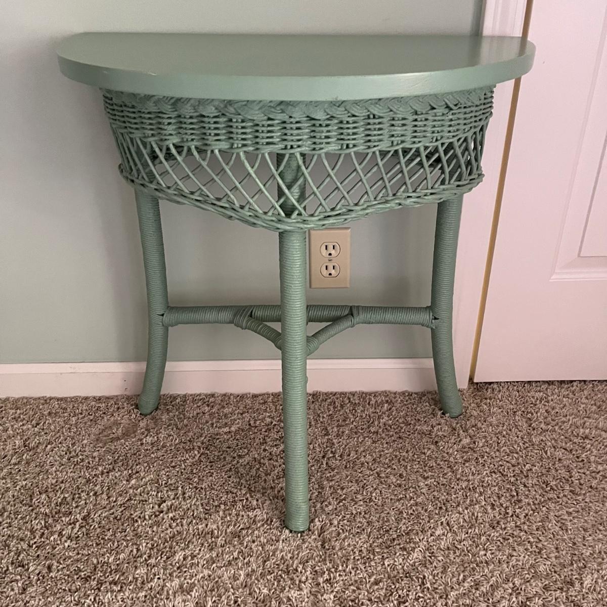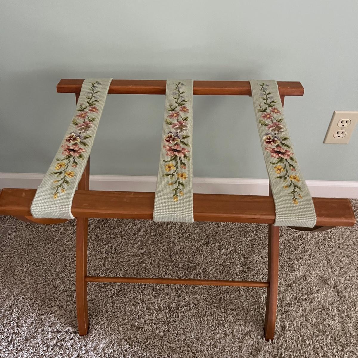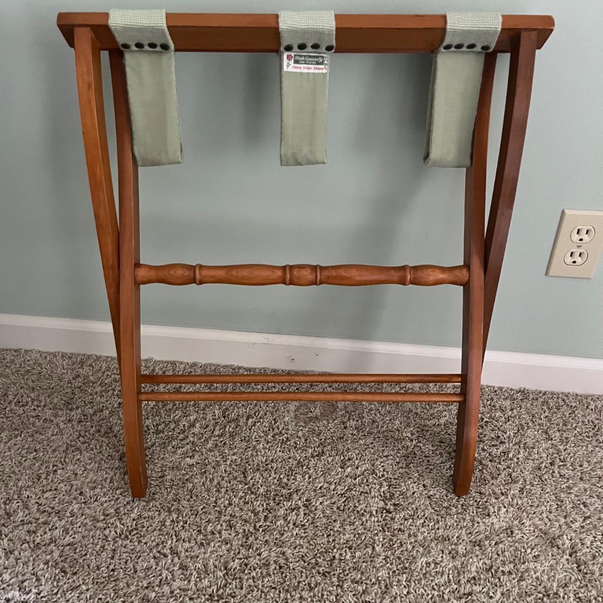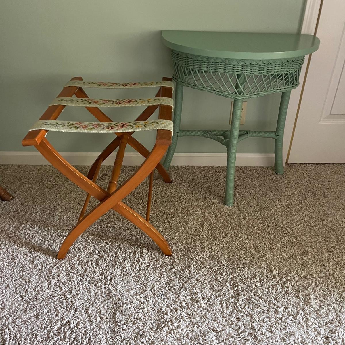 Lot includes a half round wooden table with wicker trim and à suitcase stand with embroidered straps. Table measures 12” x 24” x 25”H.