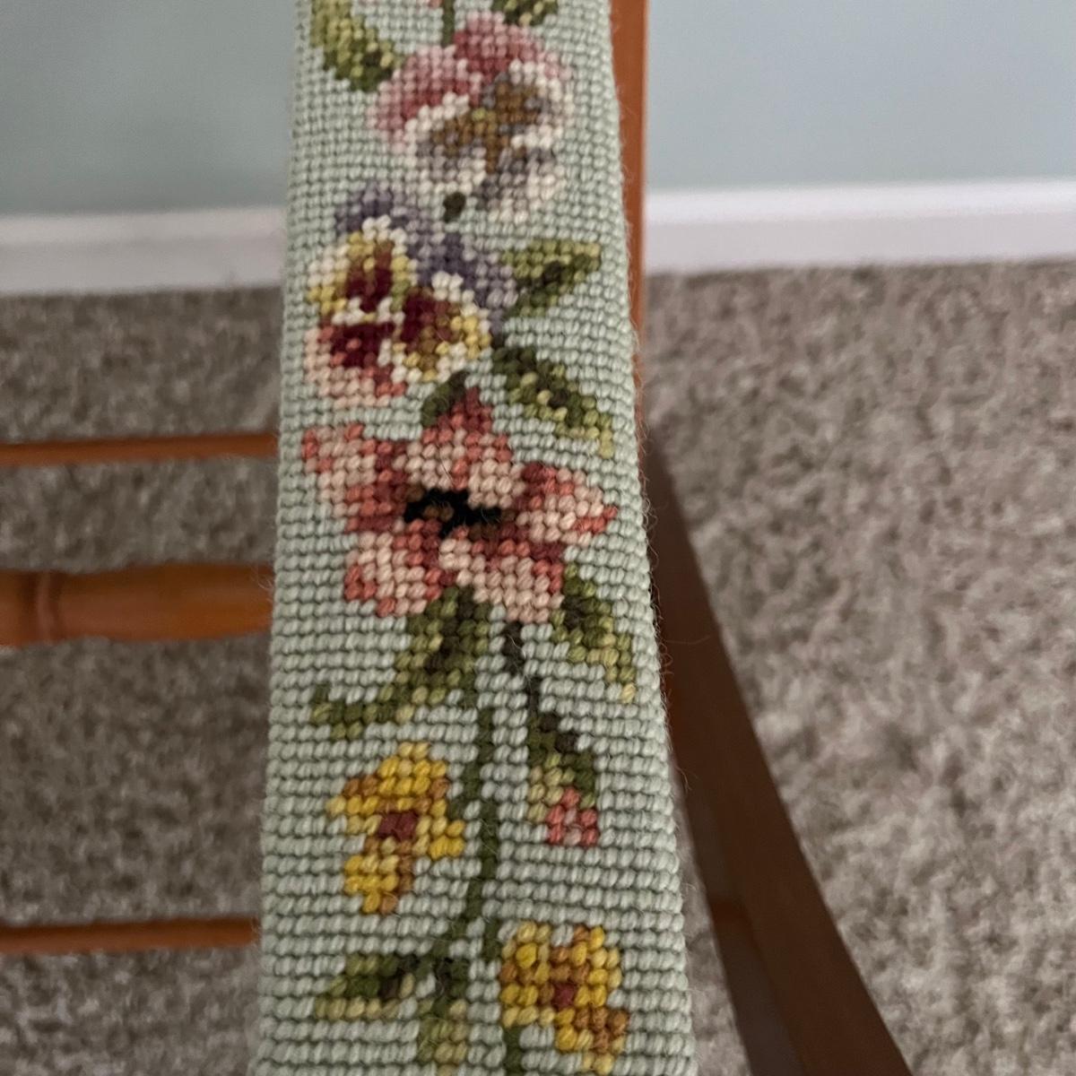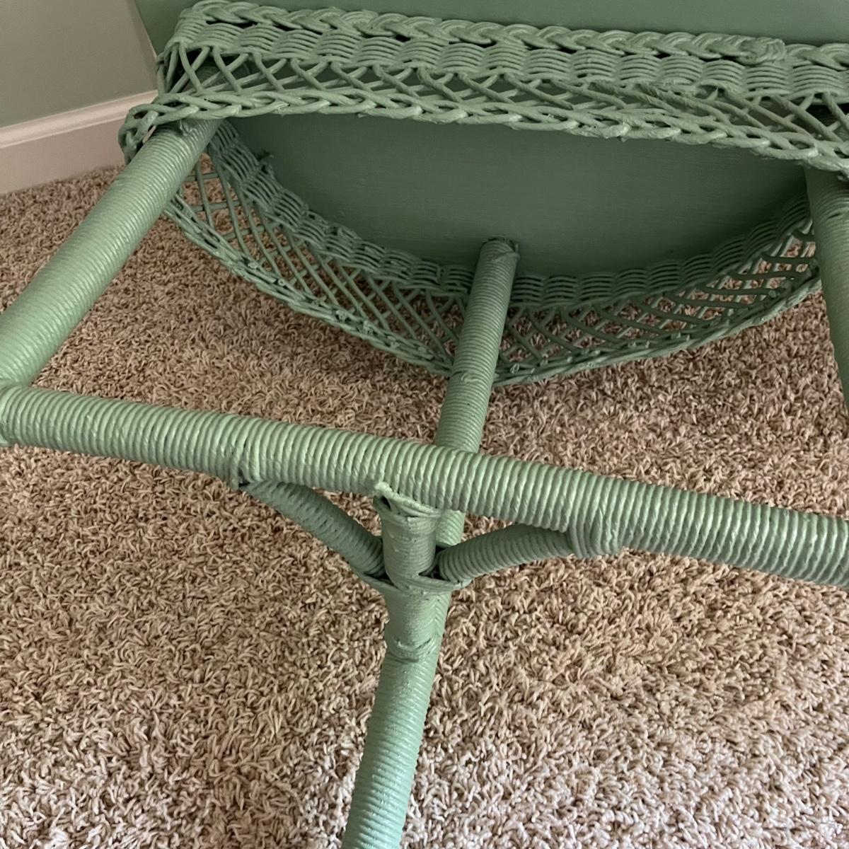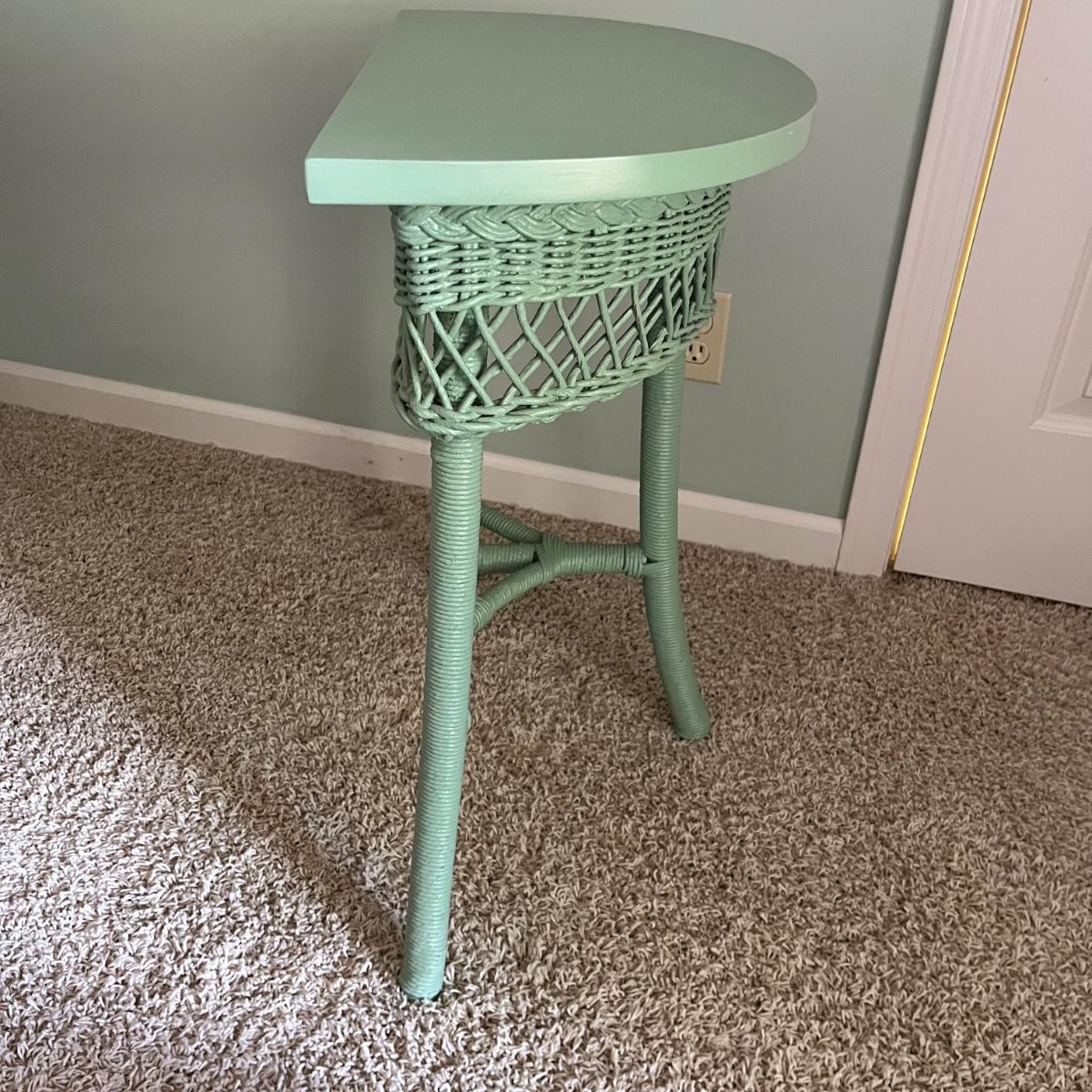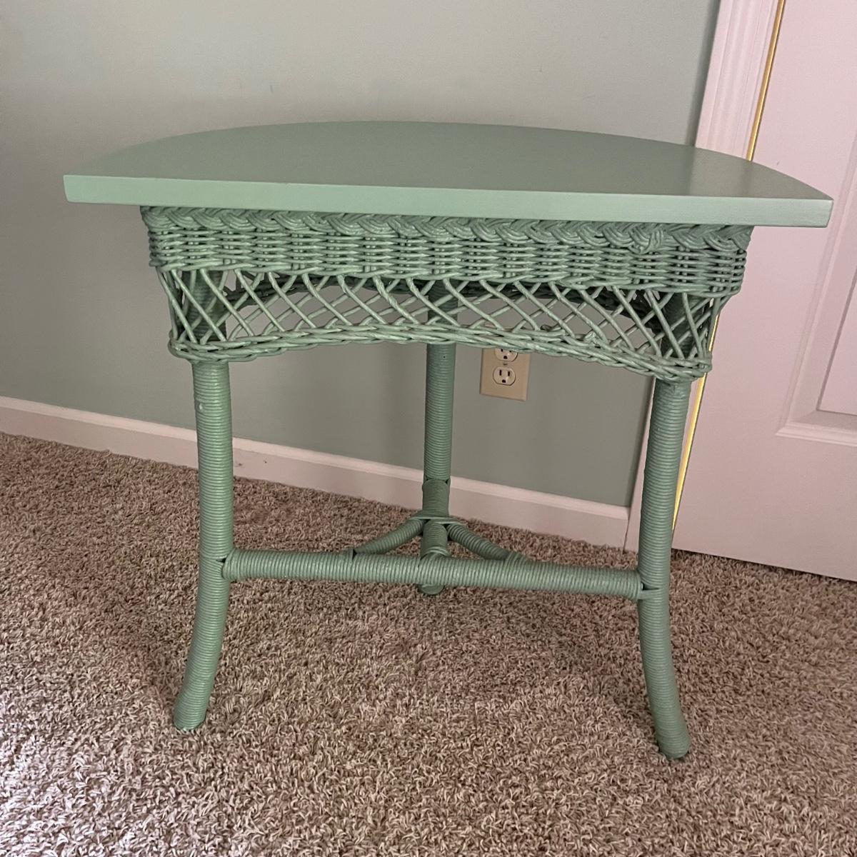 Lot includes a half round wooden table with wicker trim and à suitcase stand with embroidered straps. Table measures 12” x 24” x 25”H.