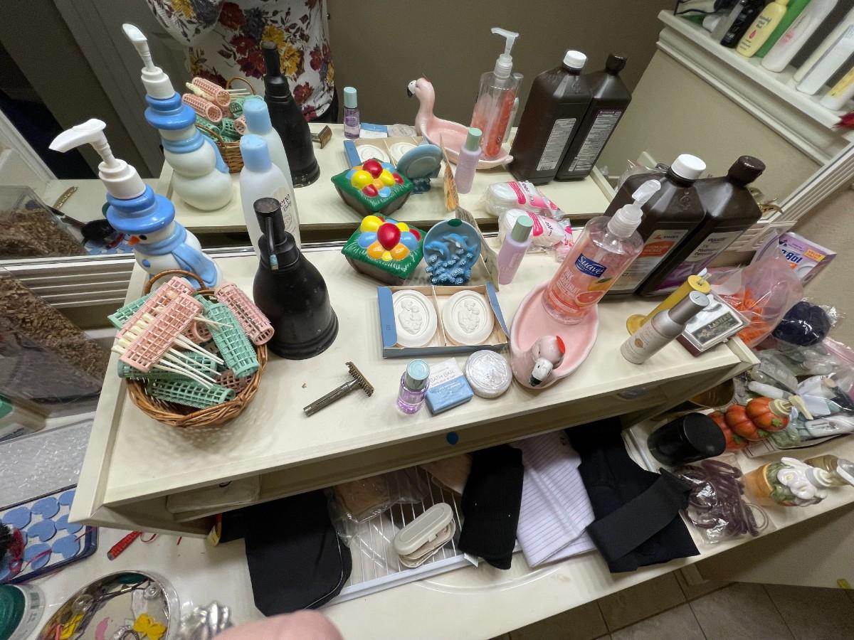This lot includes curlers and miscellaneous bath products, including some seasonal soap dispensers and some decor.