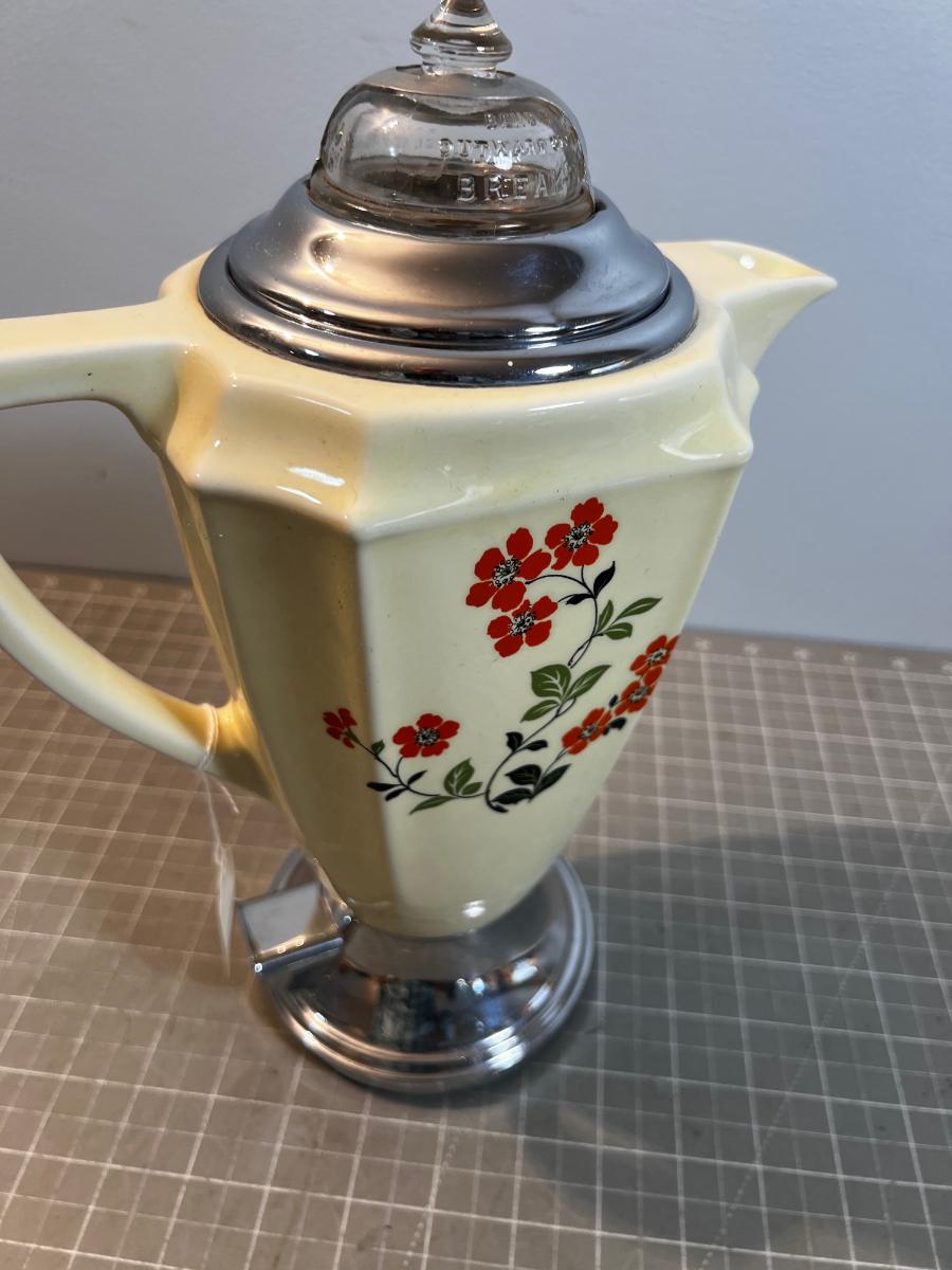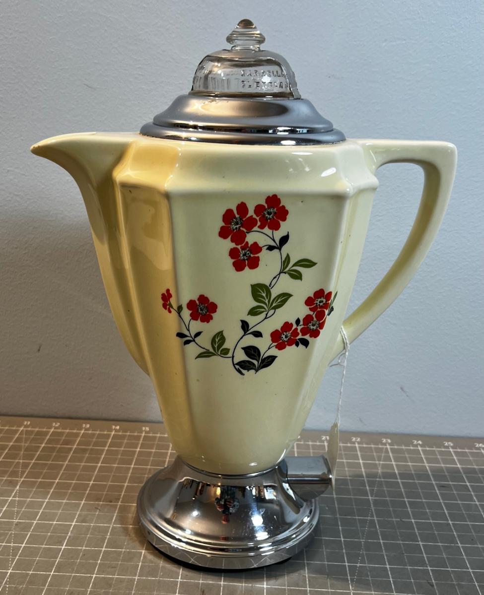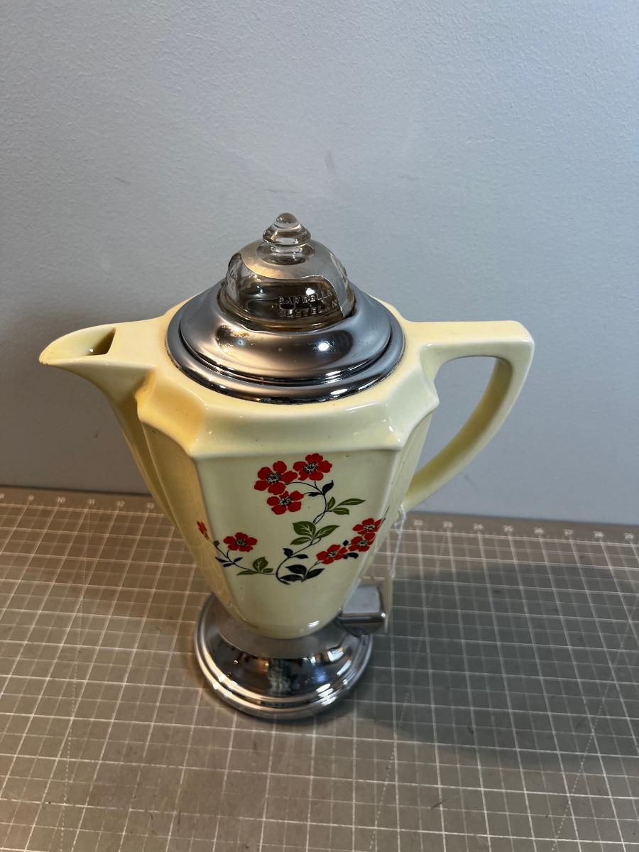 Has a cord - not tested. A couple of very very light chips on the spout. Good Condition Appearance. Not tested. Glass Top. Please Bring Paper and Boxes.