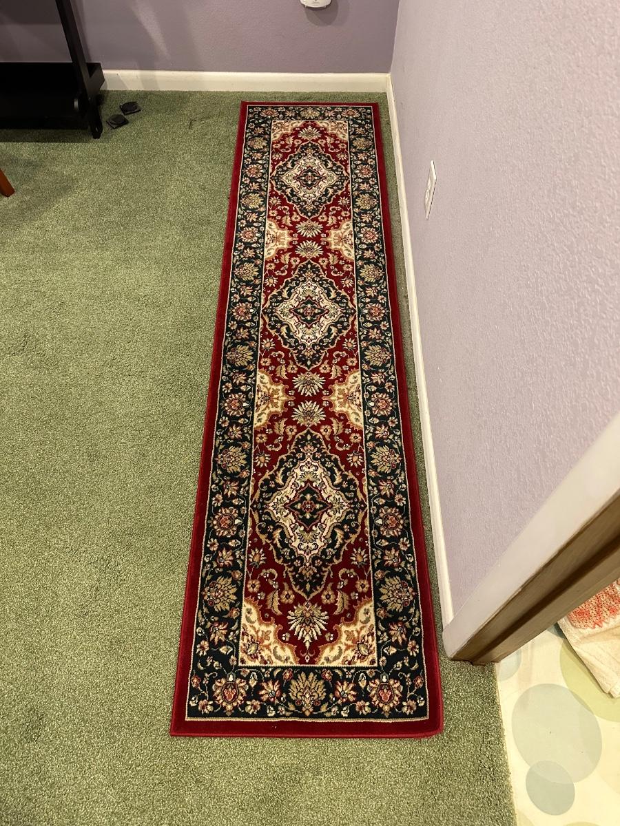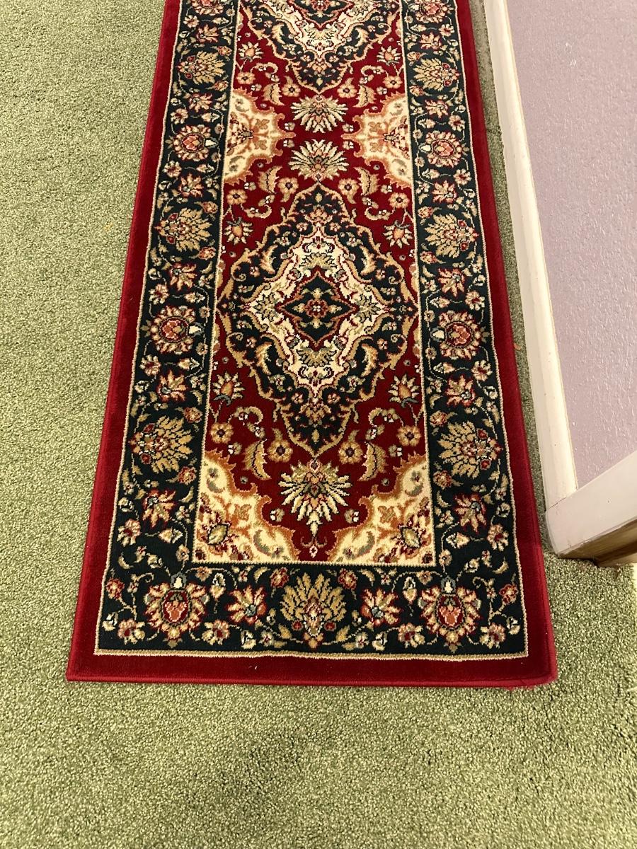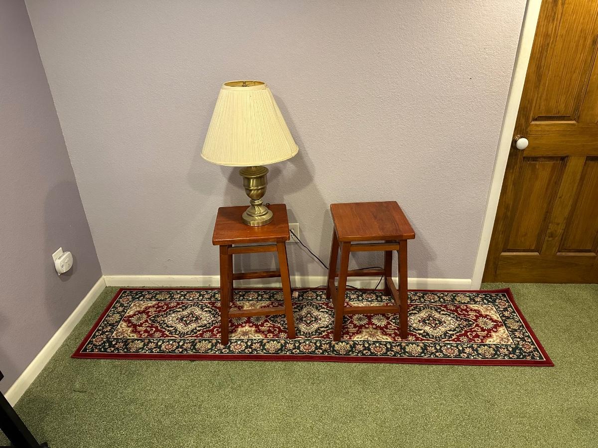 HALL RUNNER RUG, 2 STOOLS AND A TABLE LAMP