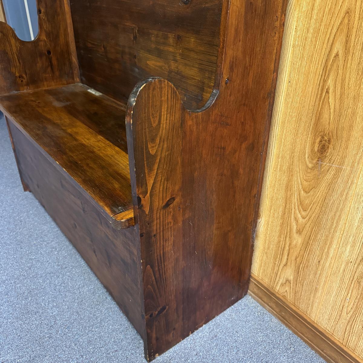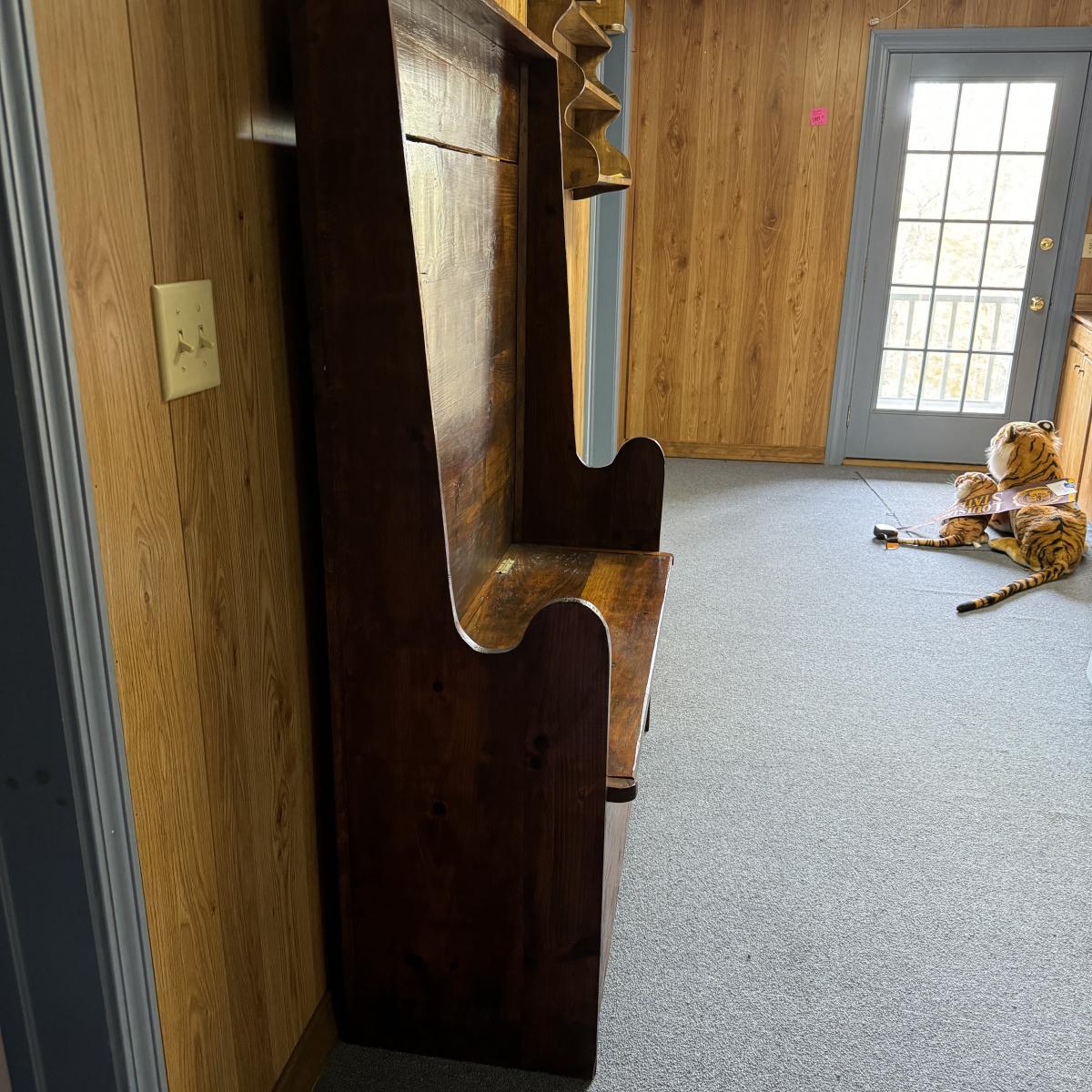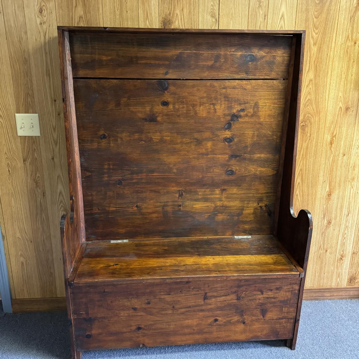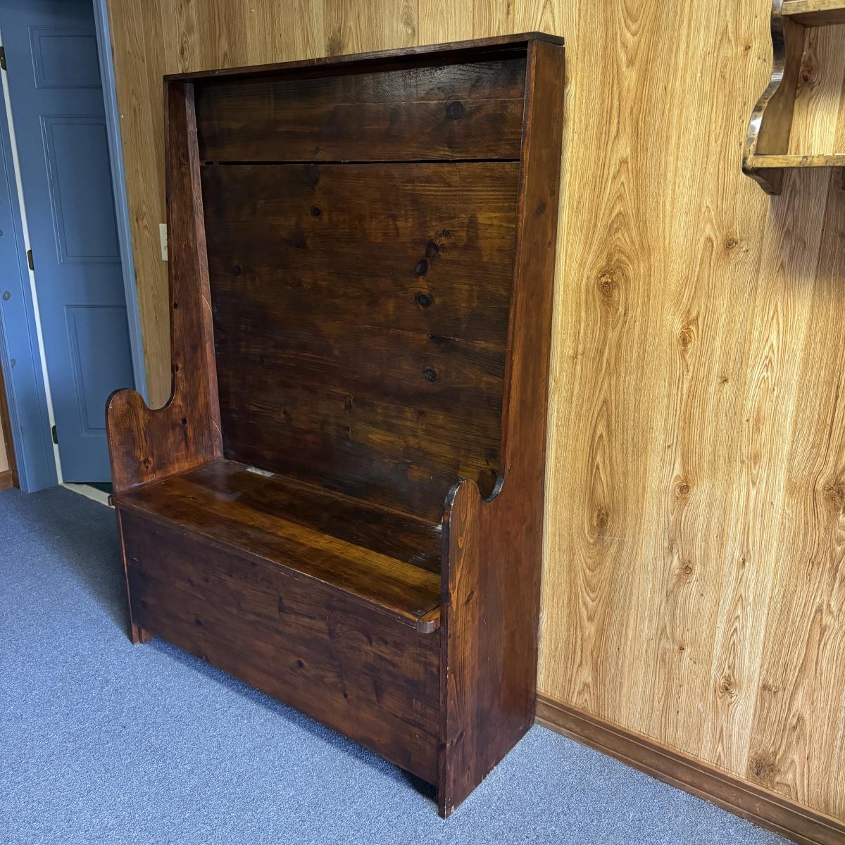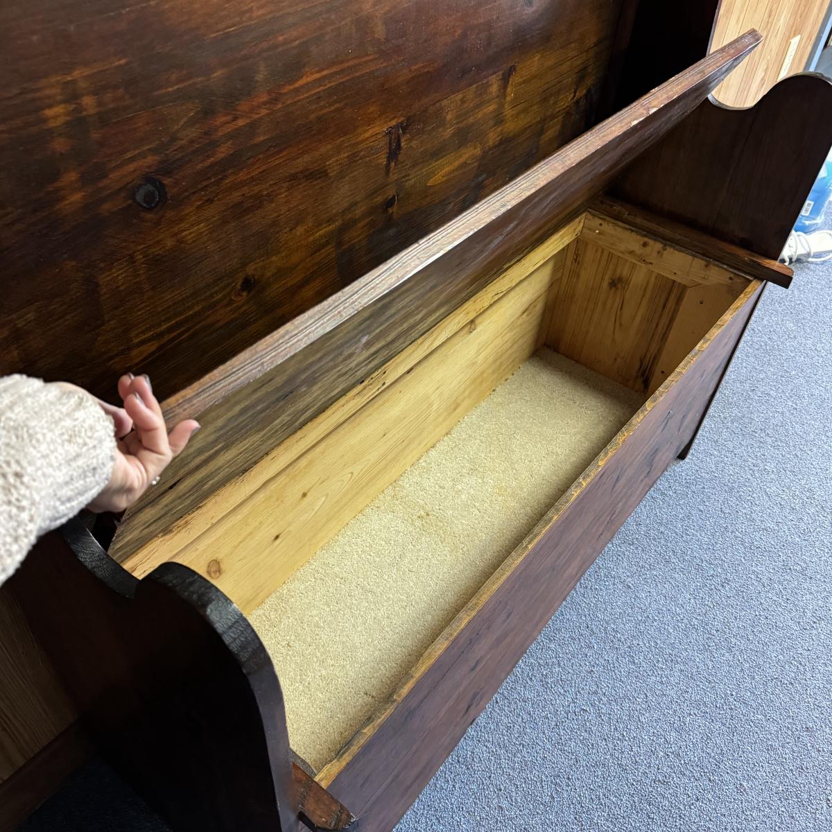 Wooden hall storage bench. Has a tall back that could hold jackets and backpacks IF you add hooks. Seat opens to a nice large storage area that has a removable piece of carpet, see pictures. The back has a split in the wood that goes all the way across. On the back of the piece you will find a metal piece with two hooks attached. Piece measures 47” x 18” x 65” H. Bench seat height is 20”. Local pick up only. Winning bidder must bring assistance to help move and load this item due to its weight and/or size, as you will need to move it up a flight of stairs.