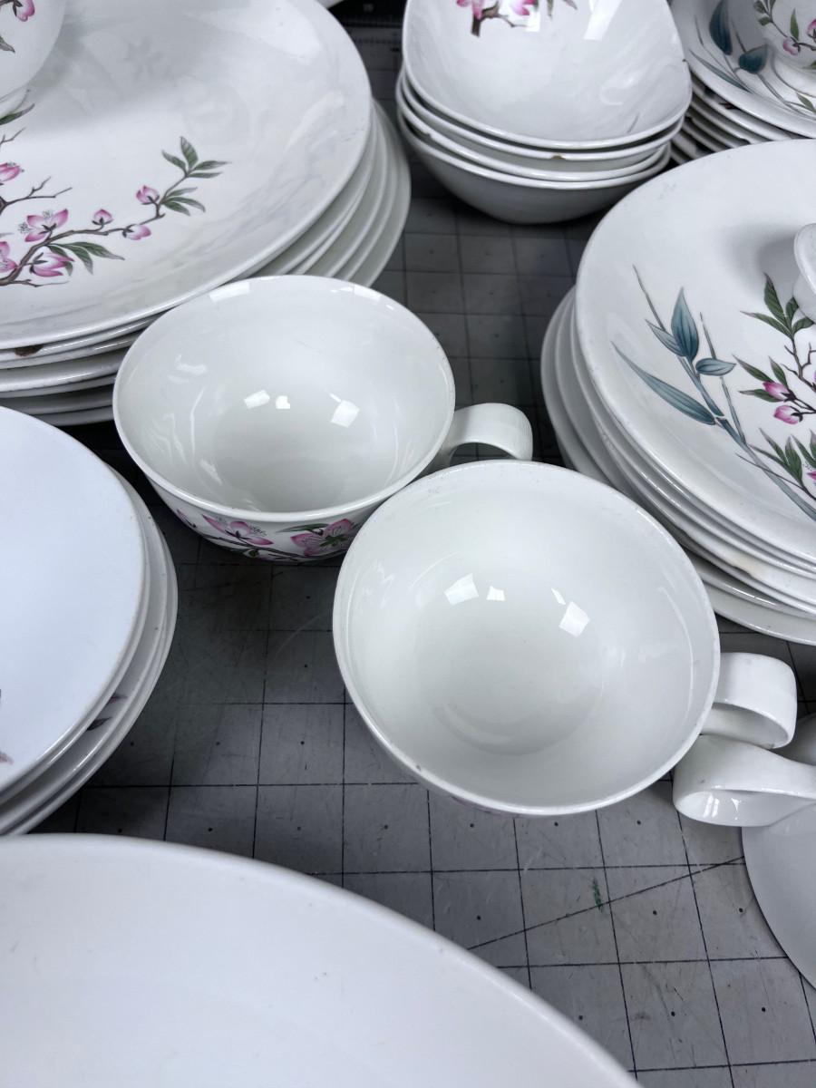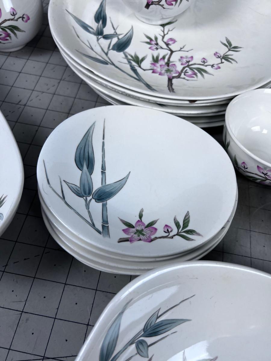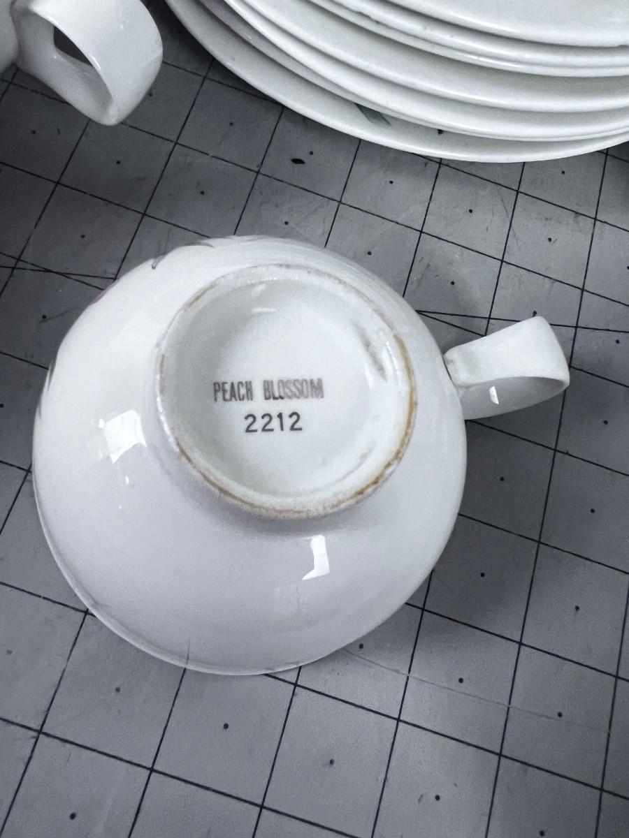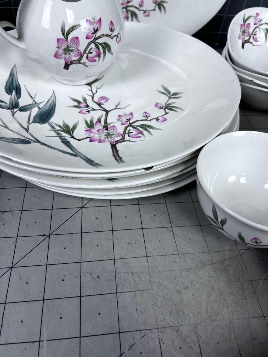 Several pieces have chips or damage. However this is a really great set of China. Some Pieces missing. What you see is what you get. Patter Peach Blossom.