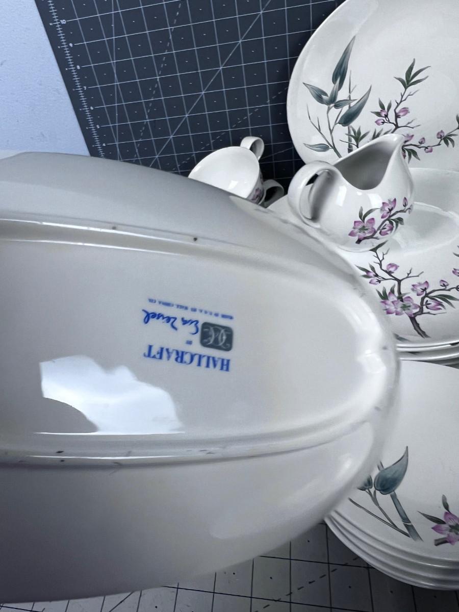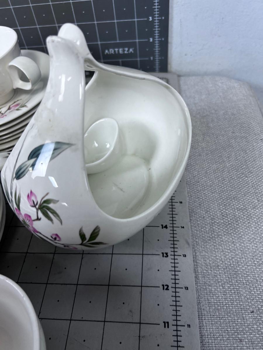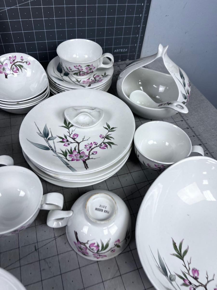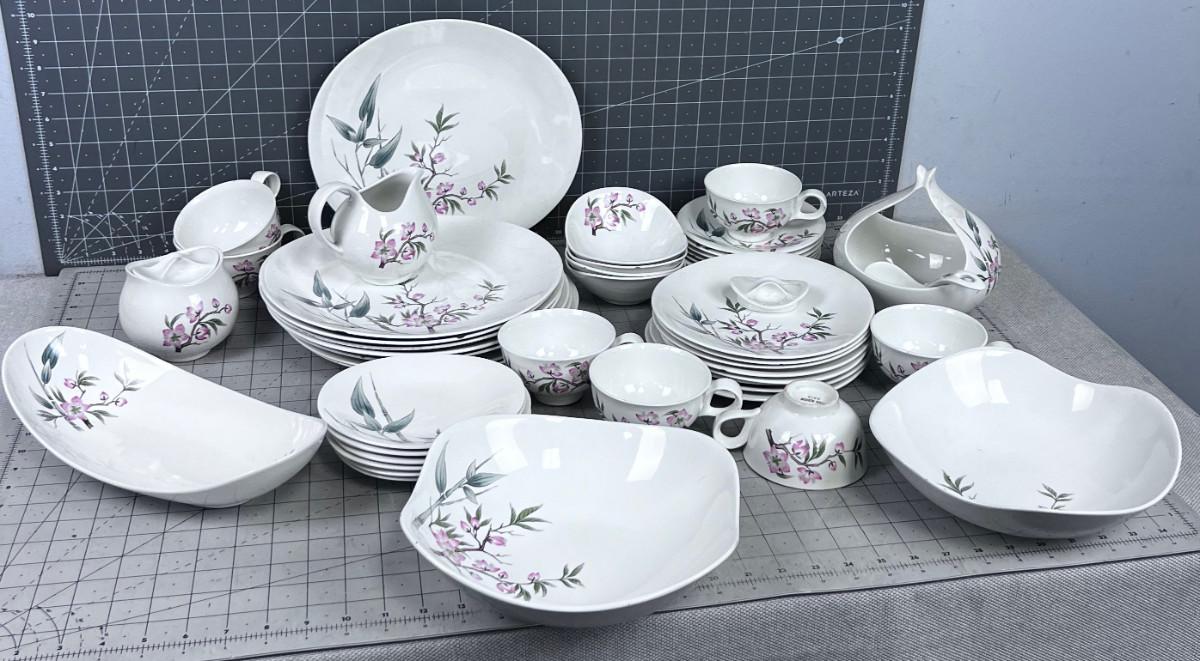 Several pieces have chips or damage. However this is a really great set of China. Some Pieces missing. What you see is what you get. Patter Peach Blossom.