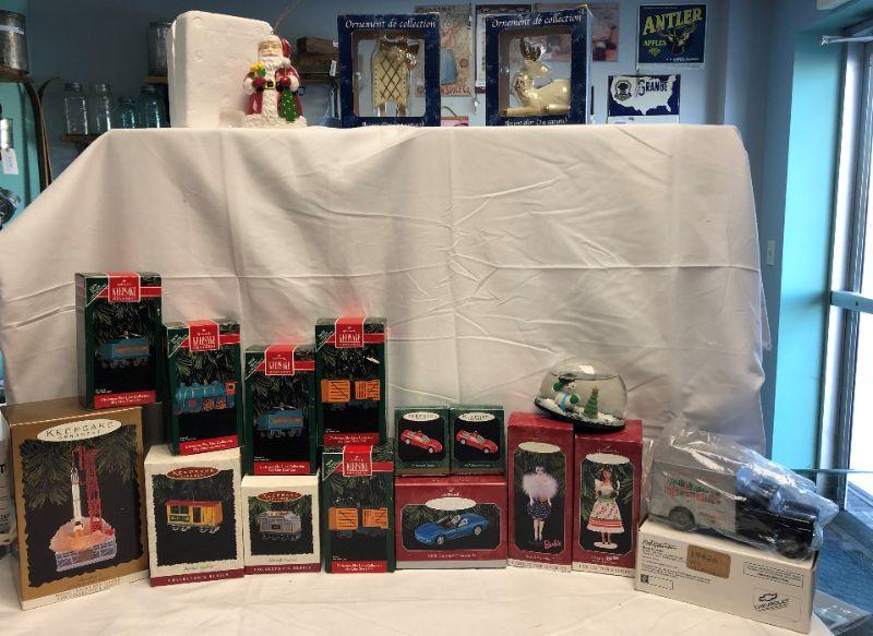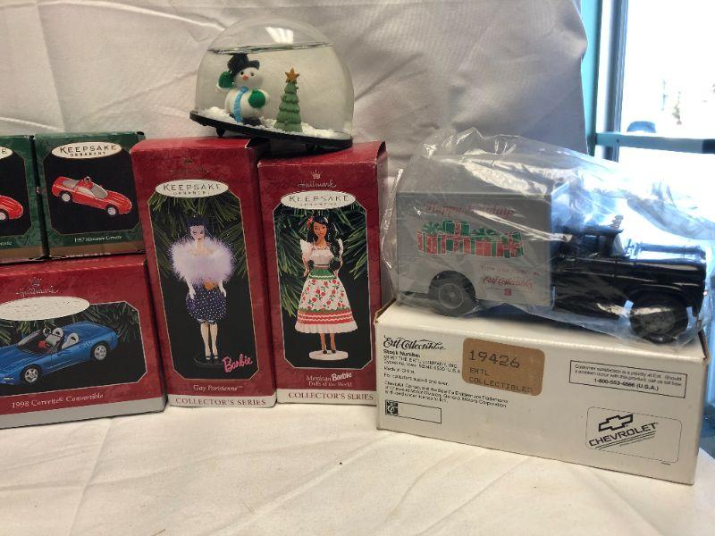 ALL items in lot are in excellent condition. Hallmark Keep Sake Ornaments, Cars, Trains, Barbie Dolls, ERTL Christmas Van, Great Holiday Grouping, All Items are NEW in their Original Packaging. ALL fragile items. No chips or cracks in any items. Item(s) are Sold as is - Photo's are part of the Description - Shipping is available or Pickup by Appointment. Lot Only Includes the 16 Ornaments Truck and Snow Globe, Not What Appears in Background Wall