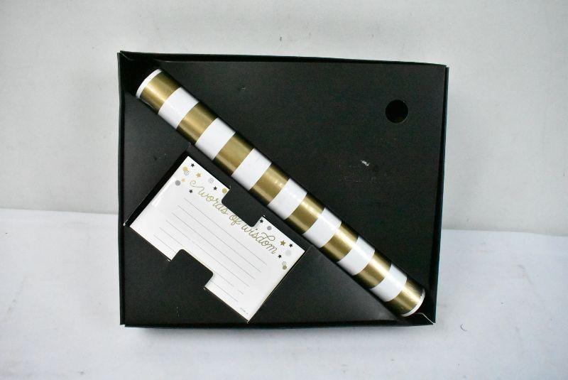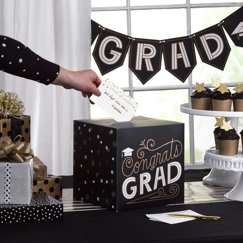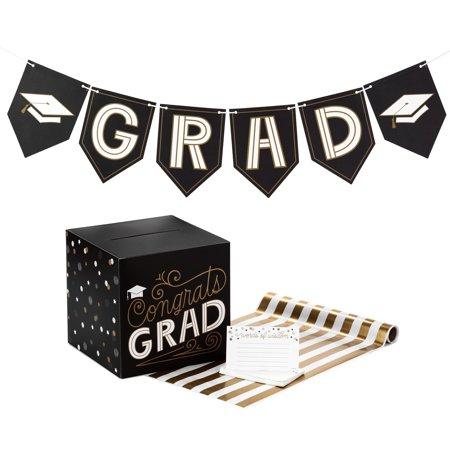 Hallmark Graduation Party Kit, Black and Gold: Banner, Table Runner, Card Box, 25 Advice Cards - New, Open Box