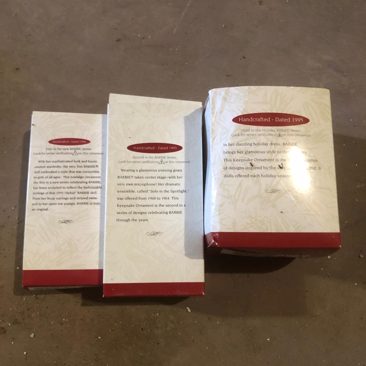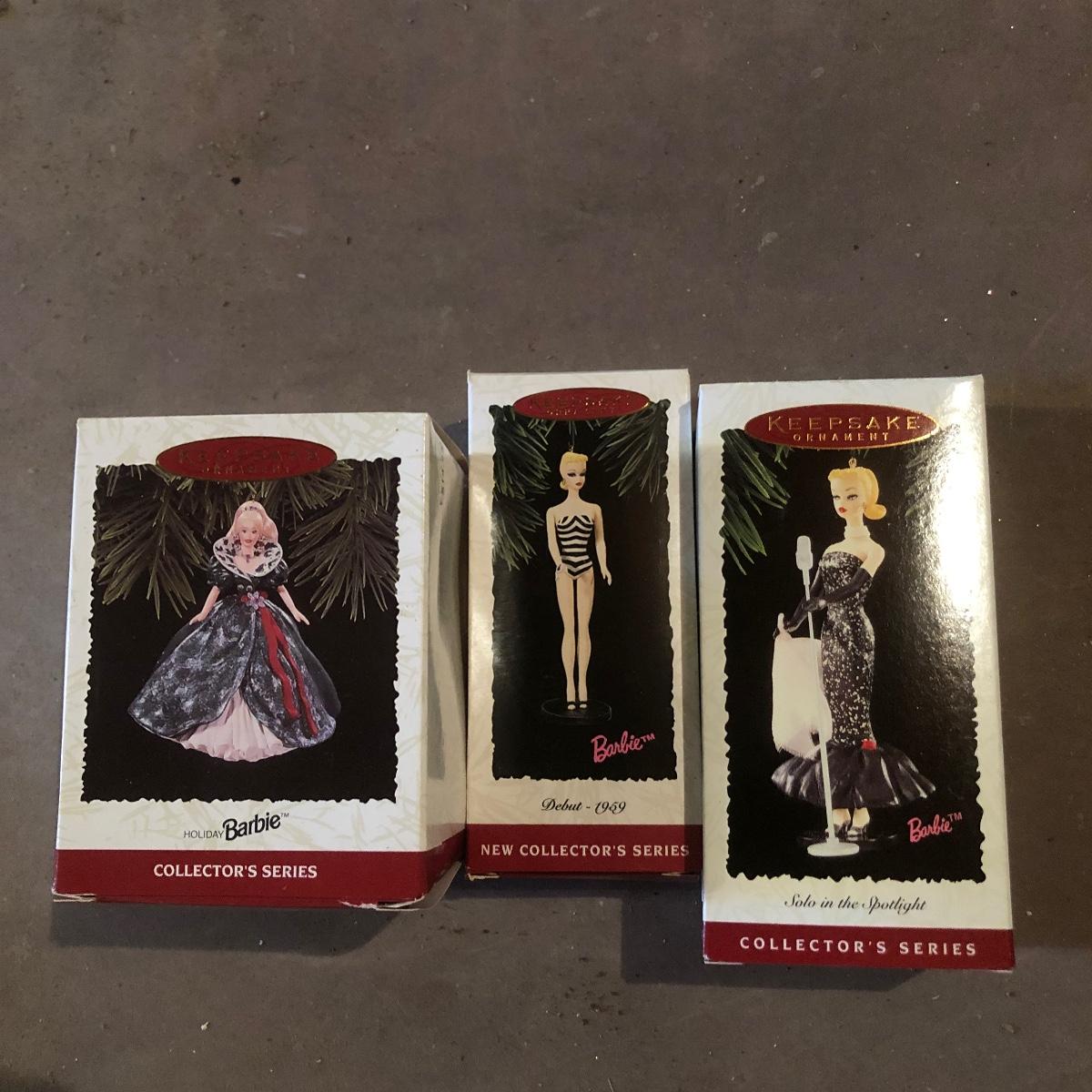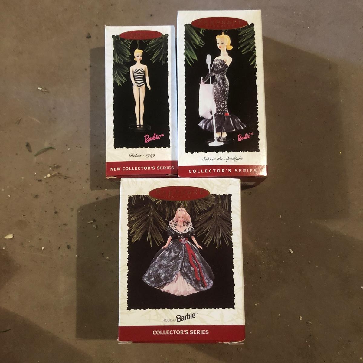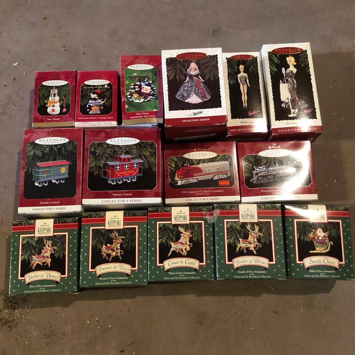 Hallmark Keepsake boxed ornaments includes five piece set of Santa and his Reindeer Collection, three Barbies, two Lionel trains, two train cars, and three animal ornaments. All appear to be NIB. The tallest ornament measures 4” tall.