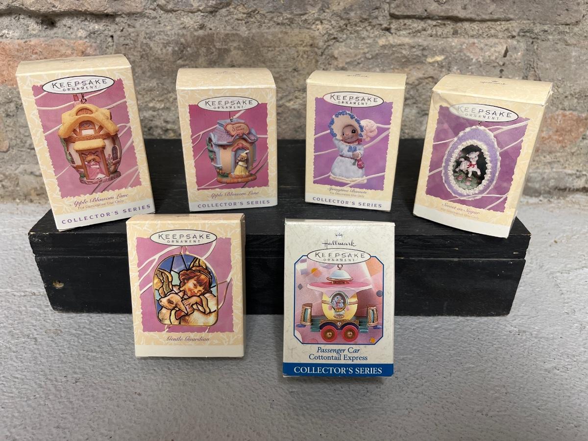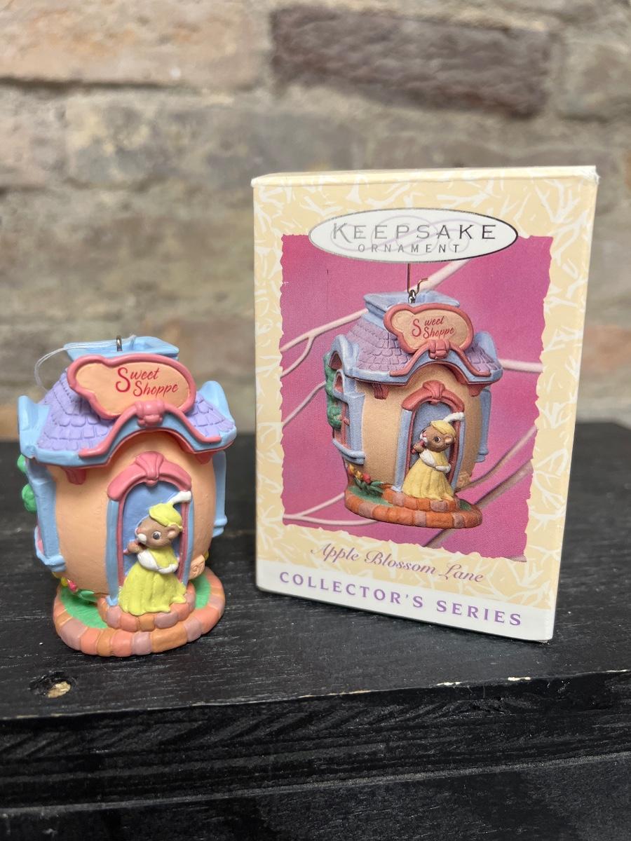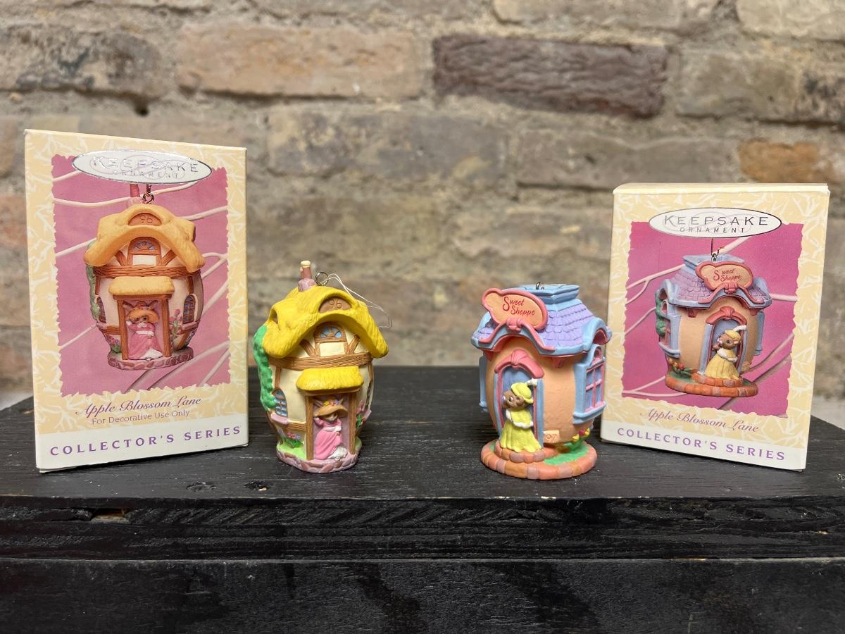 Two Apple Blossom Lane ornaments, Springtime Bonnets, Sweet as Sugar, Passenger Car from Cottontail Express, and Gentle Guardian