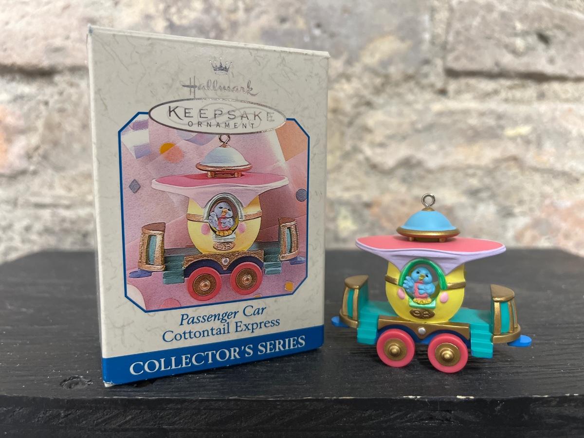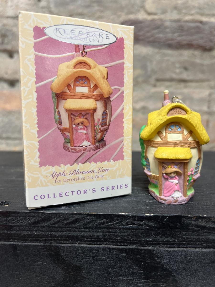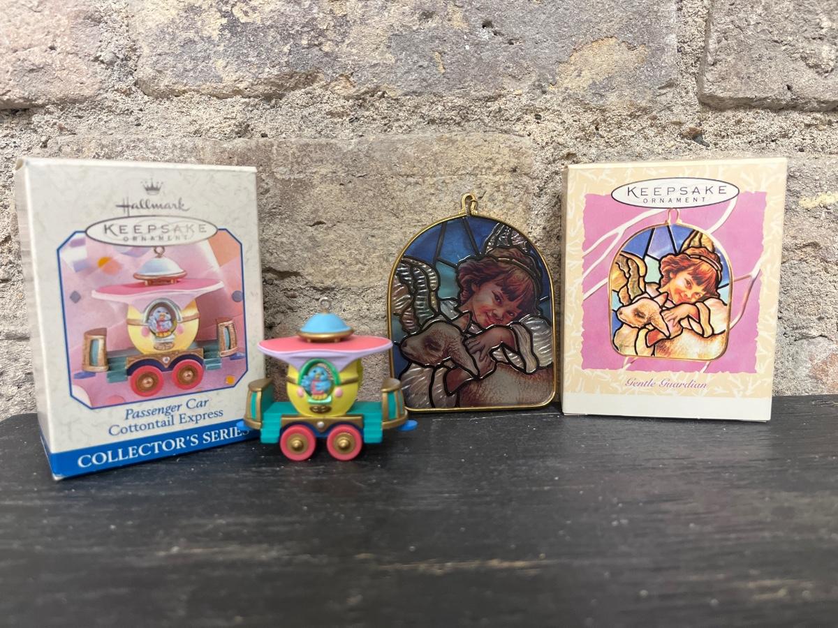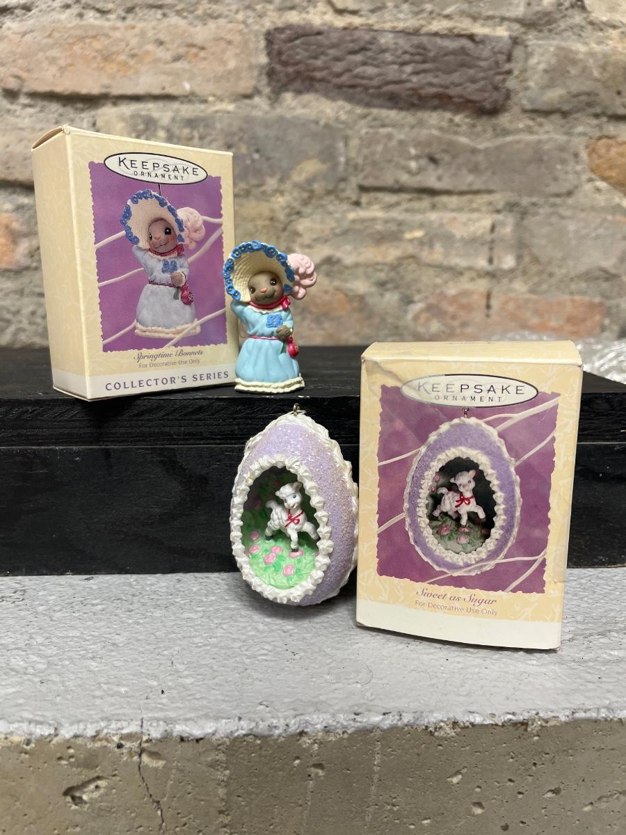 Two Apple Blossom Lane ornaments, Springtime Bonnets, Sweet as Sugar, Passenger Car from Cottontail Express, and Gentle Guardian